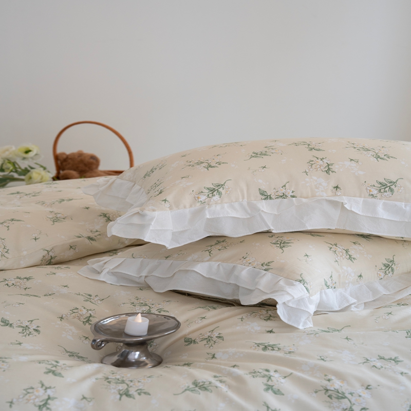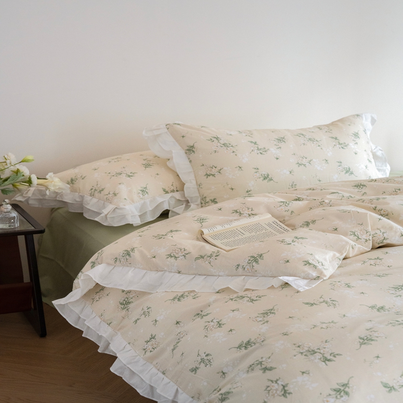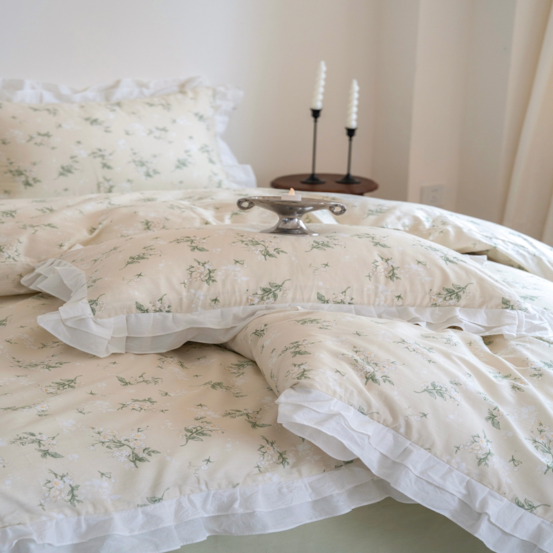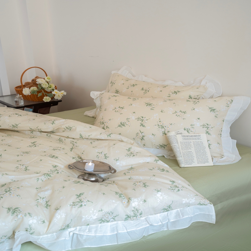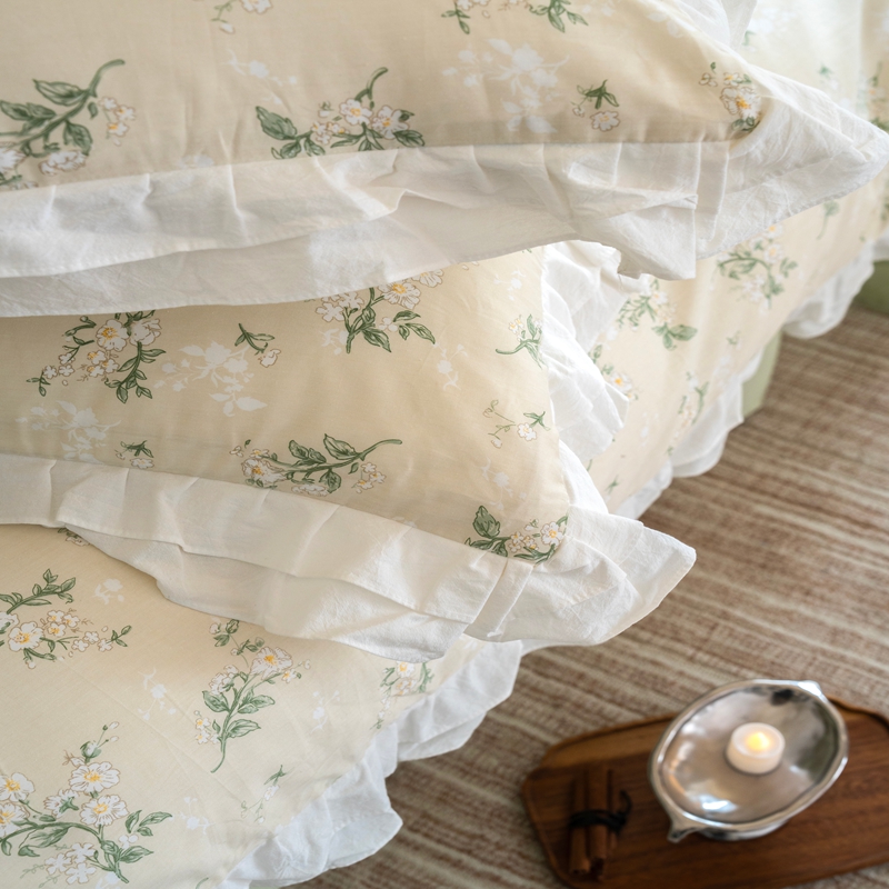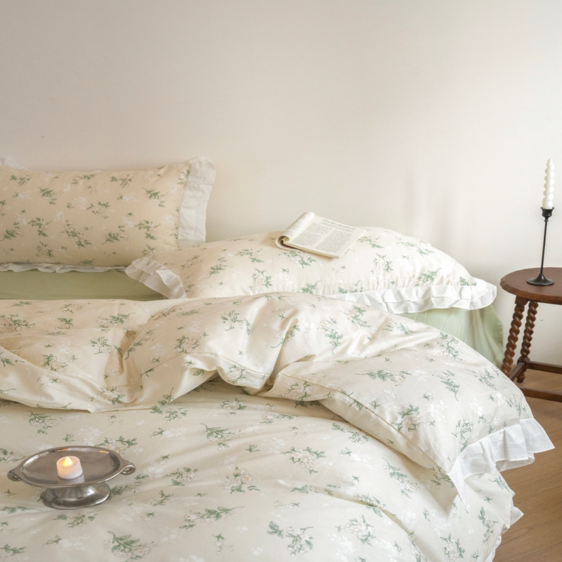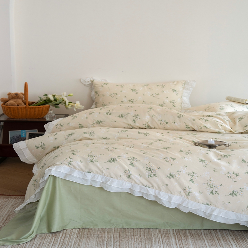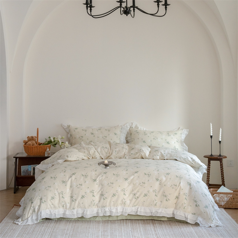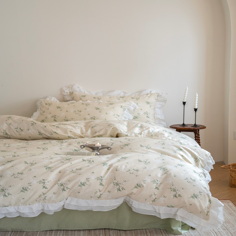 商品名称:尺素 2025新款全棉碎花韩式花边款纯棉四件套纯色加大床单1.8床笠法式大花边被套枕套 花边款绿栀-水绿