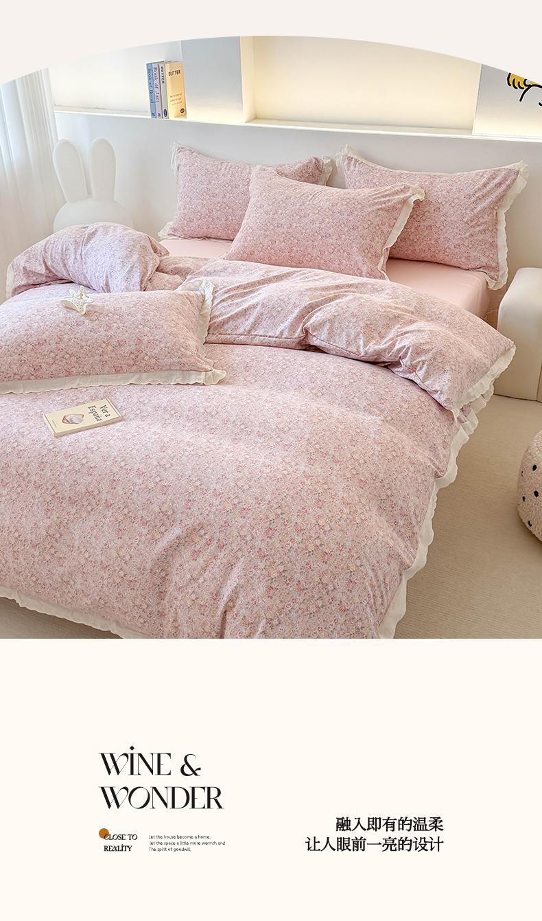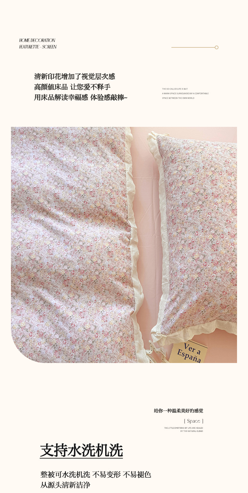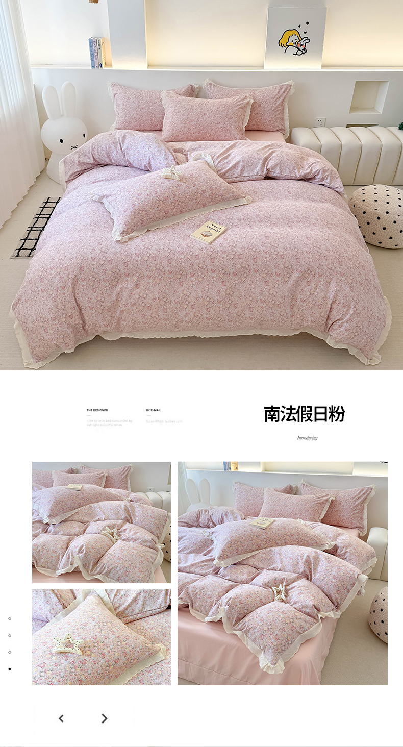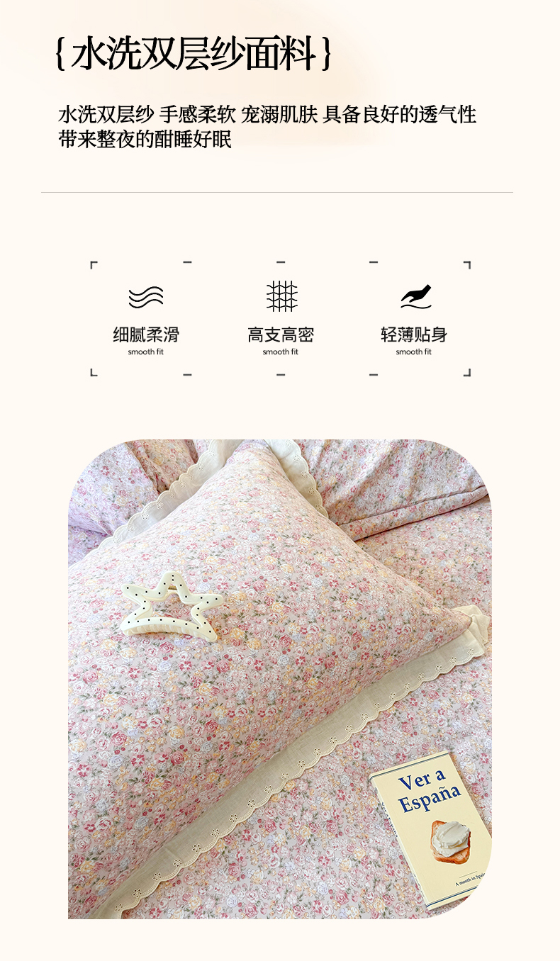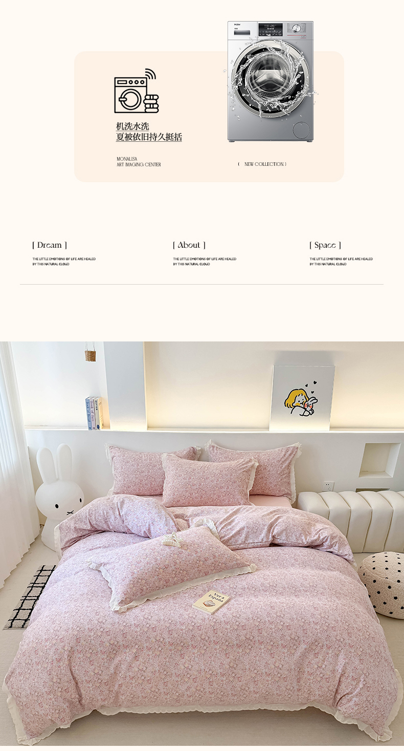 商品名称:吾欢心 2025新款韩版花边水洗双层纱四件套夏被四件套(棚拍图) 南法假日粉