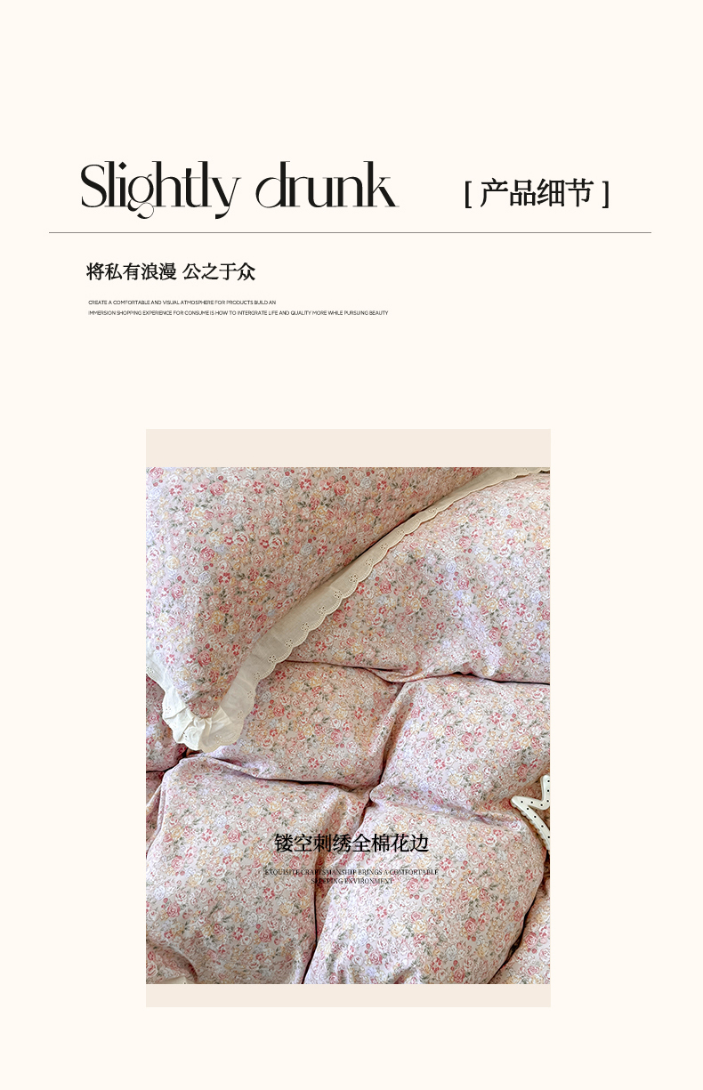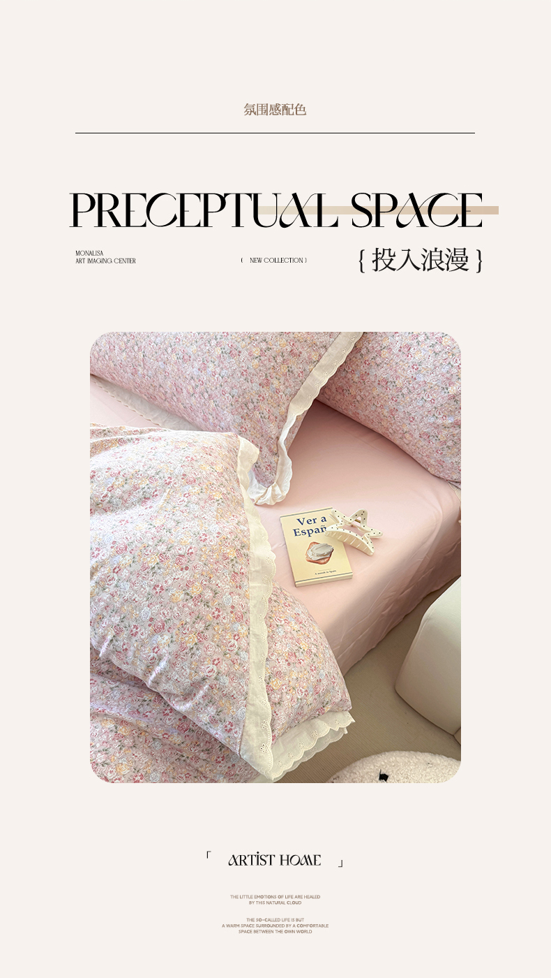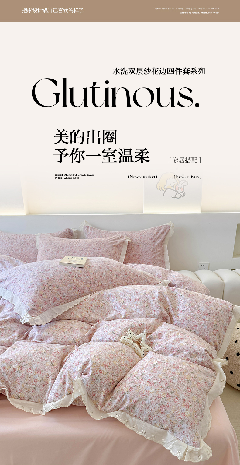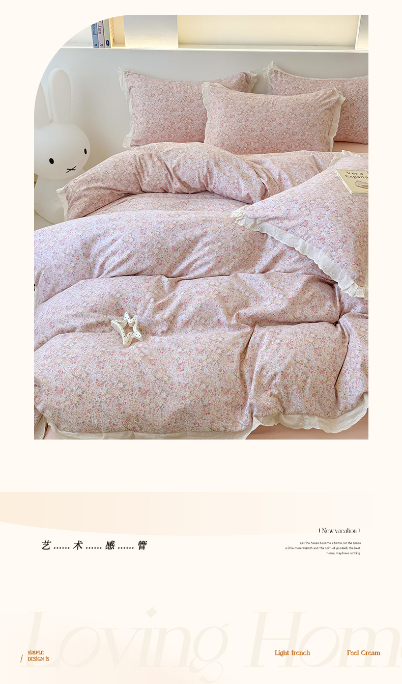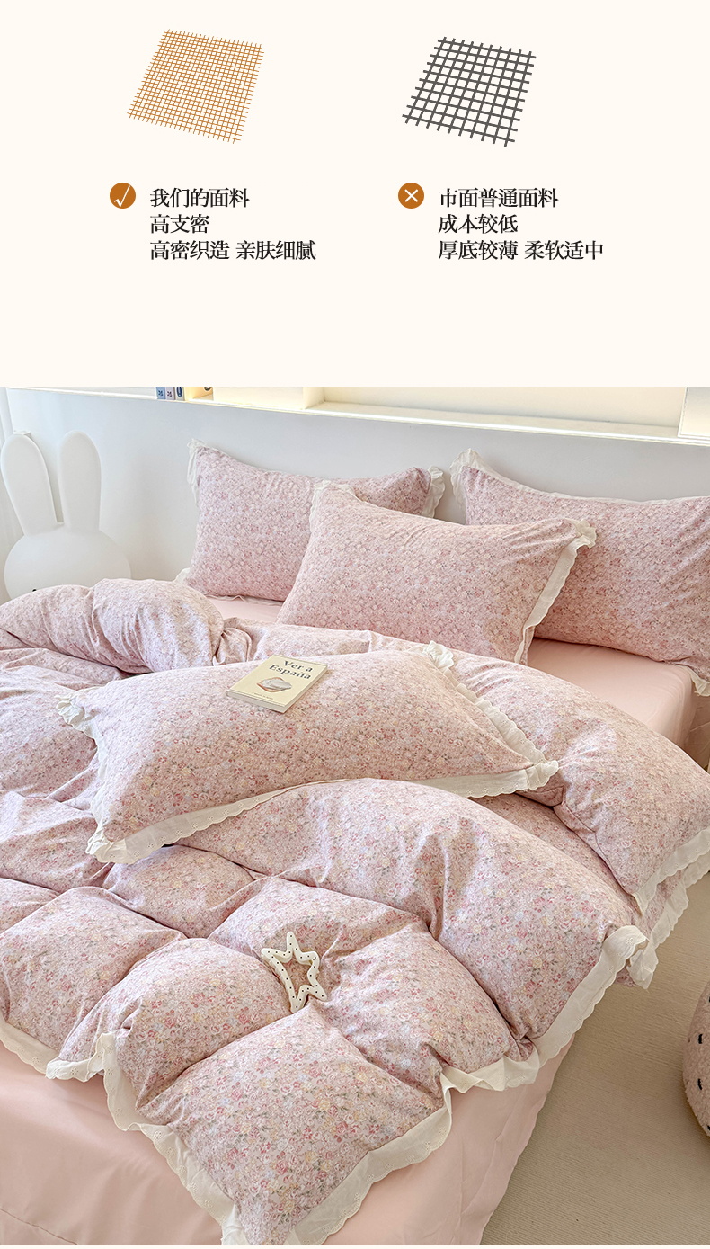 商品名称:吾欢心 2025新款韩版花边水洗双层纱四件套夏被四件套(棚拍图) 南法假日粉