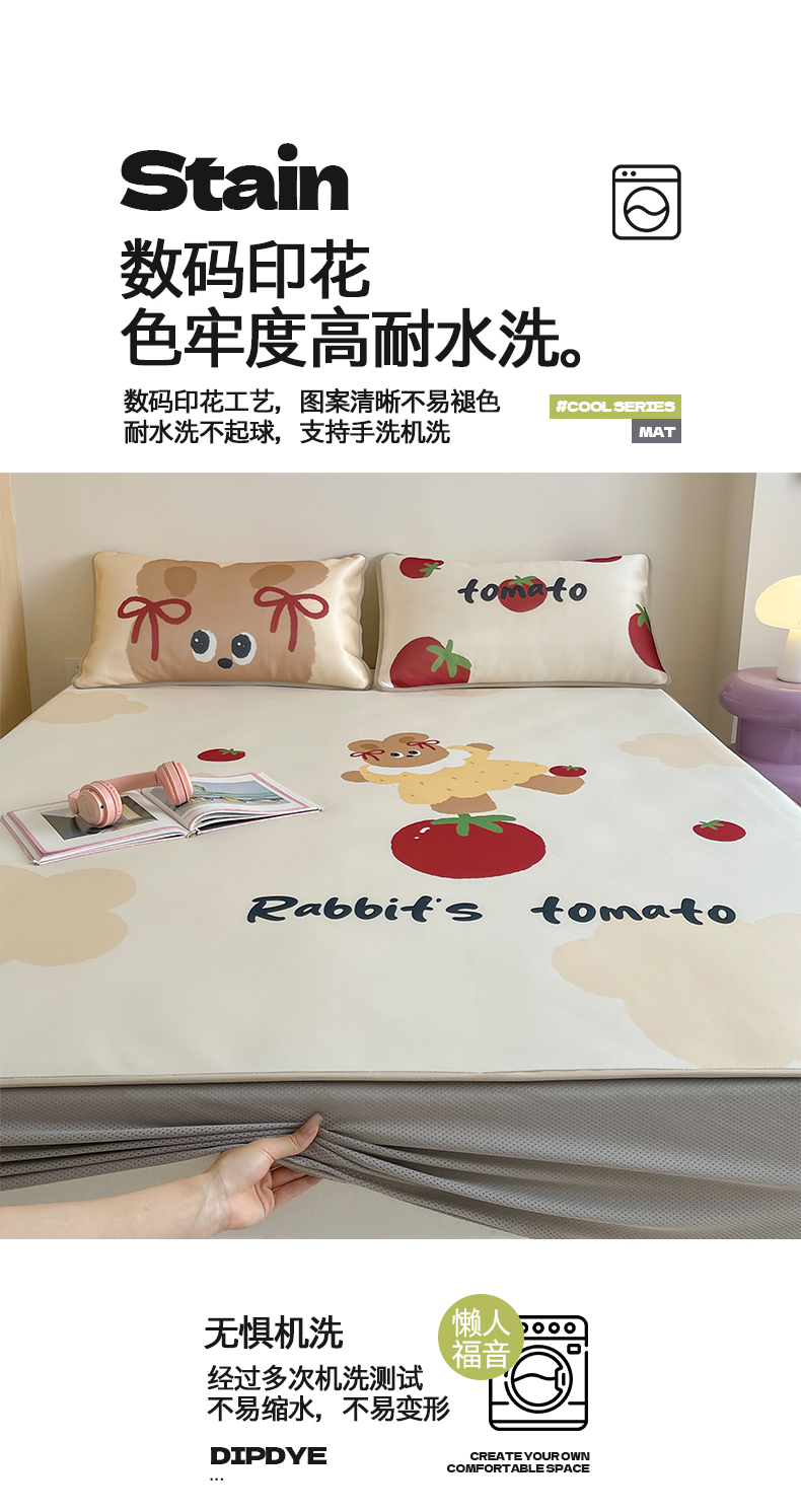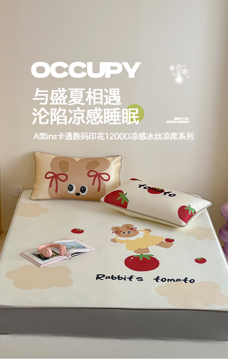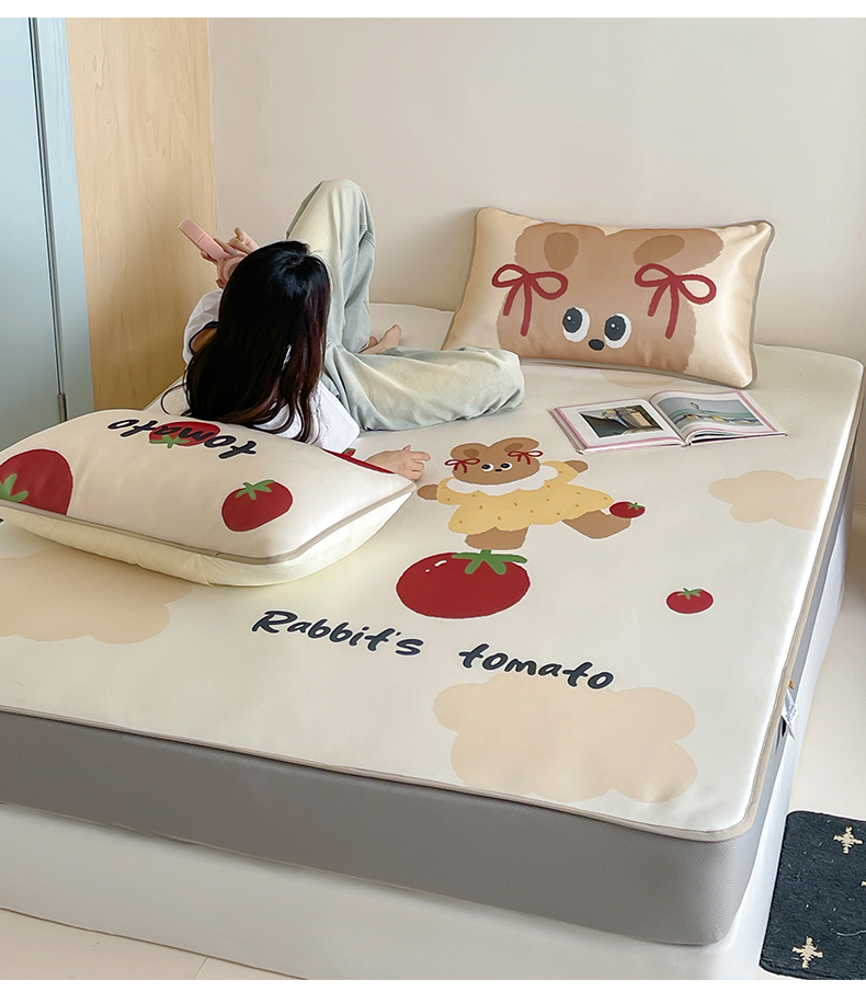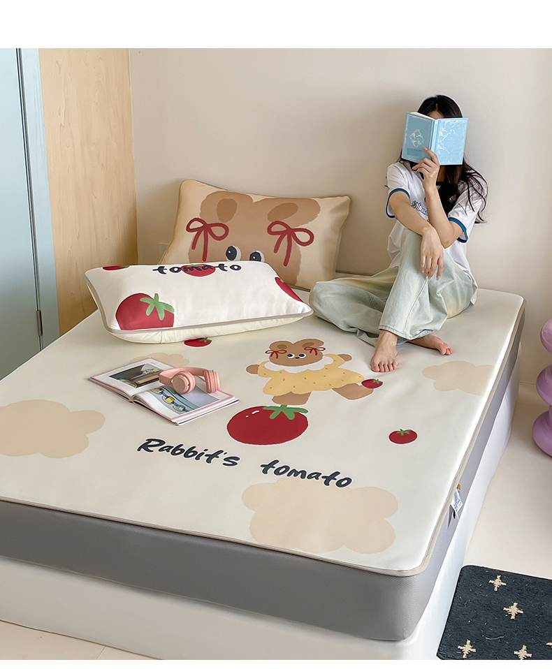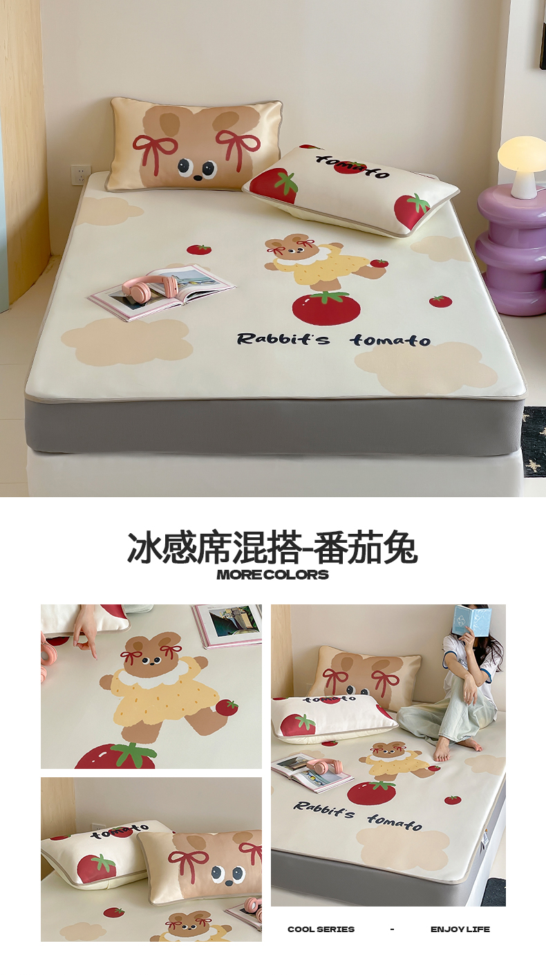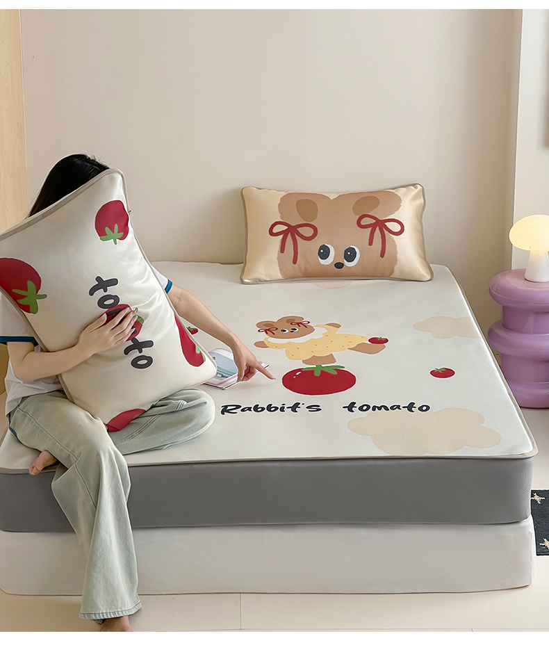 当前位置: 91家纺网 > 商品网购 > 床品套件 > 三件套 > 桃子家居 2025新款A类ins卡通数码印花1200D冰感冰丝凉席系列 冰感席混搭-番茄兔