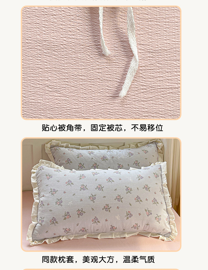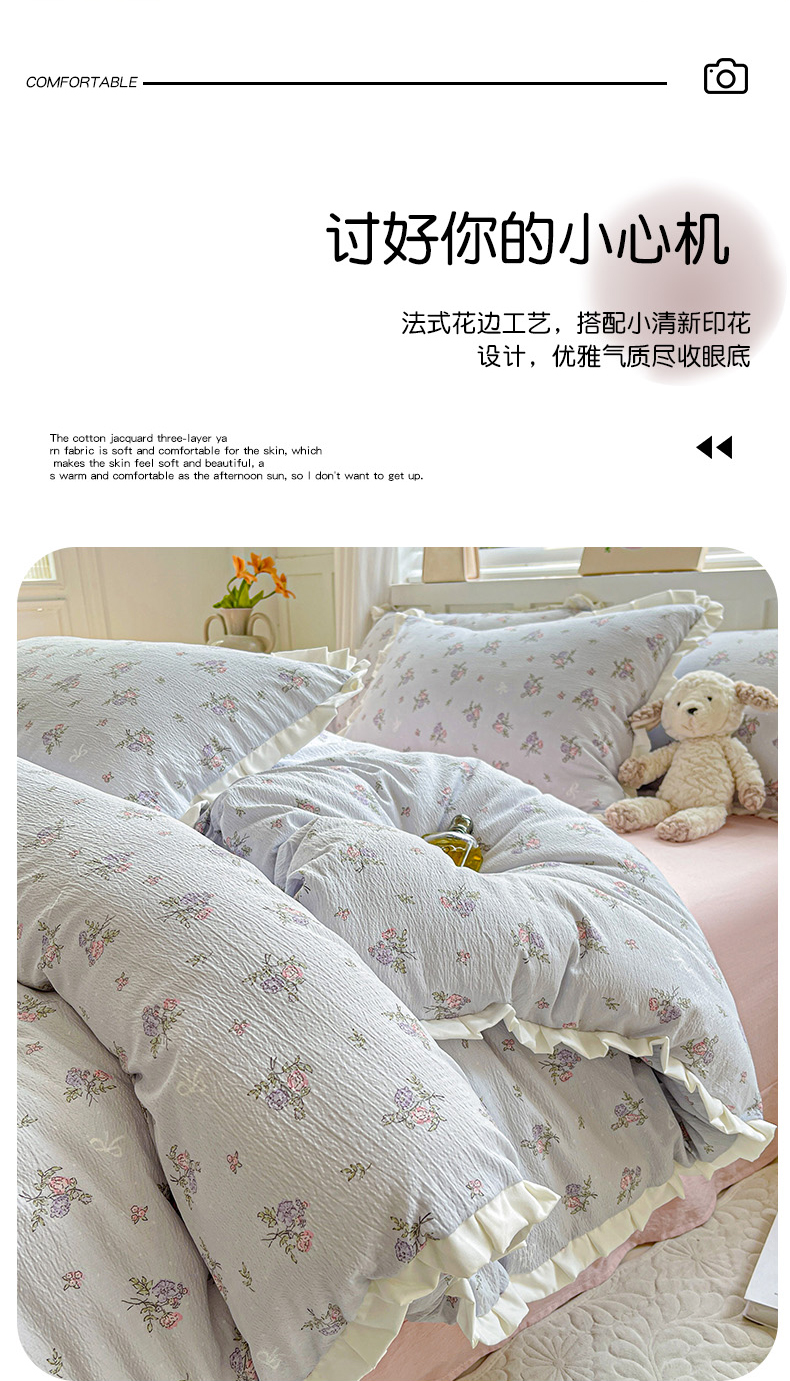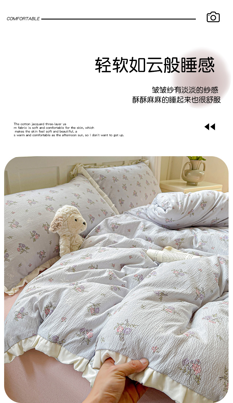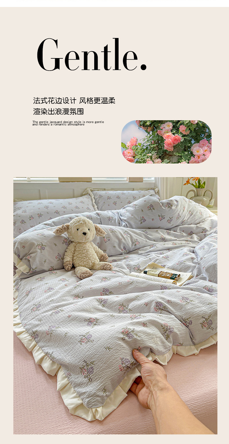 当前位置: 91家纺网 > 商品网购 > 床品套件 > 四件套 > 其它四件套 > 暖芯优选 2025新款直播热款赫本风花边款针织法式印花吊边床单三件套床笠四件套 蓝铃