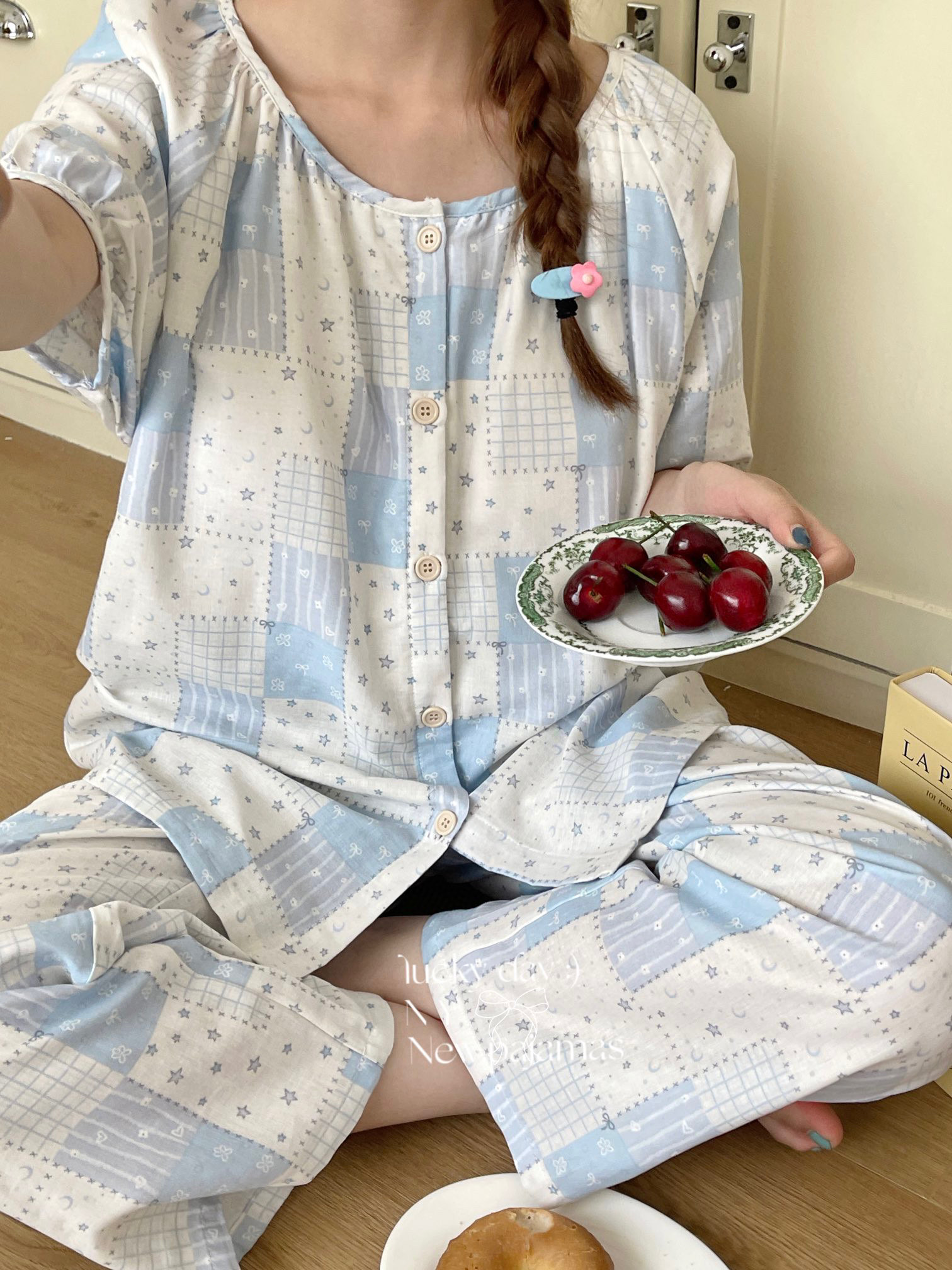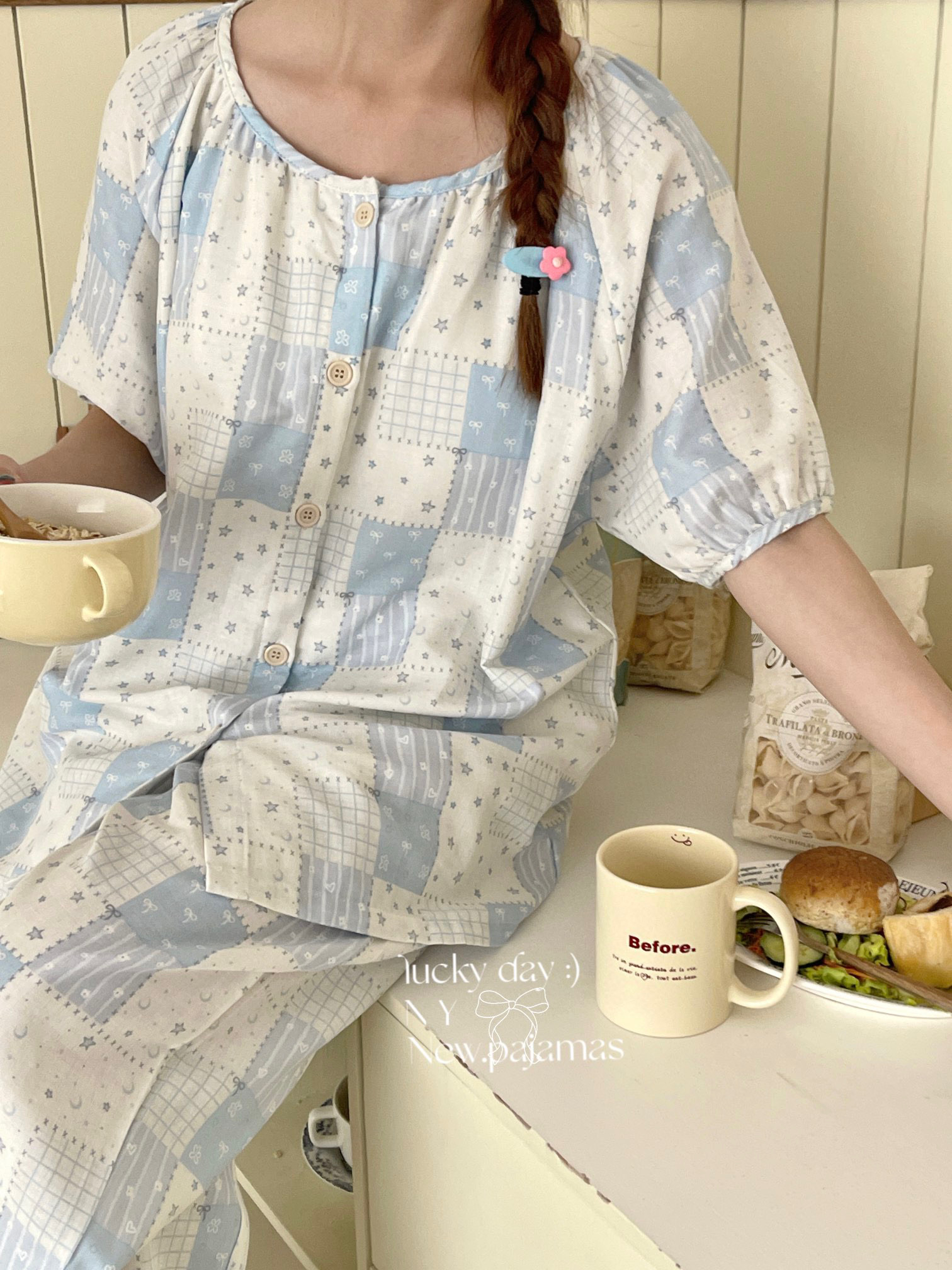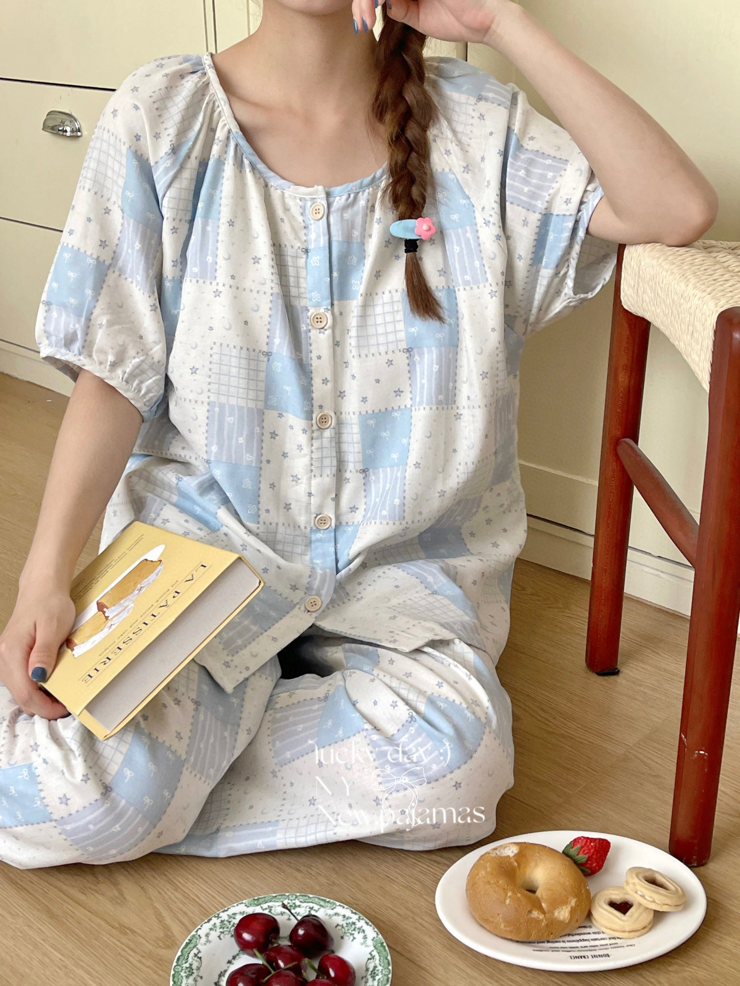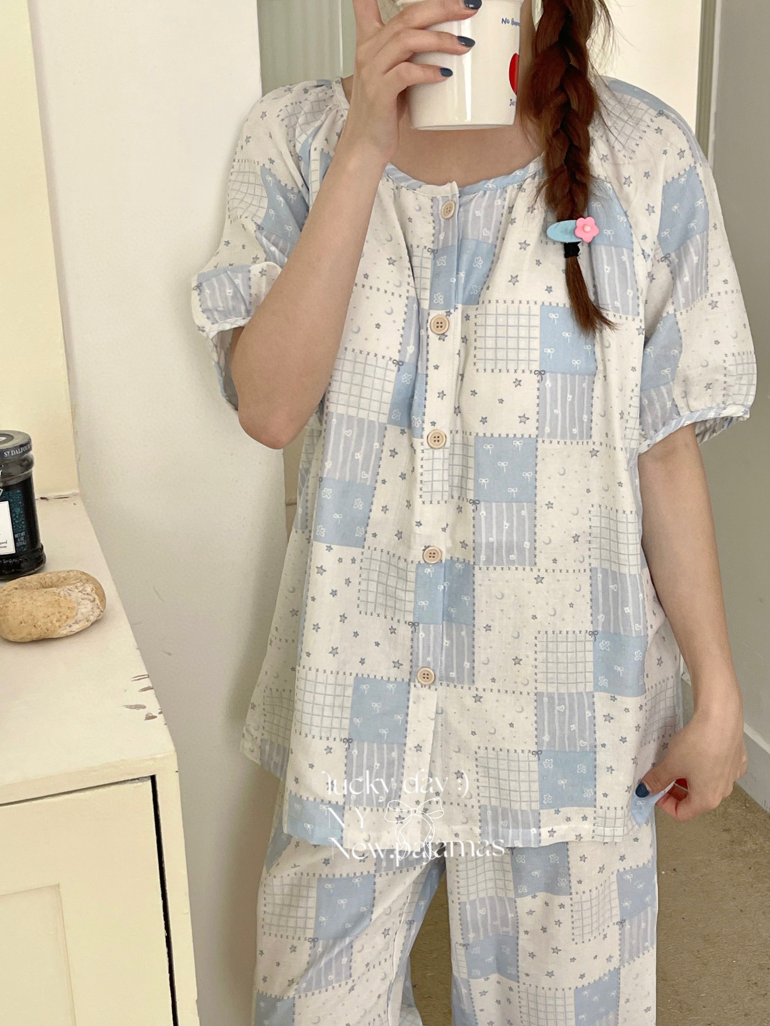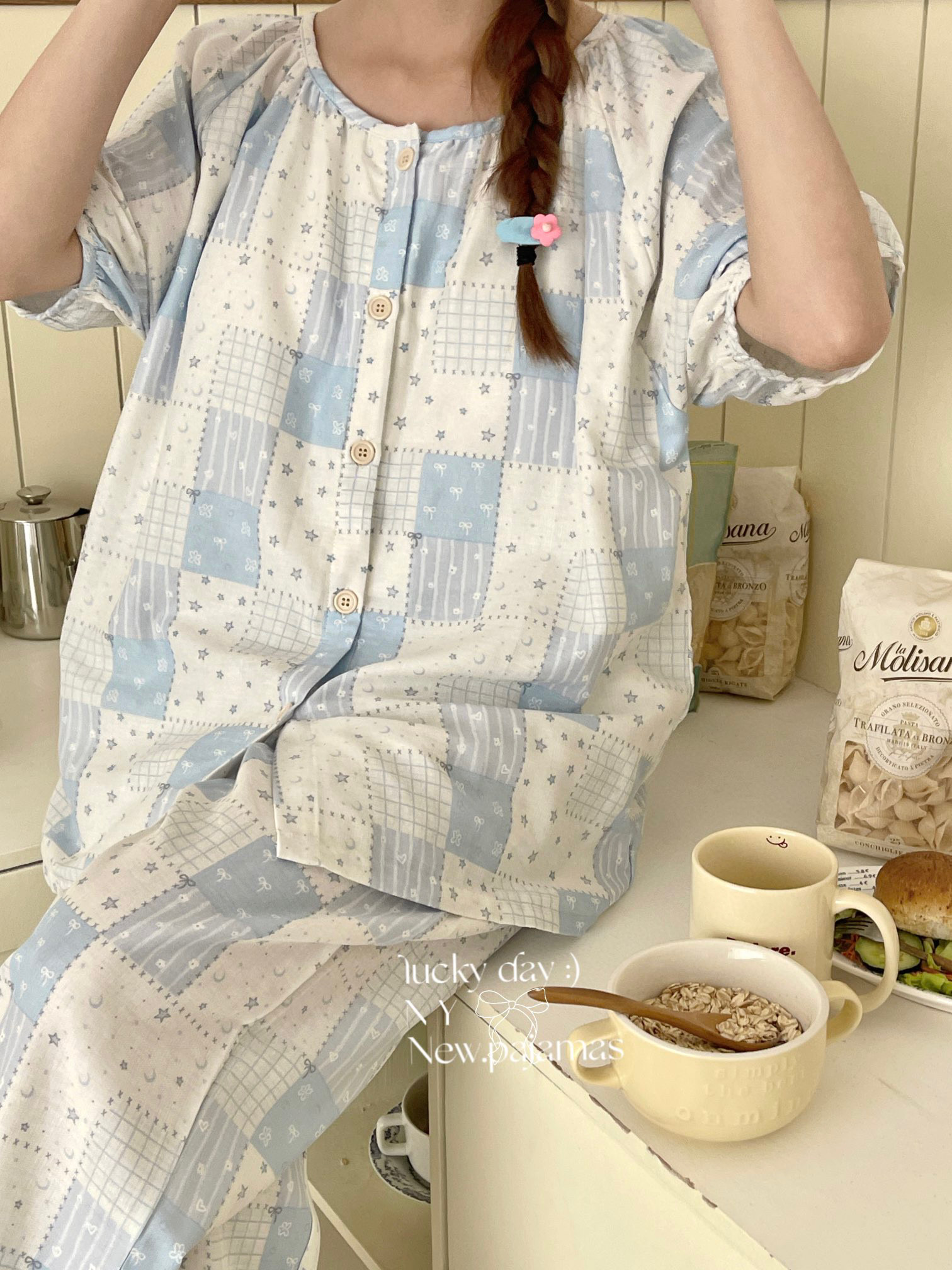 当前位置: 91家纺网 > 商品网购 > 居家日用 > 睡衣/家居服套装 > 纽约生活 有氧纱韩系家居服圆领短袖长裤自带胸垫套装 星空蓝