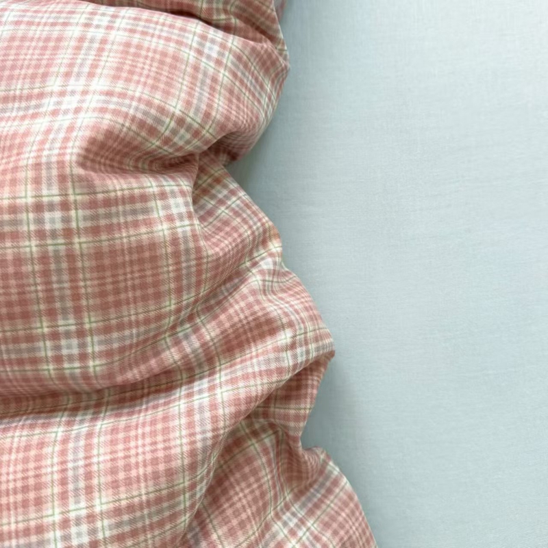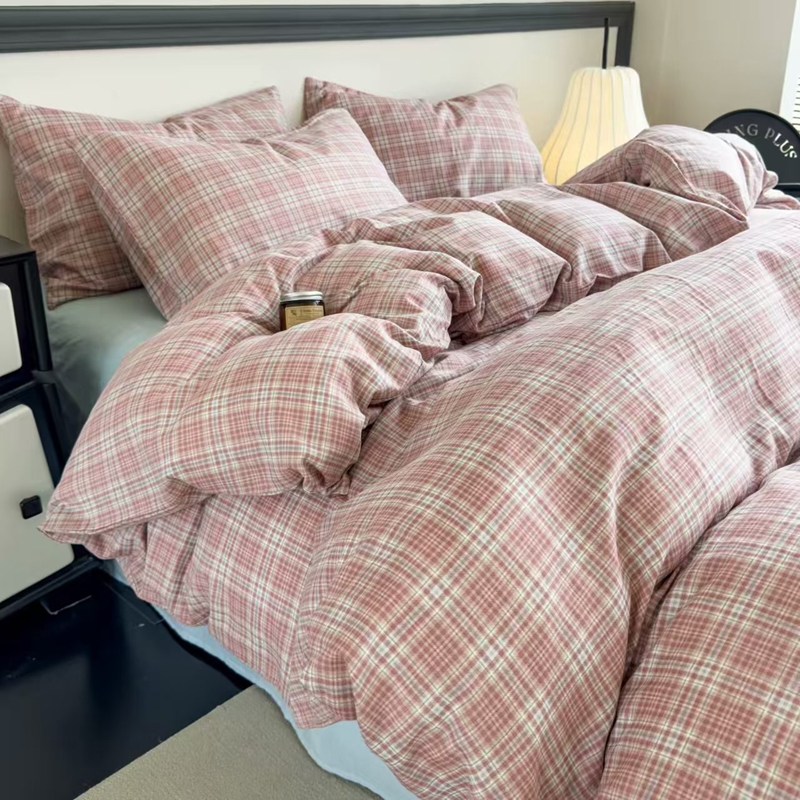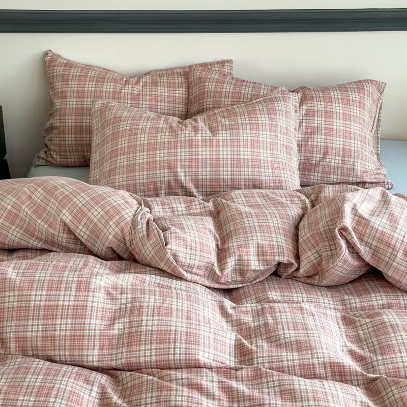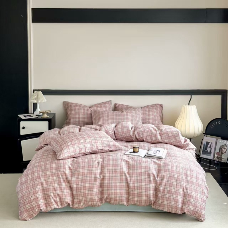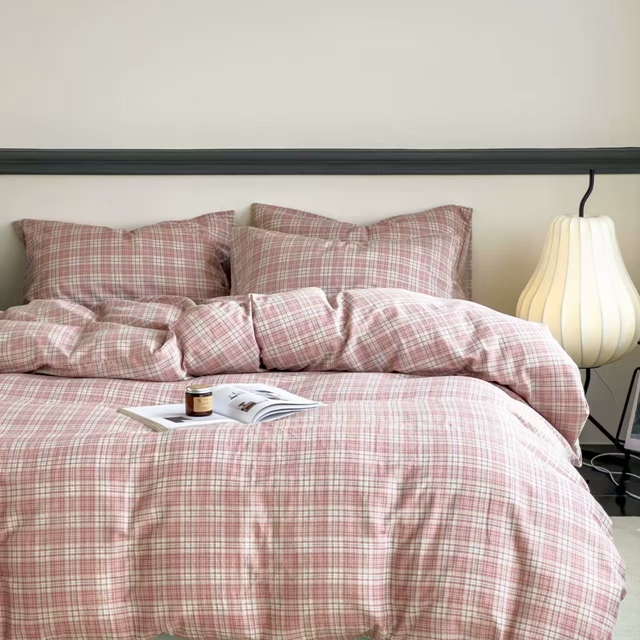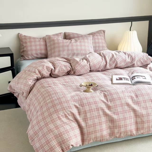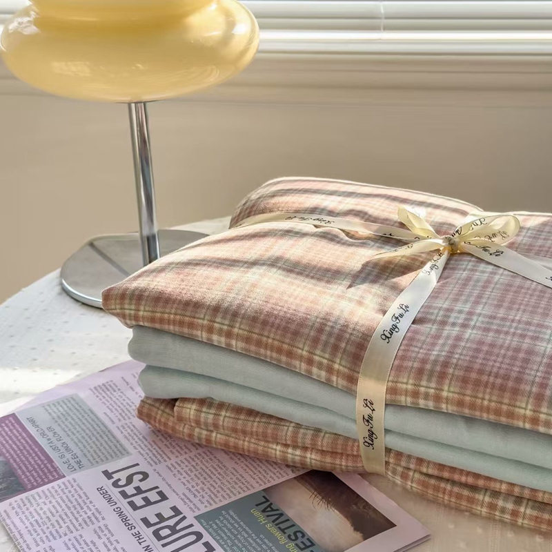栩裕纺织 2025新款全棉双层纱四件套 奶油粉格