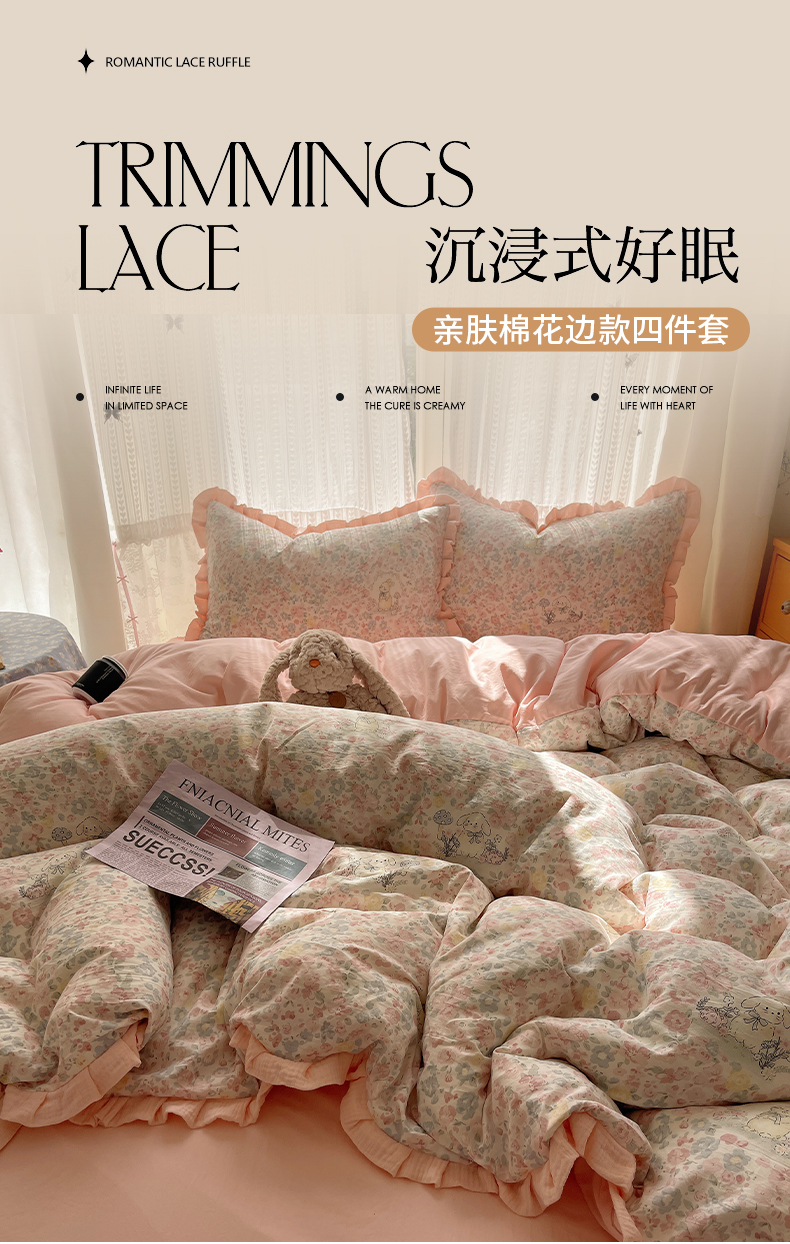 (总)繁花家居 2025新款木耳边水洗棉双层纱针织棉韩式花边四件套