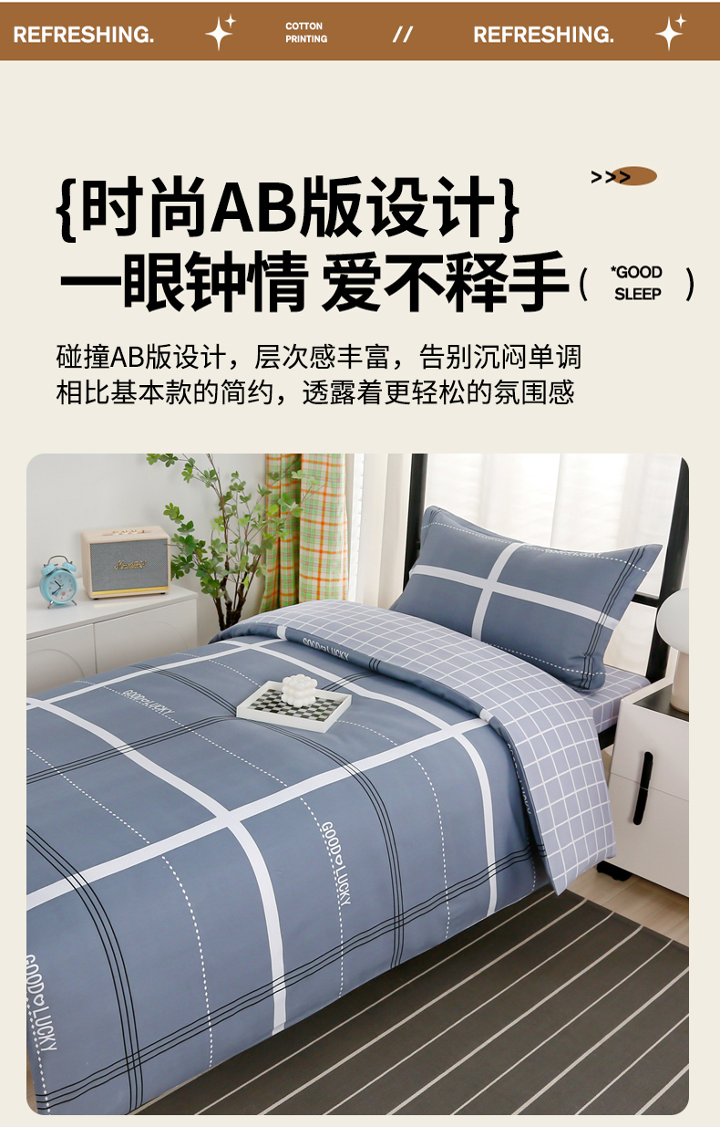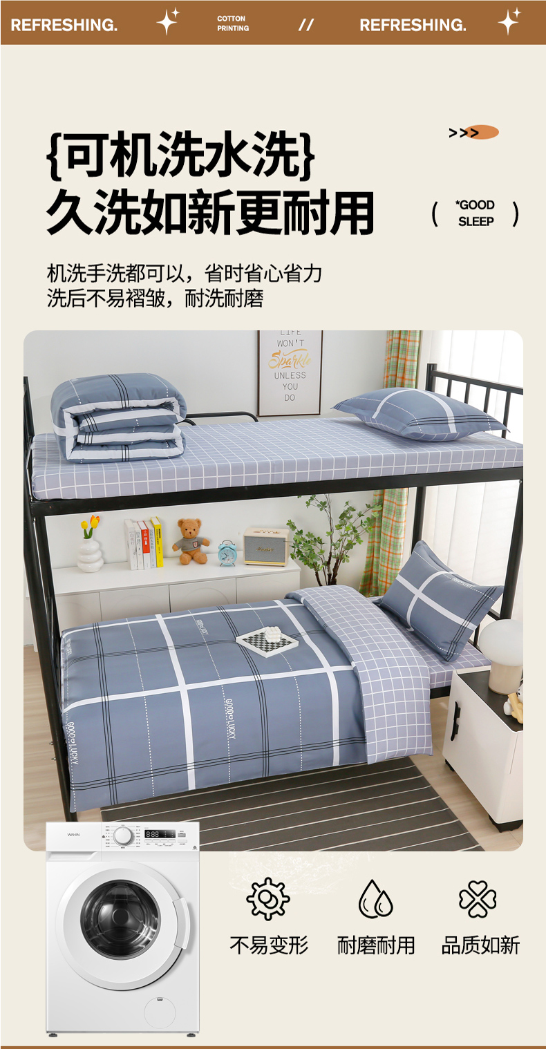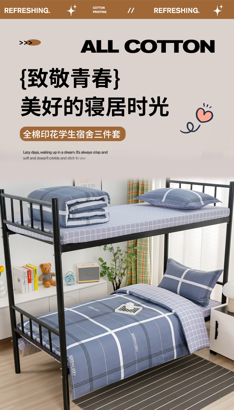当前位置: 91家纺网 > 商品网购 > 床品套件 > 多件套 > 多件套 > 乐旗家纺 2025新款A类AB版全棉环保印花学生上下铺宿舍三件套六件套 校园风格