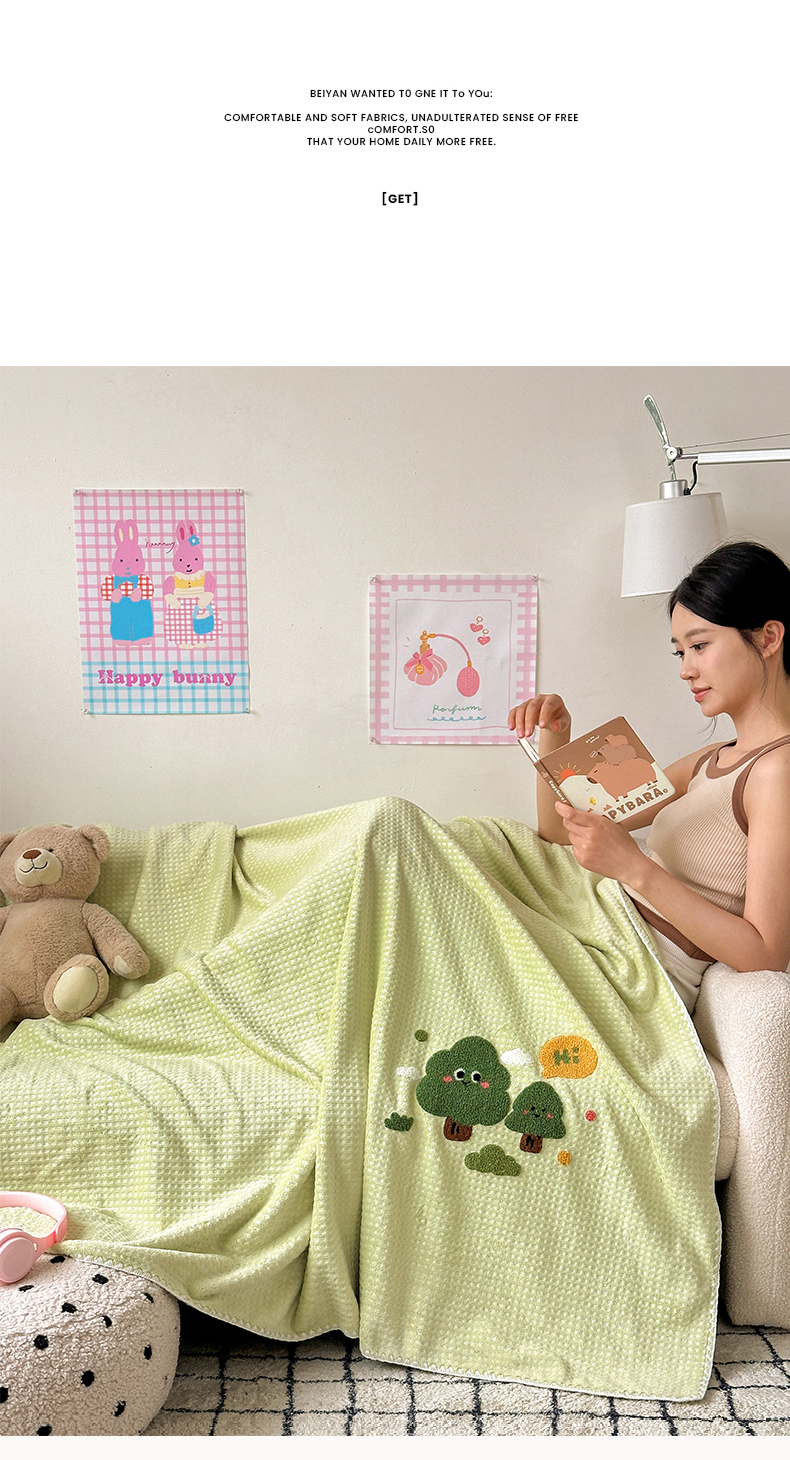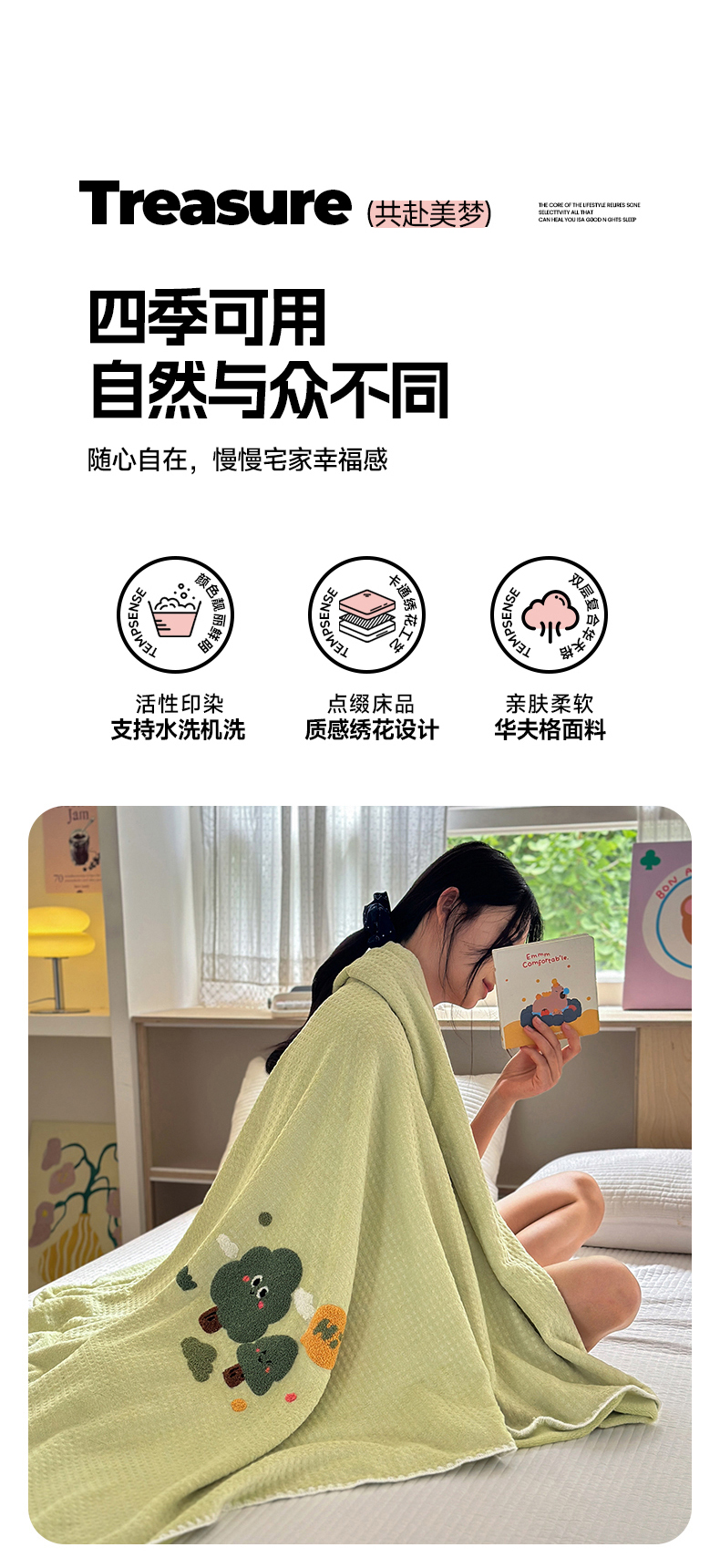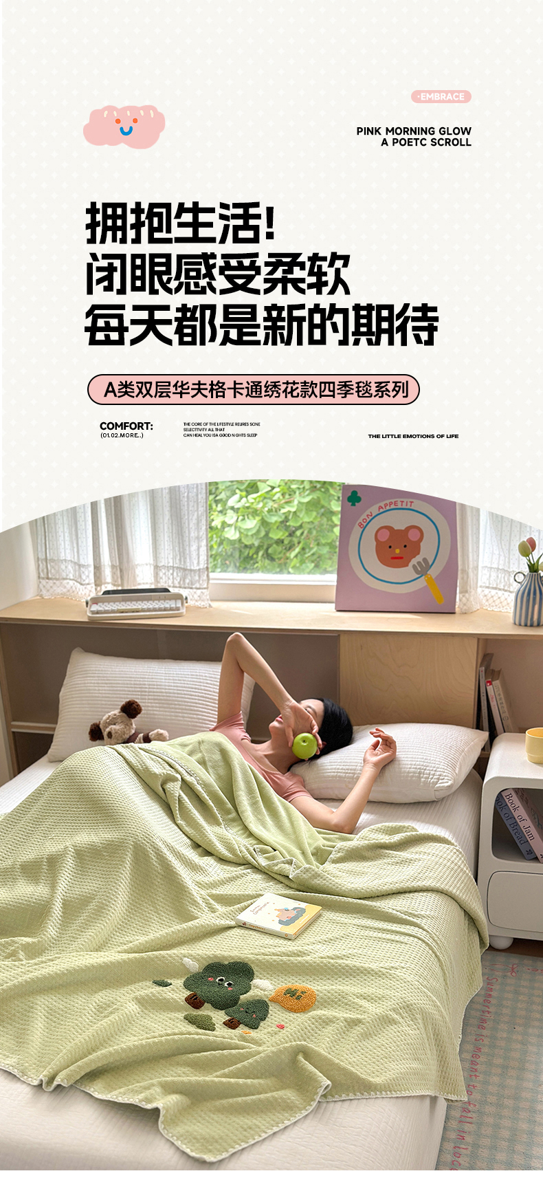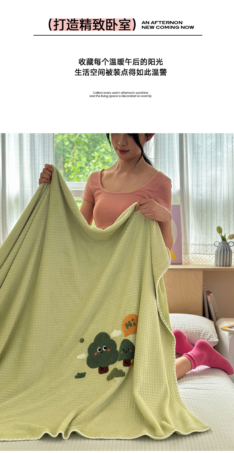 商品名称:艾佳2025新款卡通绣花款小华夫格毛毯毯子 华夫毯-绿森林