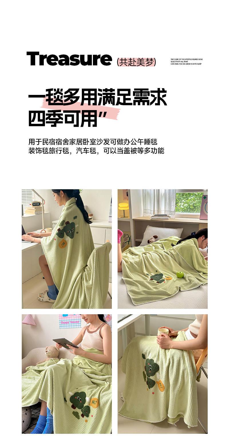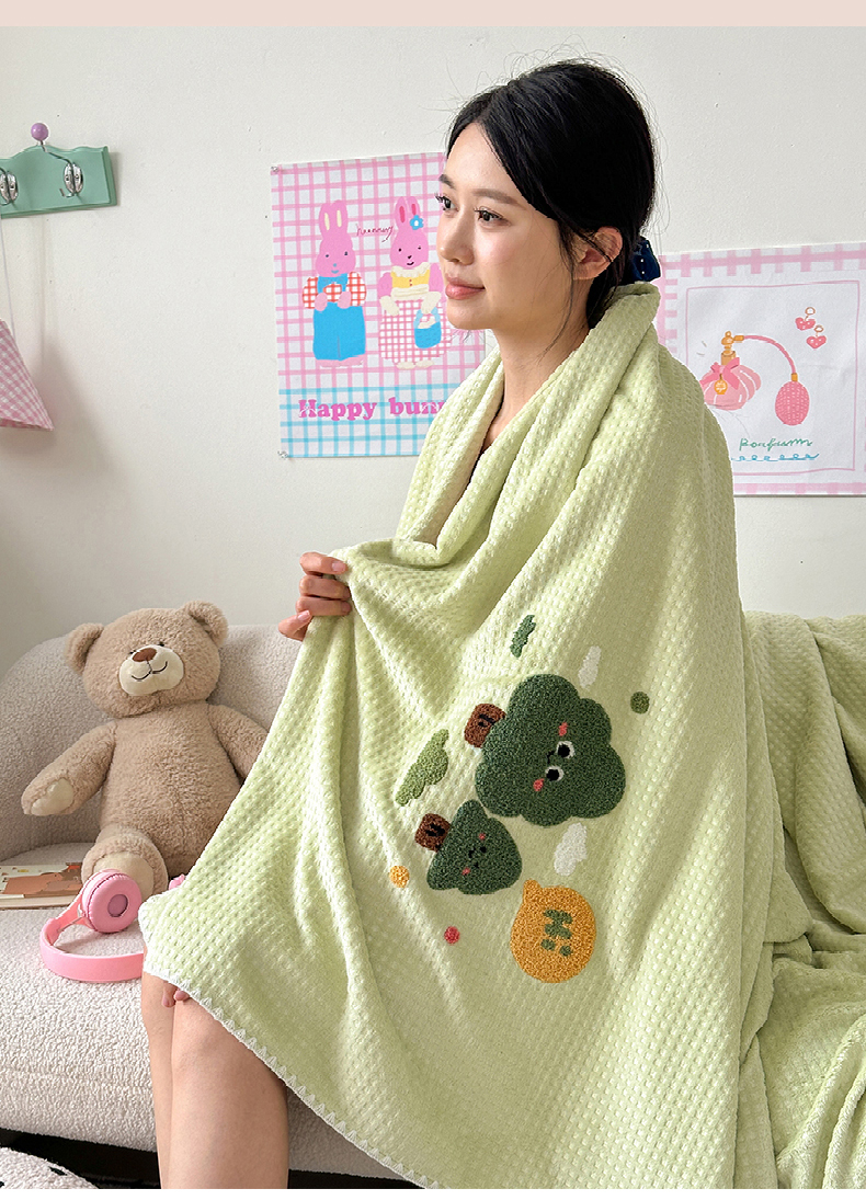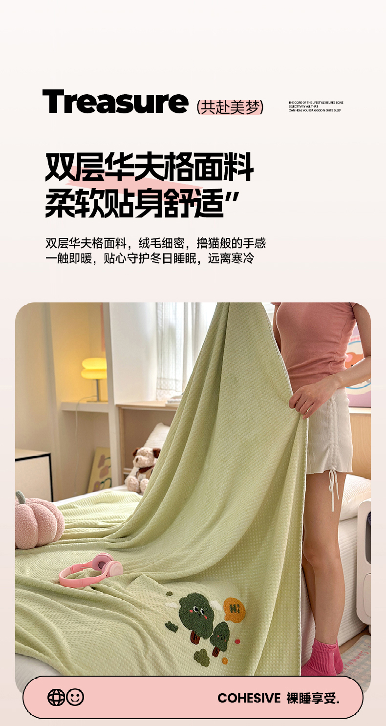 商品名称:艾佳2025新款卡通绣花款小华夫格毛毯毯子 华夫毯-绿森林