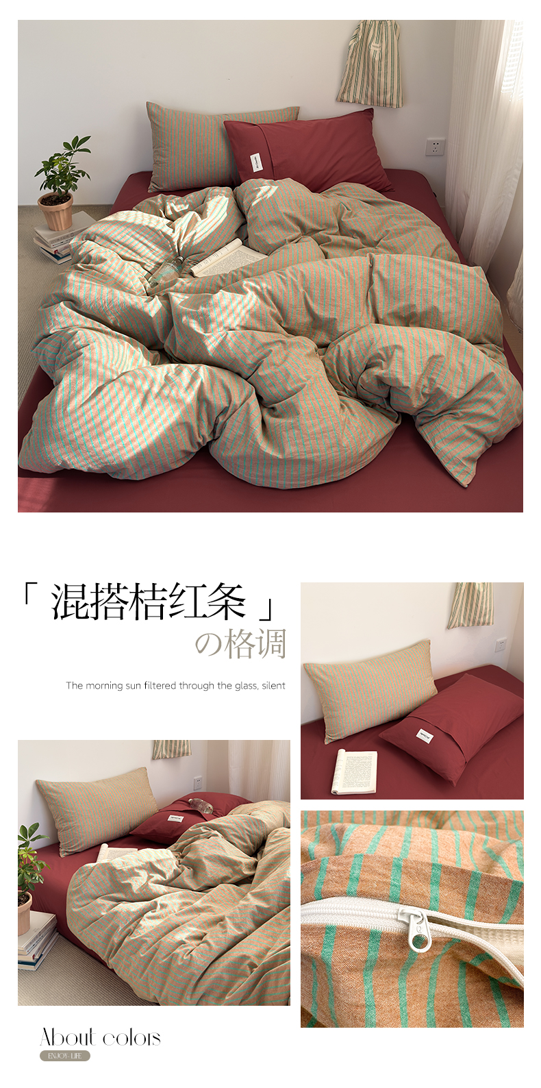 商品名称:玖弘家居 2025新款全棉纯棉水洗棉五色条纹混搭单被套 混搭桔红条