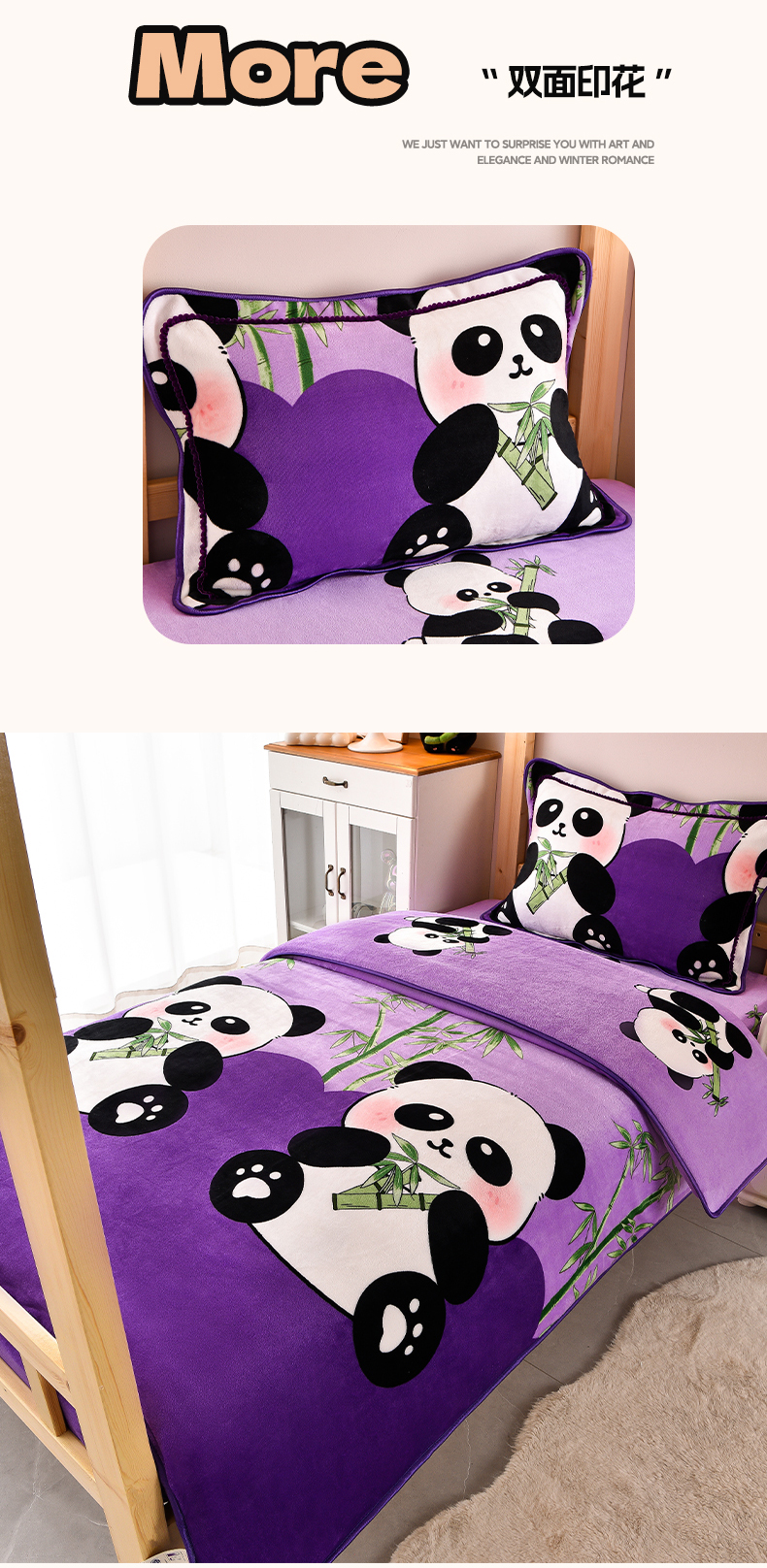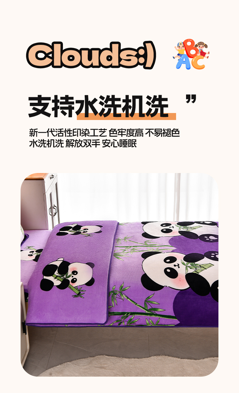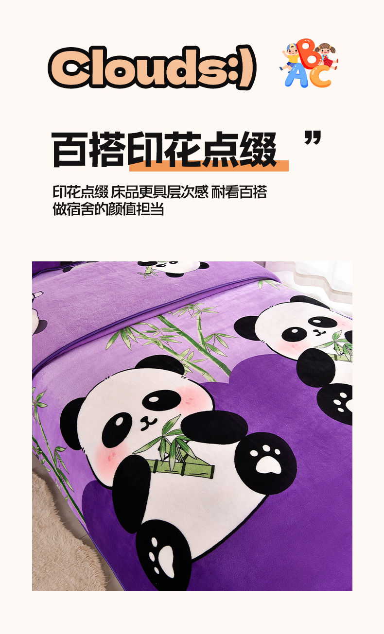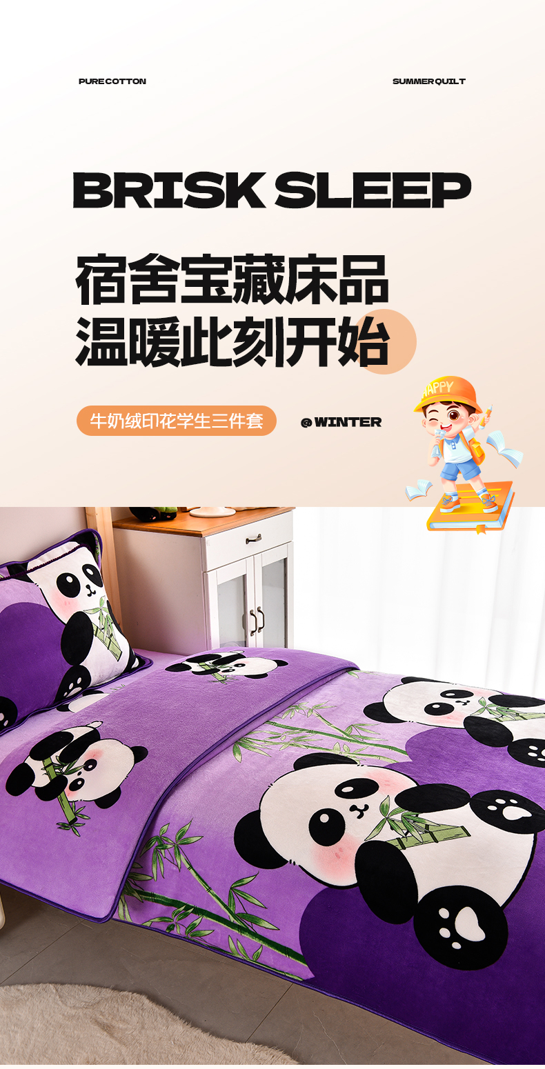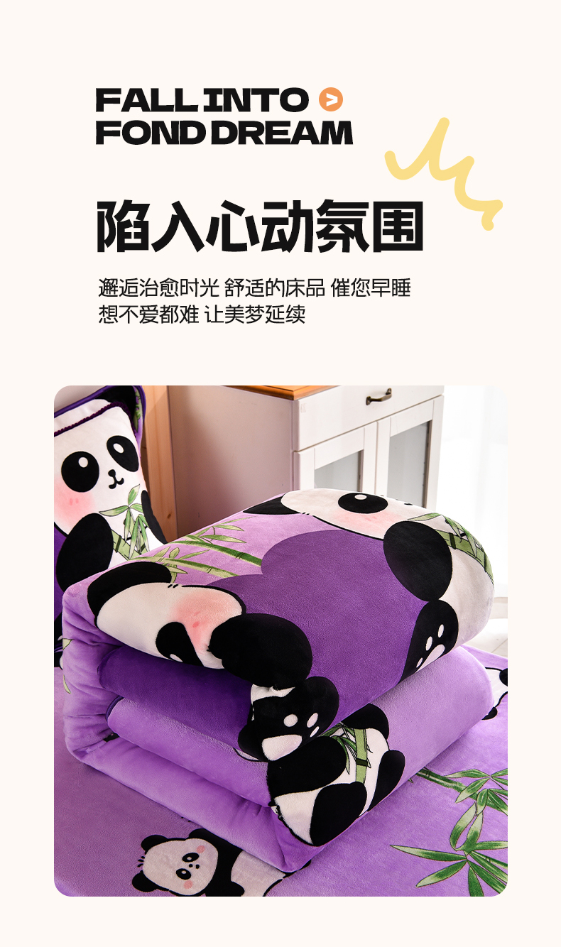 当前位置: 91家纺网 > 商品网购 > 床品套件 > 三件套 > 博兰蒂 2025新款床裙款高克重牛奶绒印花学生三件套 熊猫-紫