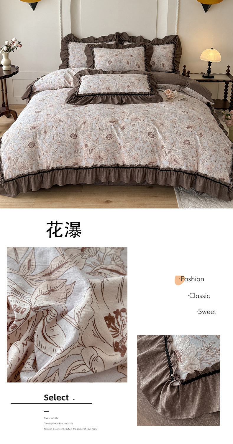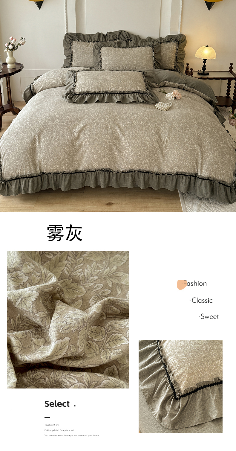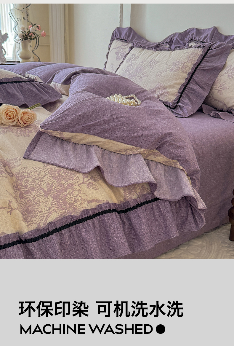 优贝家纺 2025秋冬新品加厚高克重原麻复古水洗亚麻棉麻皱皱纱印花四件套 玉茗,玉茗