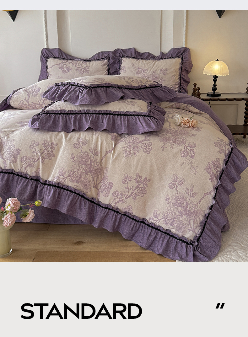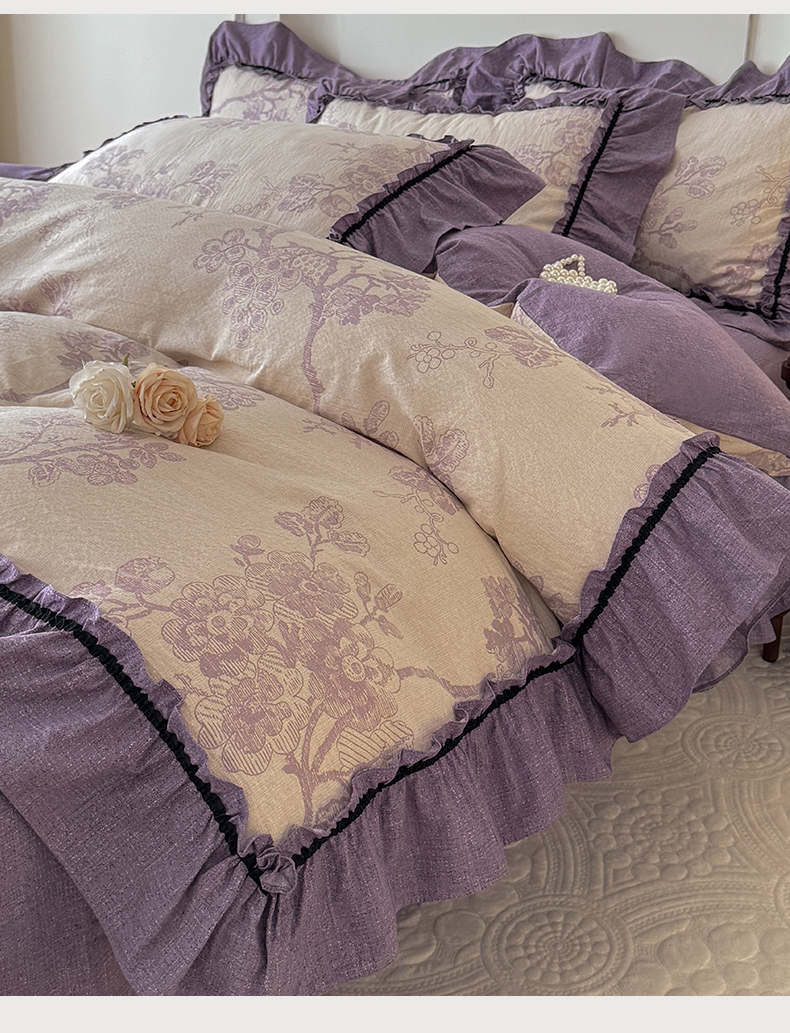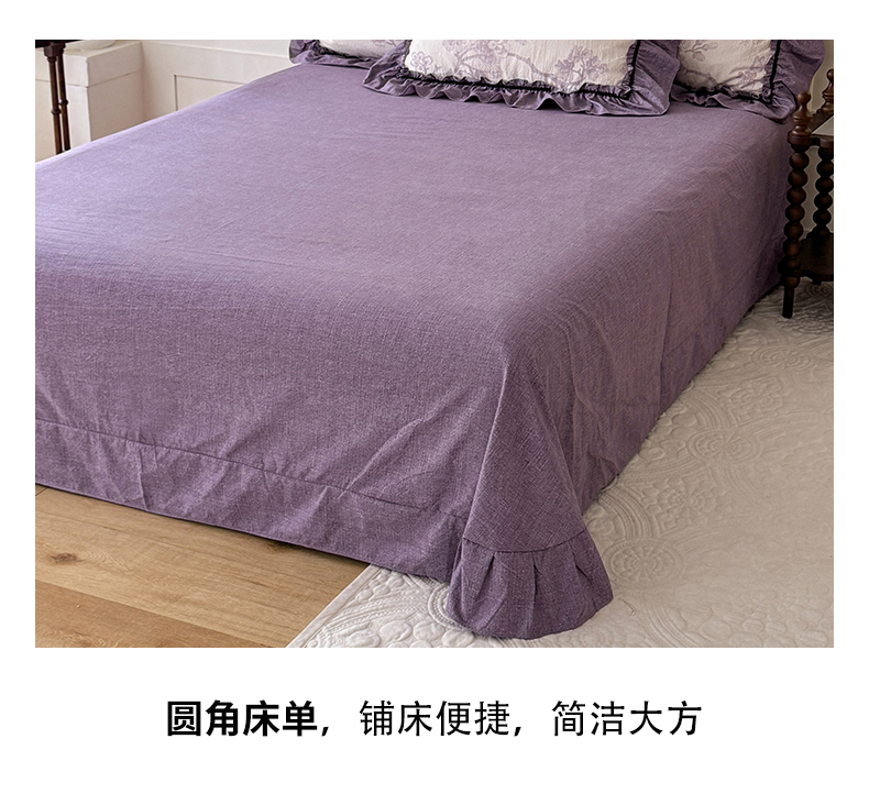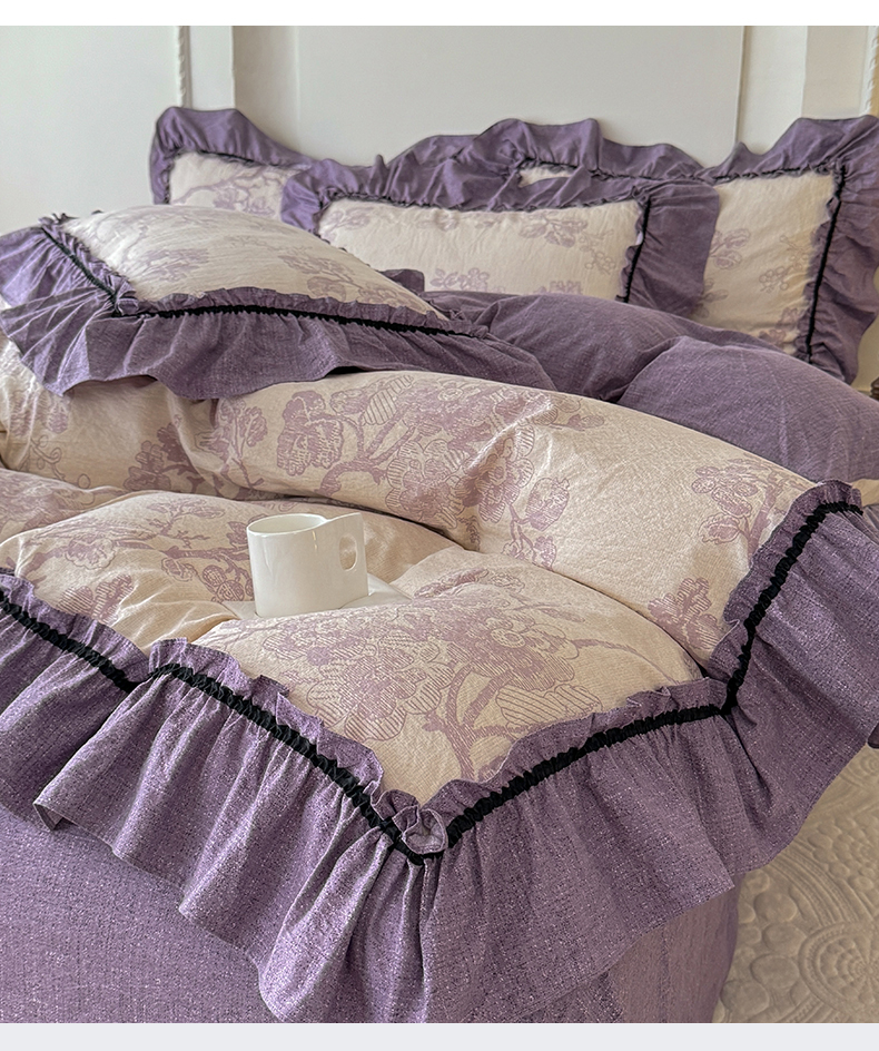 优贝家纺 2025秋冬新品加厚高克重原麻复古水洗亚麻棉麻皱皱纱印花四件套 玉茗,玉茗