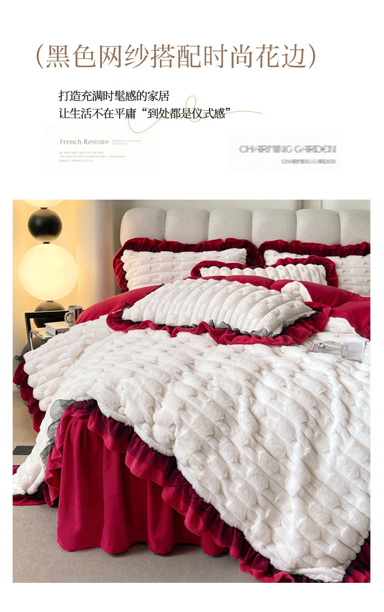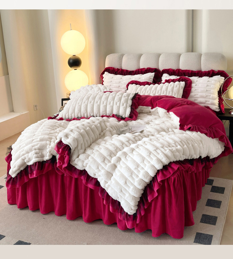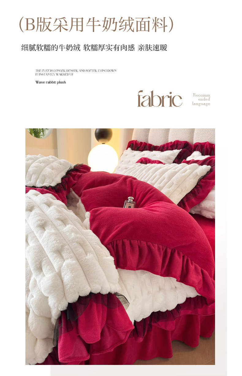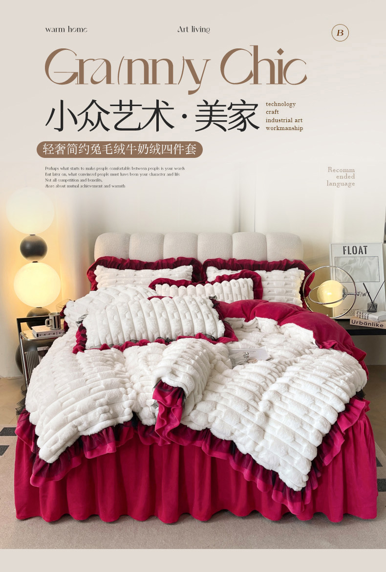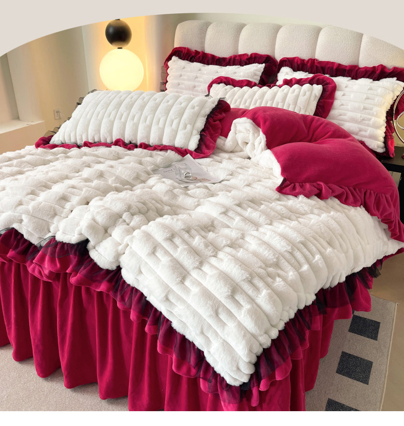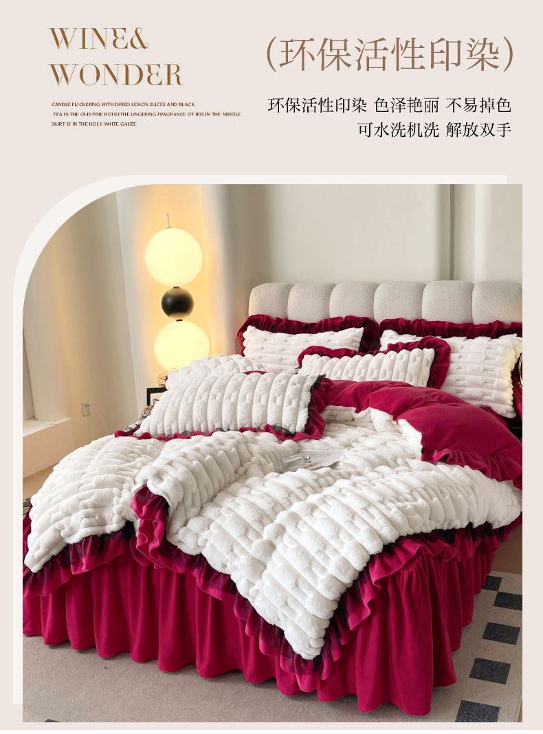 当前位置: 91家纺网 > 商品网购 > 床品套件 > 四件套 > 牛奶绒四件套 > 睡美人 2025韩版兔绒提花牛奶绒床裙床单床笠款四件套 兔绒提花-酒红色
