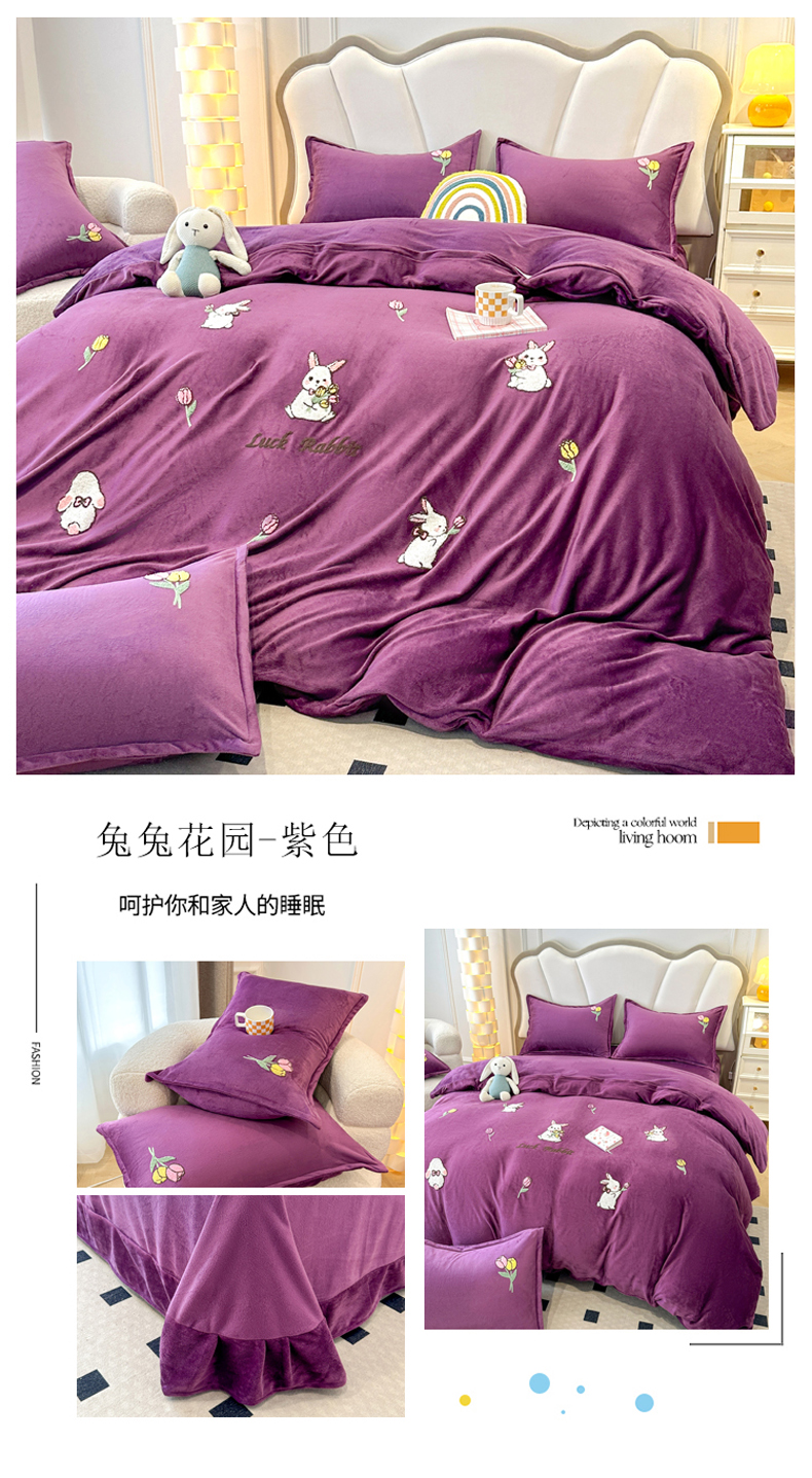 (总)2025新款保暖水晶绒床裙款四件套,紫色,浅豆沙,玫红,深豆沙,酒红,大红,深紫,灰色,蓝色,粉玉,果绿色,橘色,米色,驼色,雾蓝色