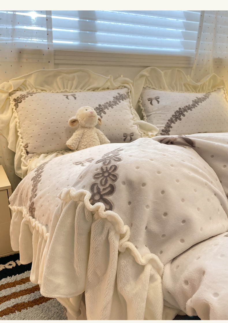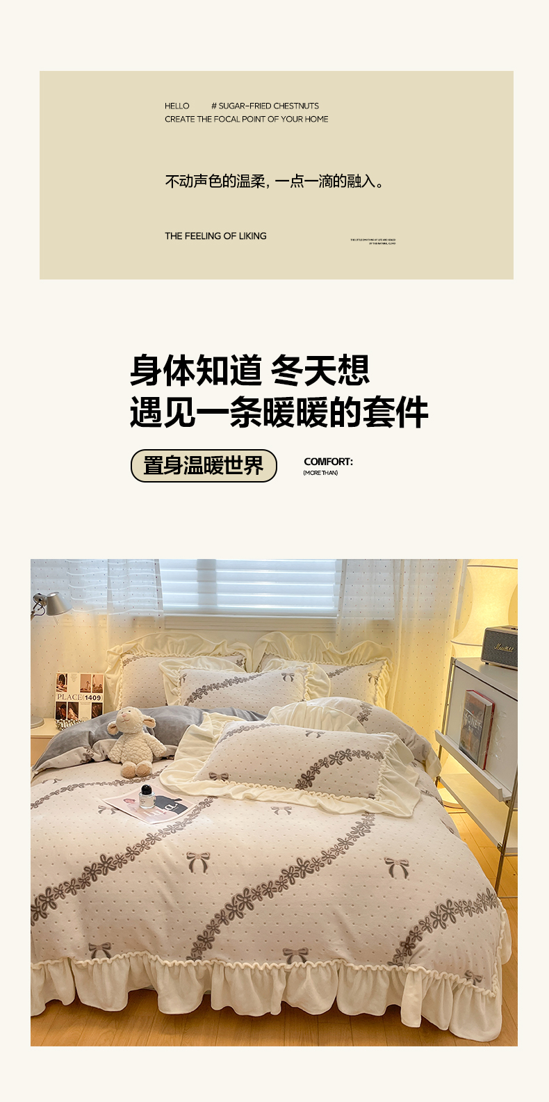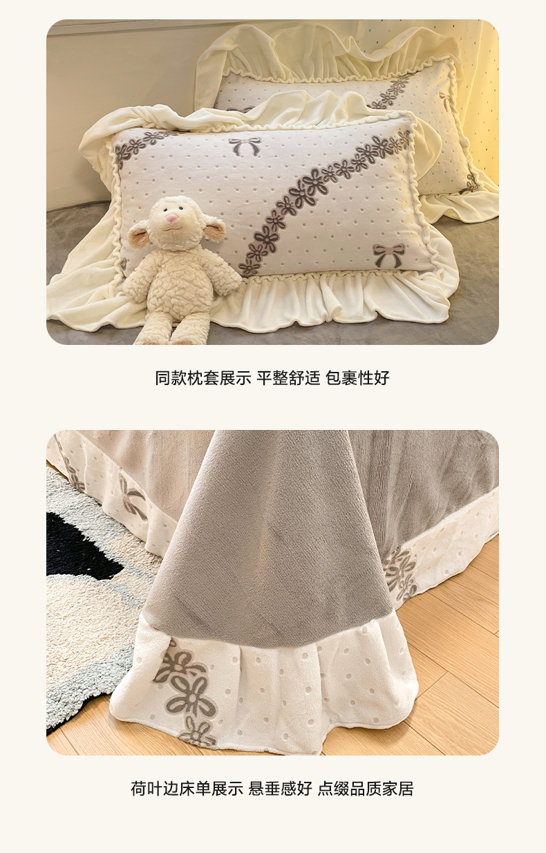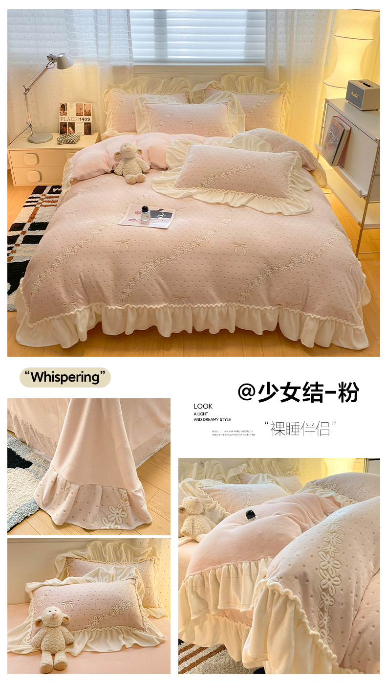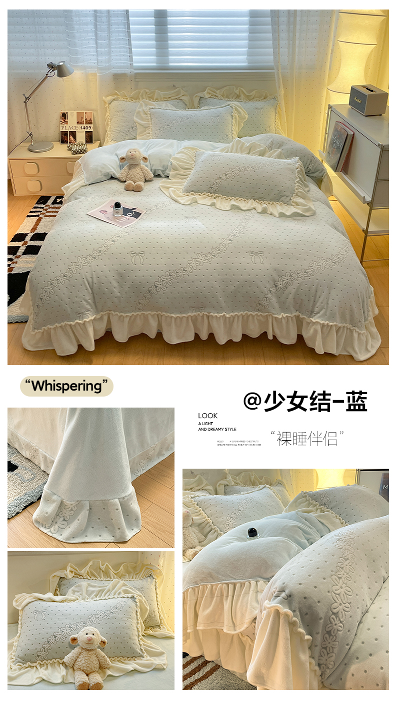 (总)利欧 2025新款褶皱边雕花牛奶绒四件套,玫影-紫,蝶舞-蓝,蝶舞-绿,玫影-橙,少女结-粉,少女结-灰,少女结-蓝,舞蝶-粉