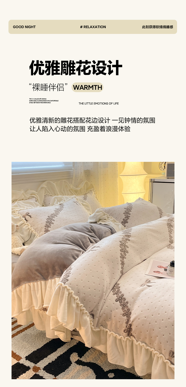 商品名称:利欧 2025新款褶皱边雕花牛奶绒四件套 玫影-紫