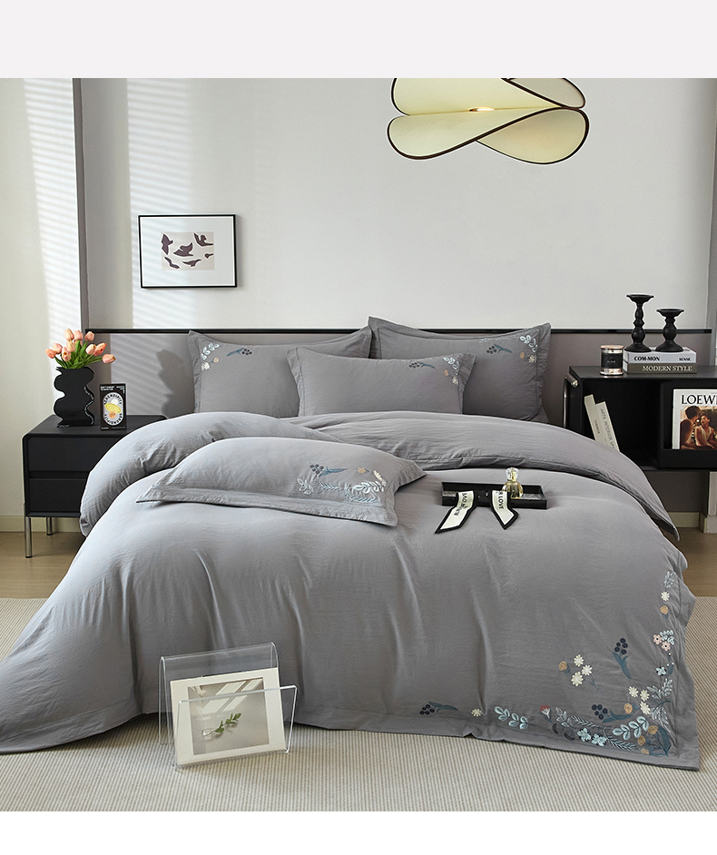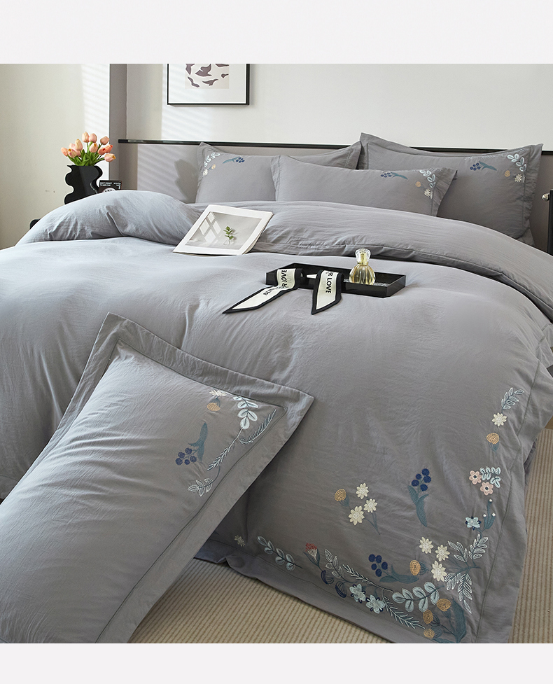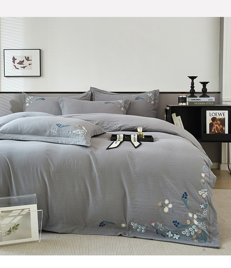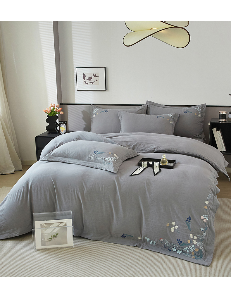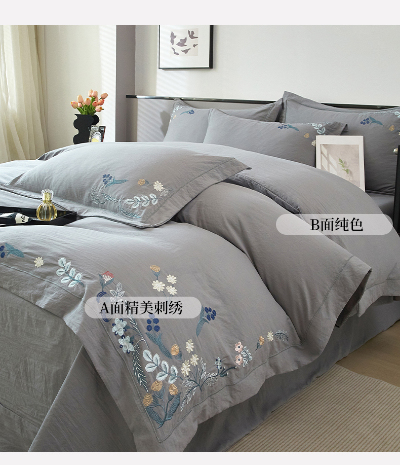 商品名称:金纱玉纺家纺 2025新款水洗棉工艺刺绣四件套 恬静时光-中灰
