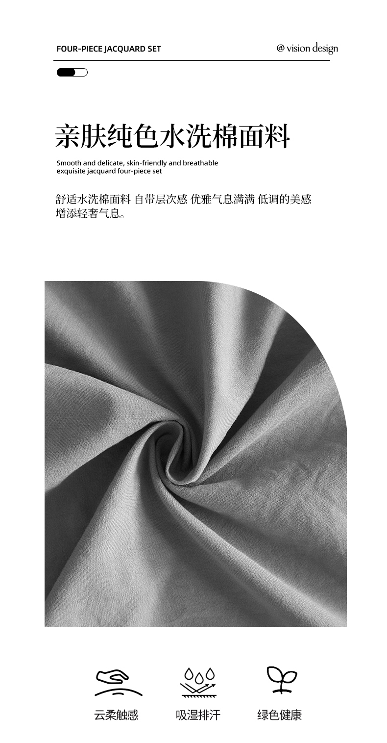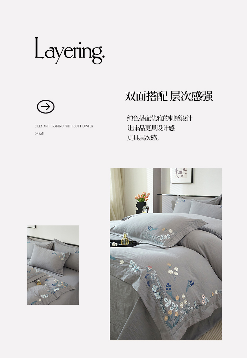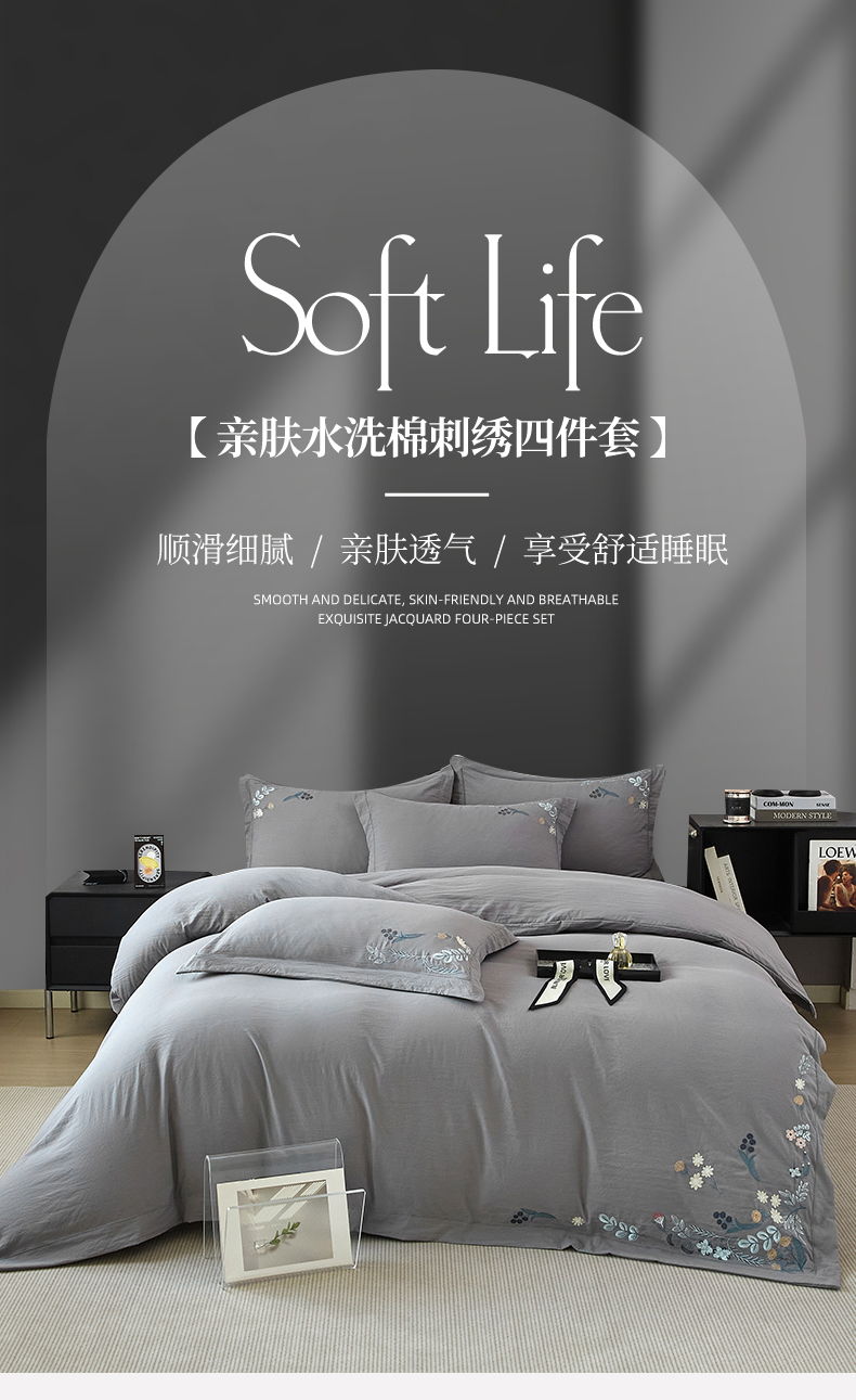 商品名称:金纱玉纺家纺 2025新款水洗棉工艺刺绣四件套 恬静时光-中灰