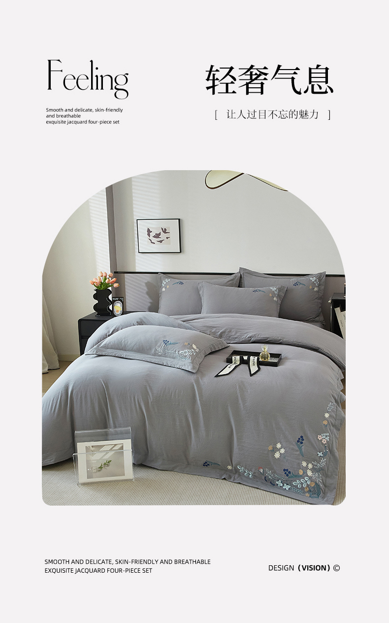 金纱玉纺家纺 2025新款水洗棉工艺刺绣四件套 恬静时光-中灰
