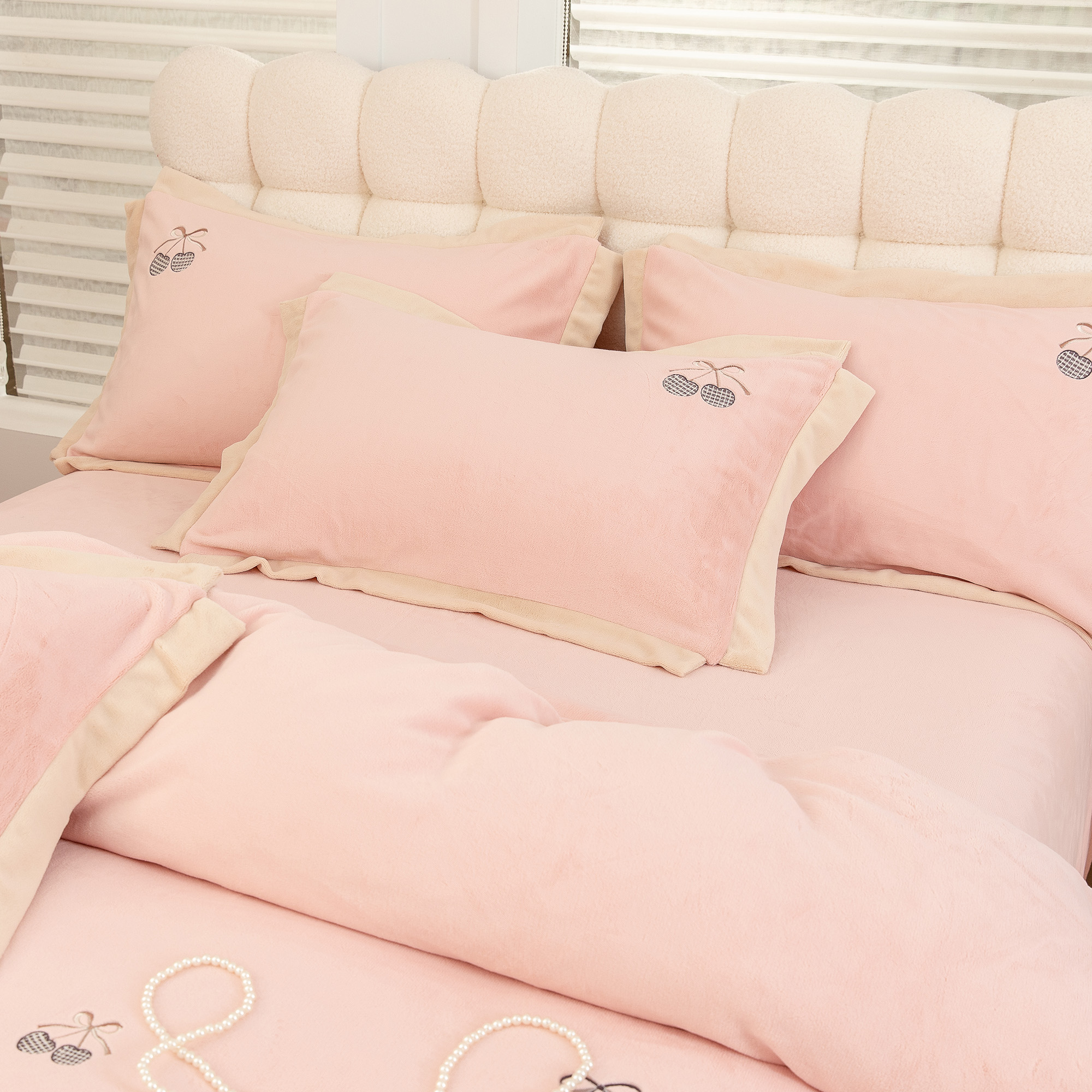 (总)贝尔 2025新款甜蜜樱桃-纯色高克重全消光蚕丝绒(赠送拎袋)-段角刺绣四件套