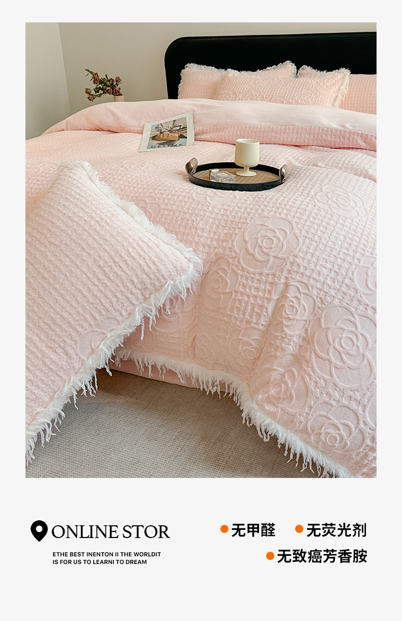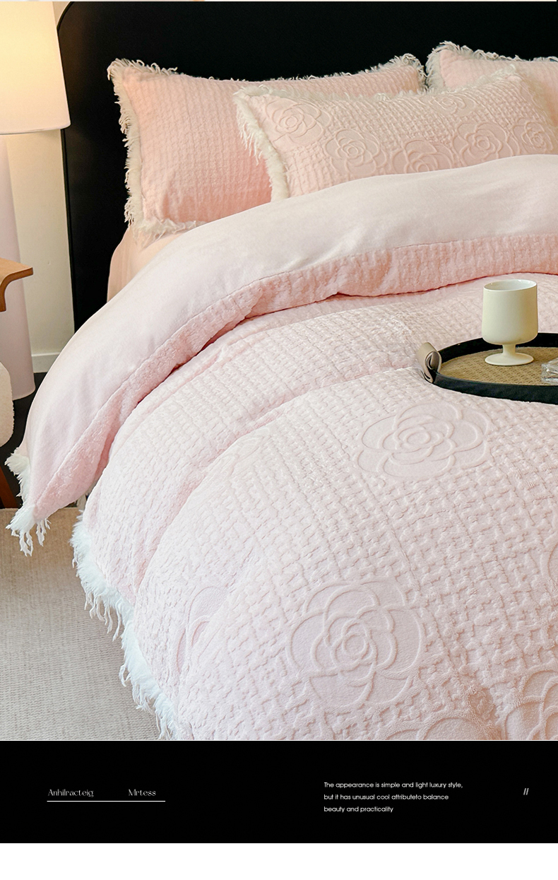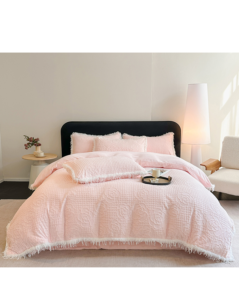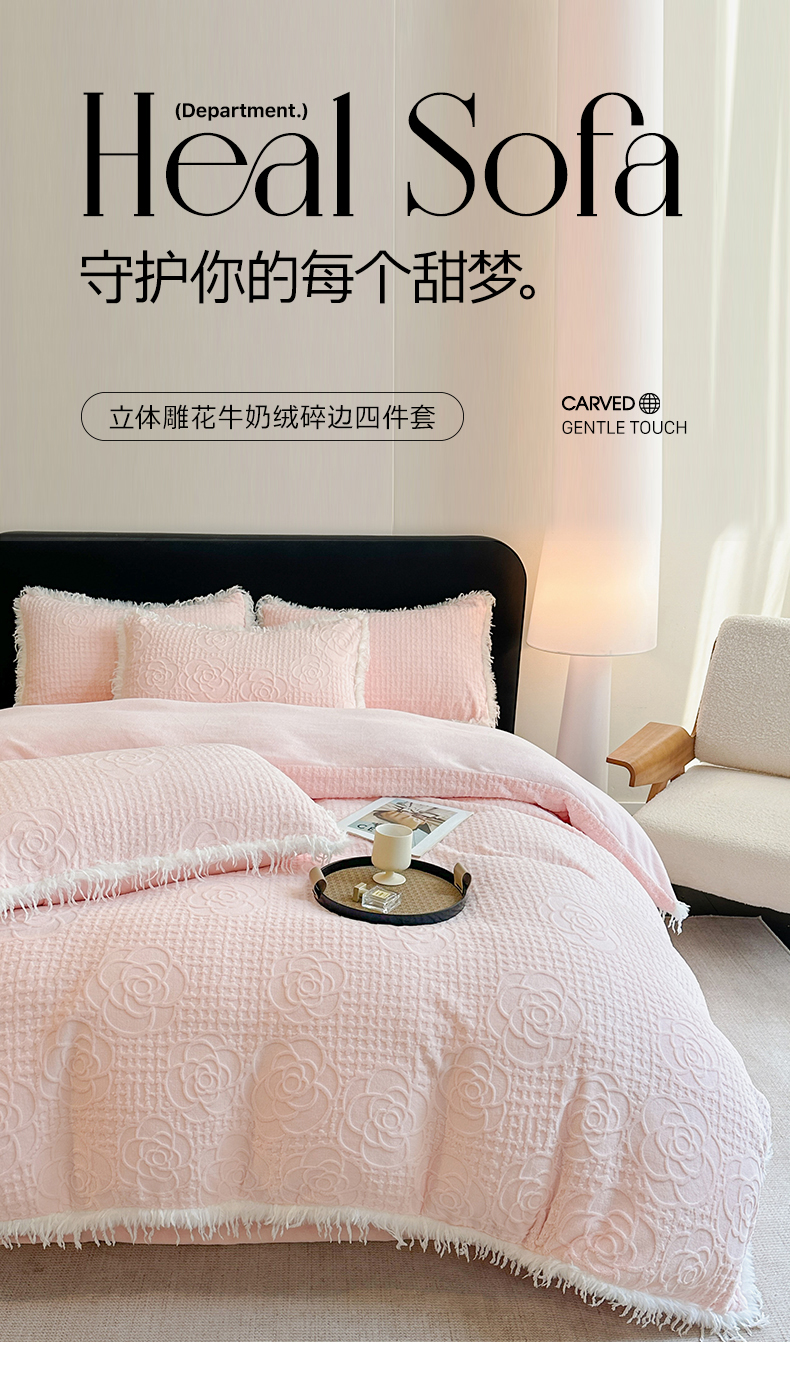 当前位置: 91家纺网 > 商品网购 > 床品套件 > 四件套 > 牛奶绒四件套 > 极简 2025新款立体雕花牛奶绒碎边四件套-米娅 米娅-粉