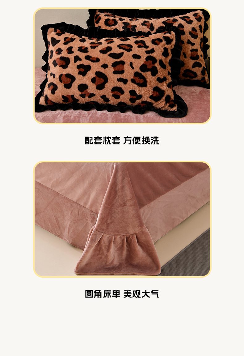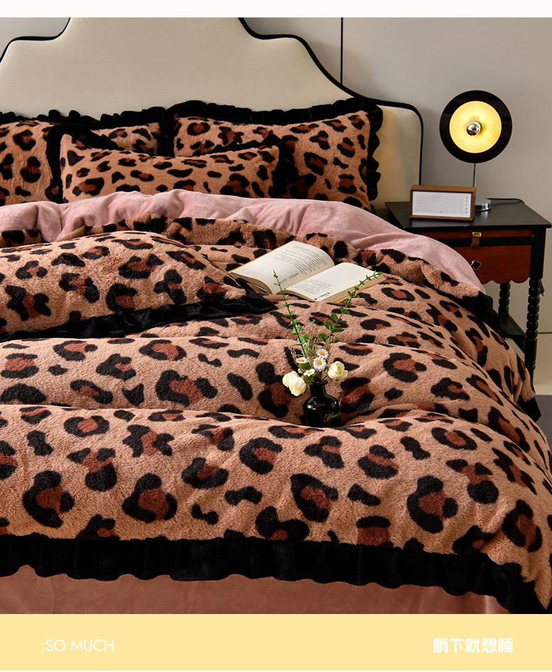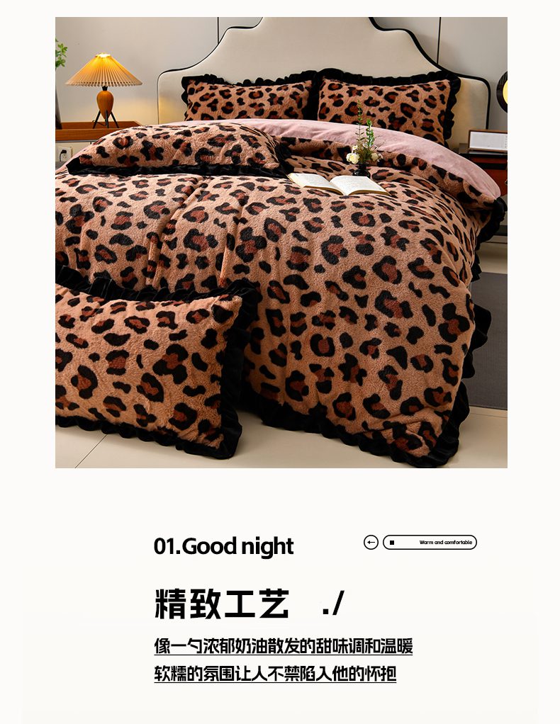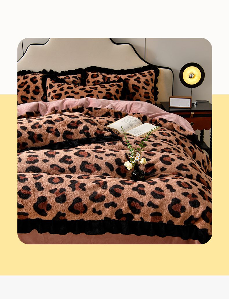 商品名称:畅畅家纺 2025新款冬季9斤重加厚皮草绒兔毛绒轻奢赫本风牛奶绒花边四件套 轻奢-小豹纹