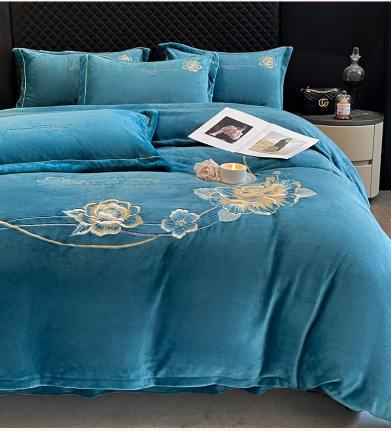 畅畅家纺 2025新款冬季牛奶绒绣花绒四件套 芳华-宝蓝