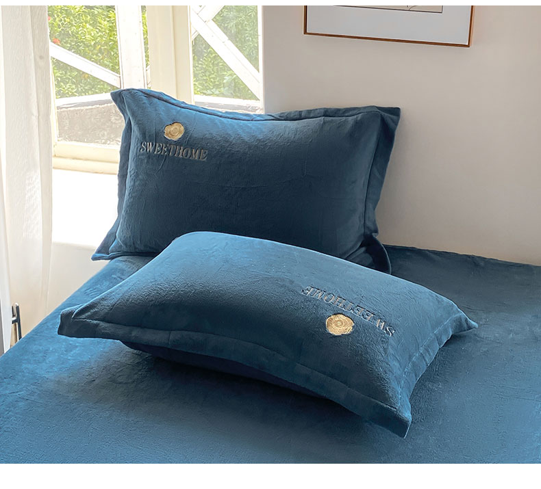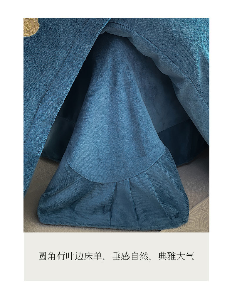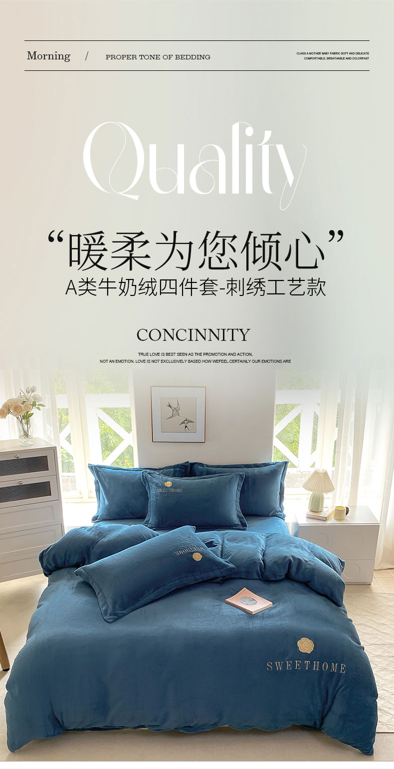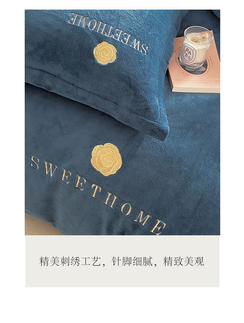 商品名称:悦织湾家纺 2025新款绣花200克重牛奶绒四件套刺绣3.5万针7斤重高密加厚保暖跨境专供外贸出口电商热销款 甜蜜家园-宾利蓝