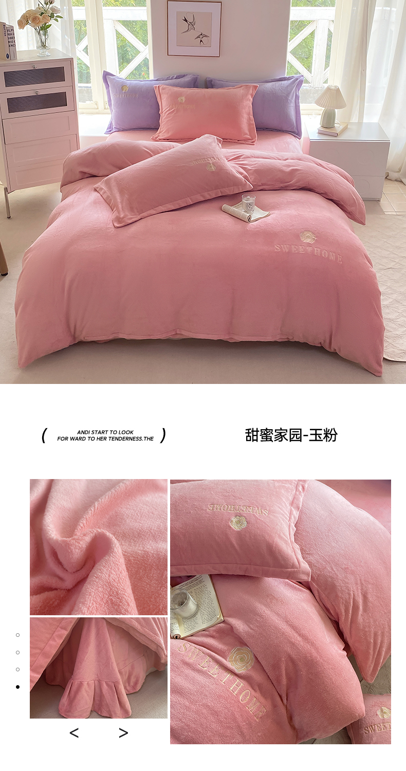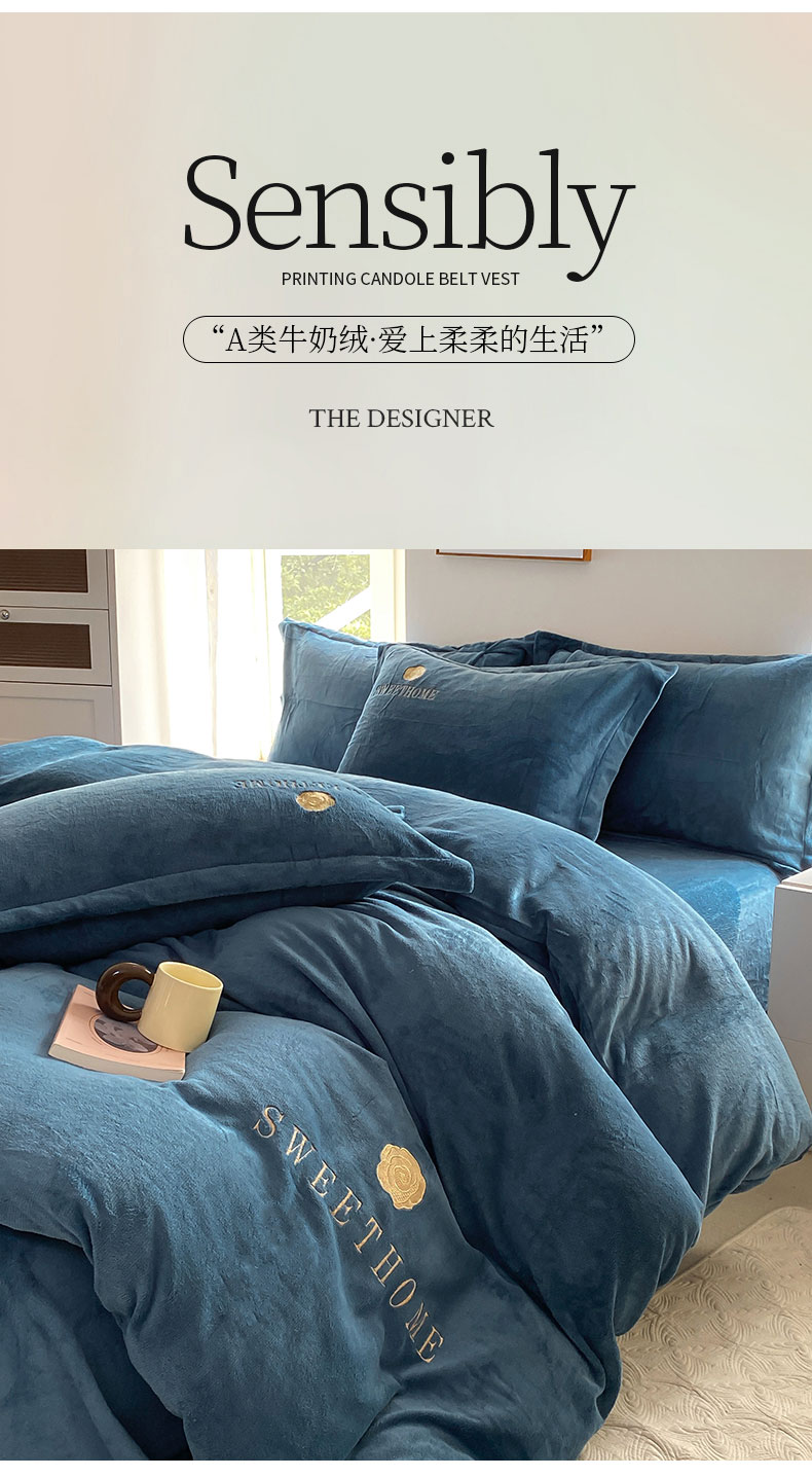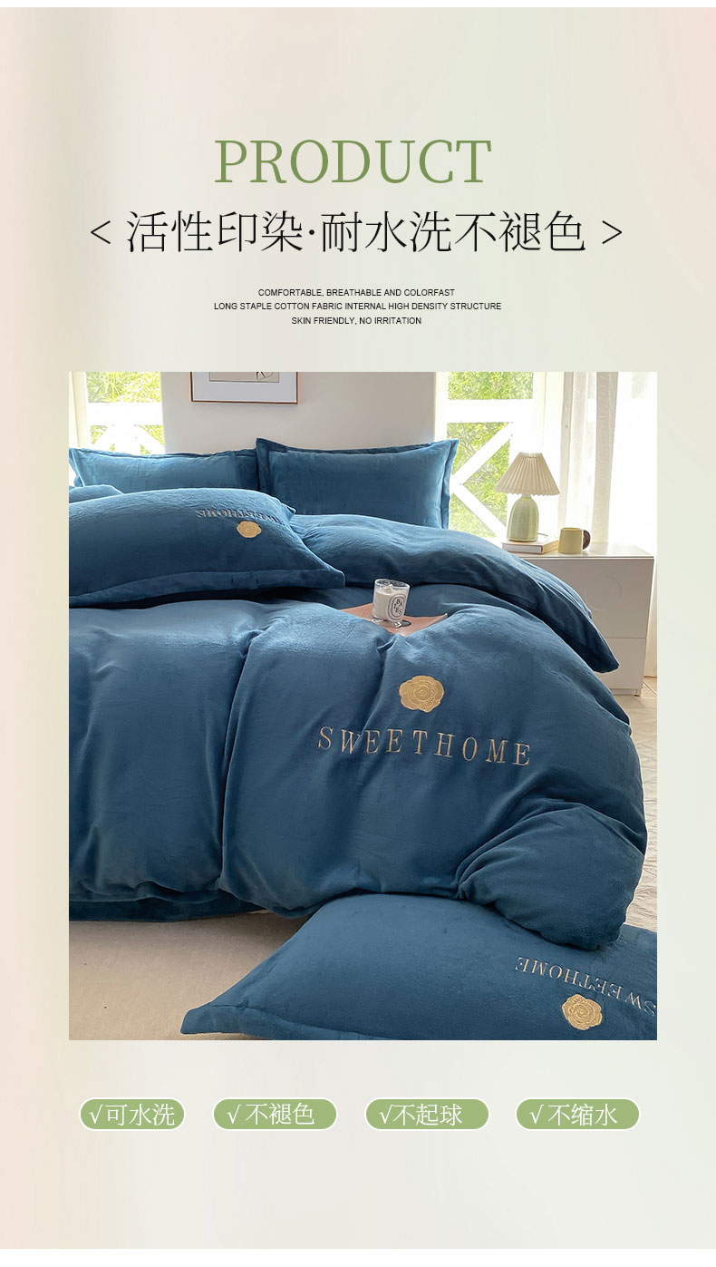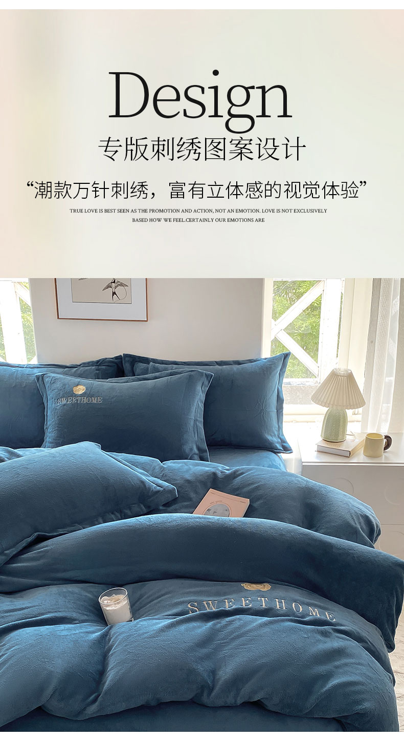 悦织湾家纺 2025新款绣花200克重牛奶绒四件套刺绣3.5万针7斤重高密加厚保暖跨境专供外贸出口电商热销款 甜蜜家园-宾利蓝
