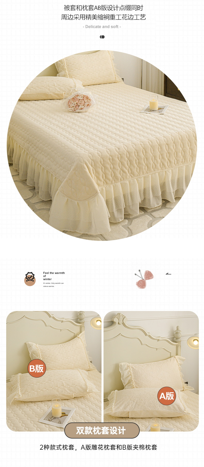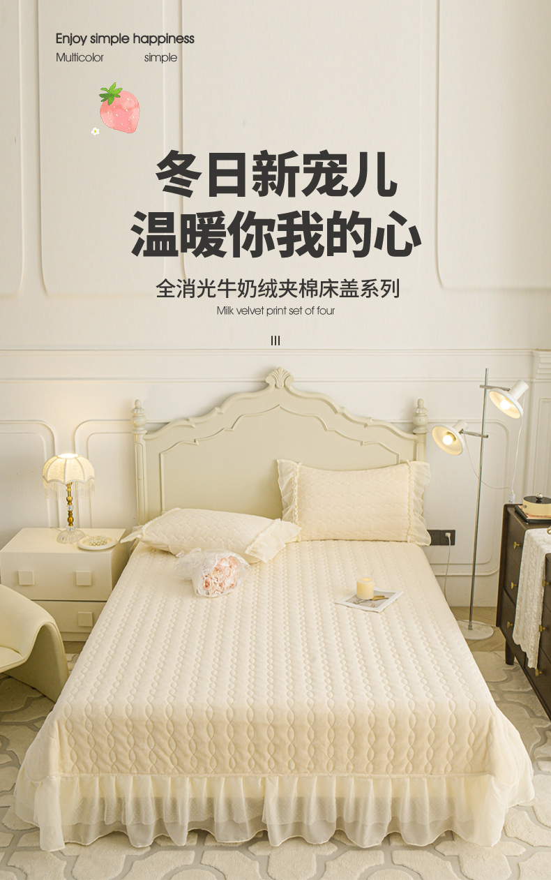 • 91家纺网 家纺一手货源 找家纺 胜权家纺 2025秋冬新款A类全消光高克重5D雕花牛奶绒仙女风夹棉床盖单品系列 梦安娜-浅米
