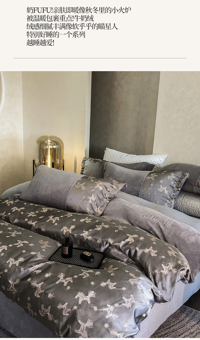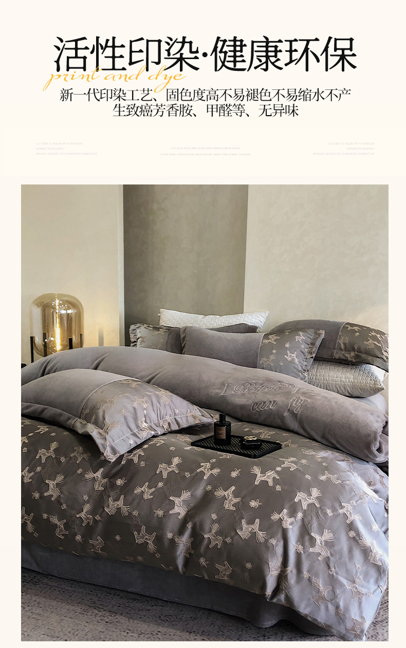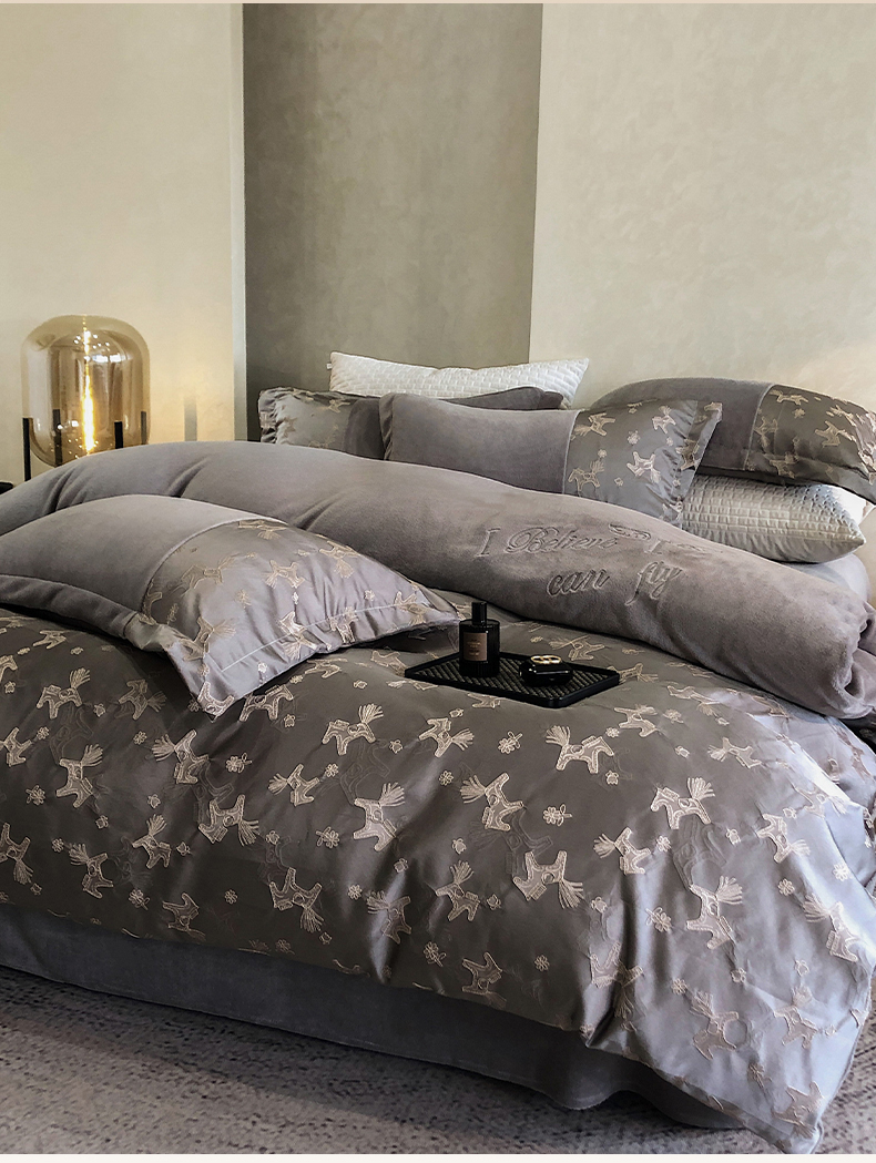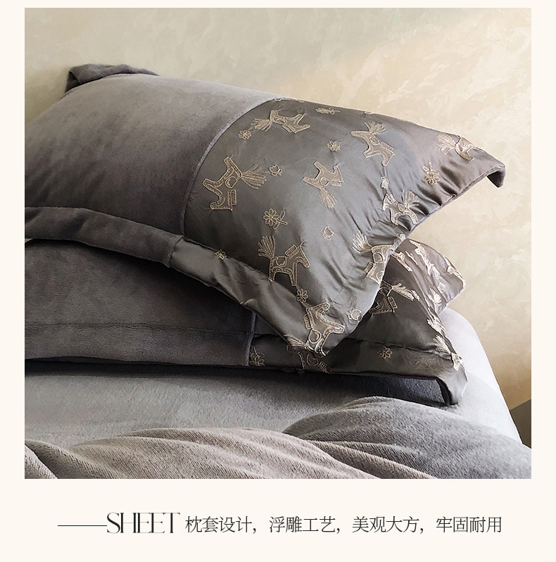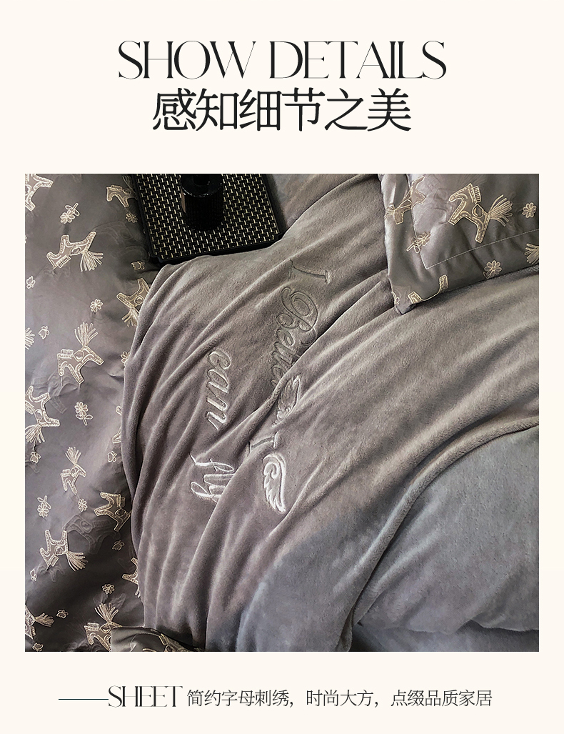 商品名称:换种生活 2025新款A类浮雕牛奶绒刺绣四件套 马上有钱花-灰