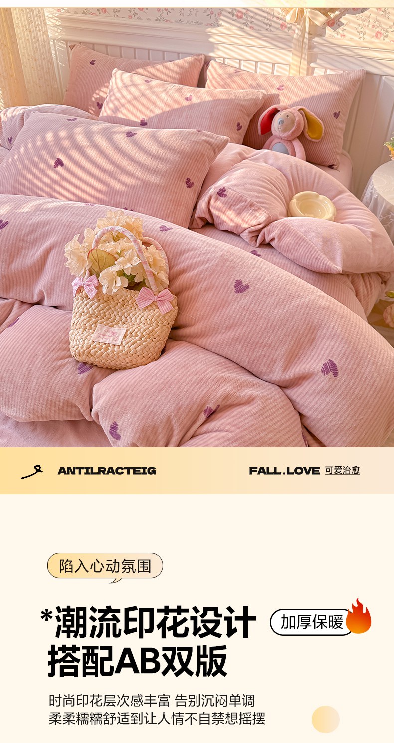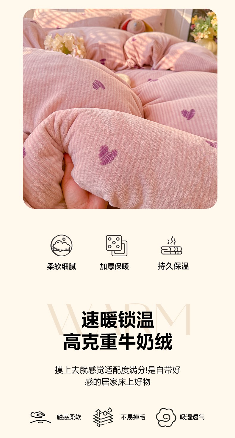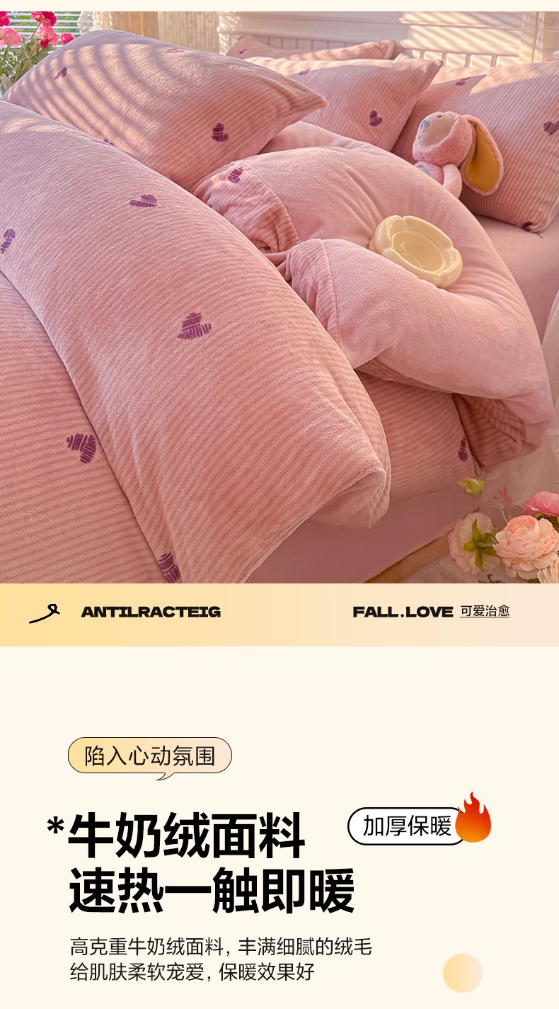 当前位置: 91家纺网 > 商品网购 > 床品套件 > 四件套 > 牛奶绒四件套 > 韩巢家纺 2025新款高克重印花牛奶绒床品四件套 条纹爱心