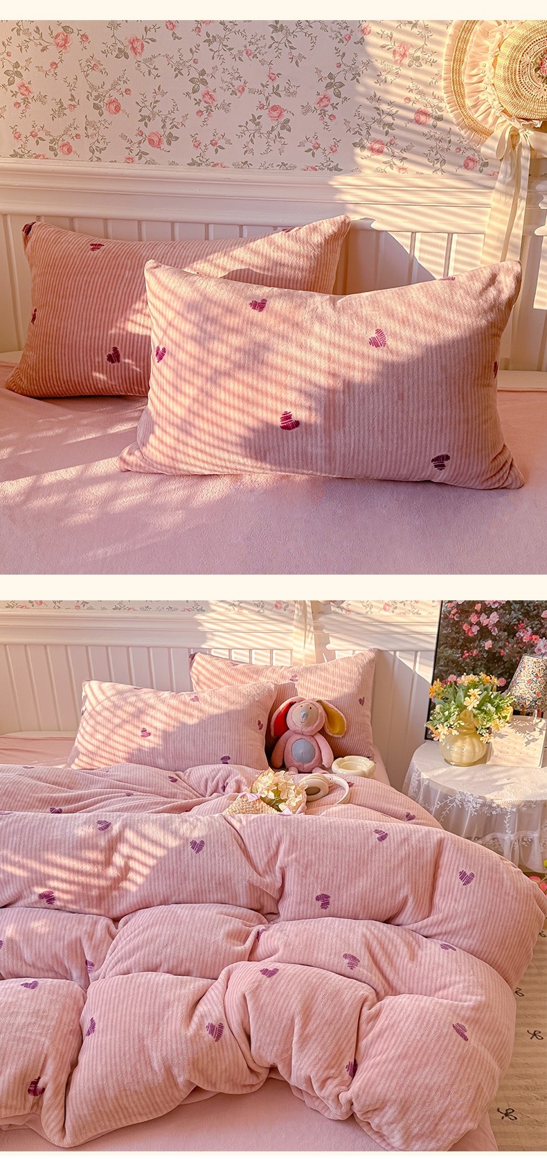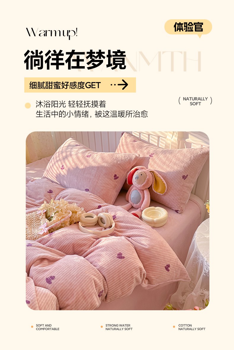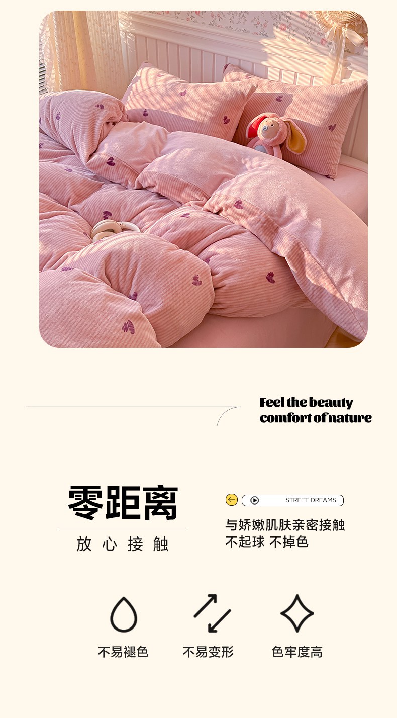 当前位置: 91家纺网 > 商品网购 > 床品套件 > 四件套 > 牛奶绒四件套 > 韩巢家纺 2025新款高克重印花牛奶绒床品四件套 条纹爱心