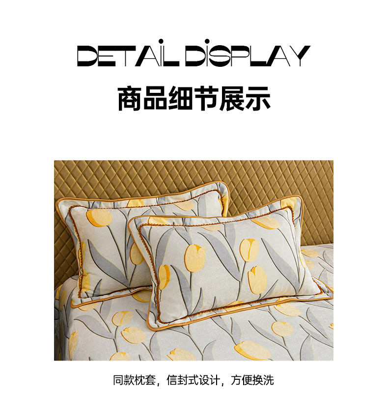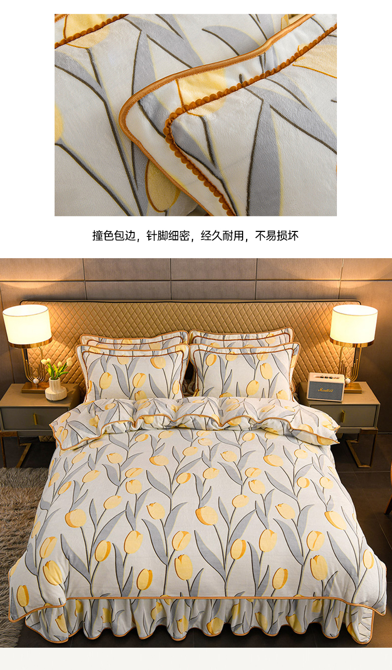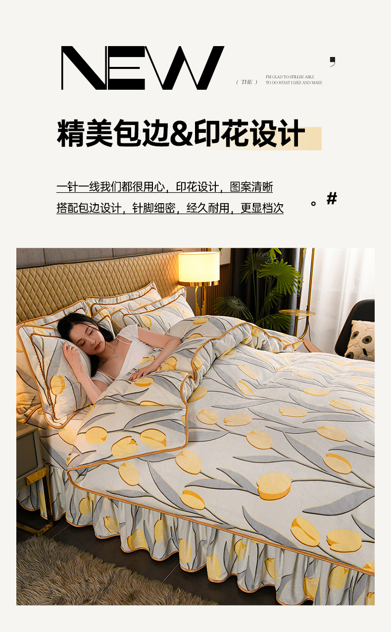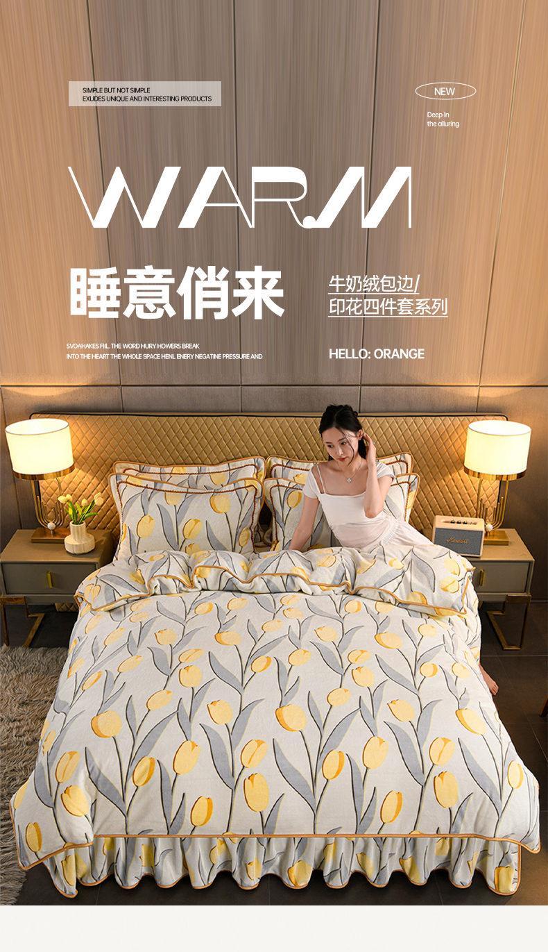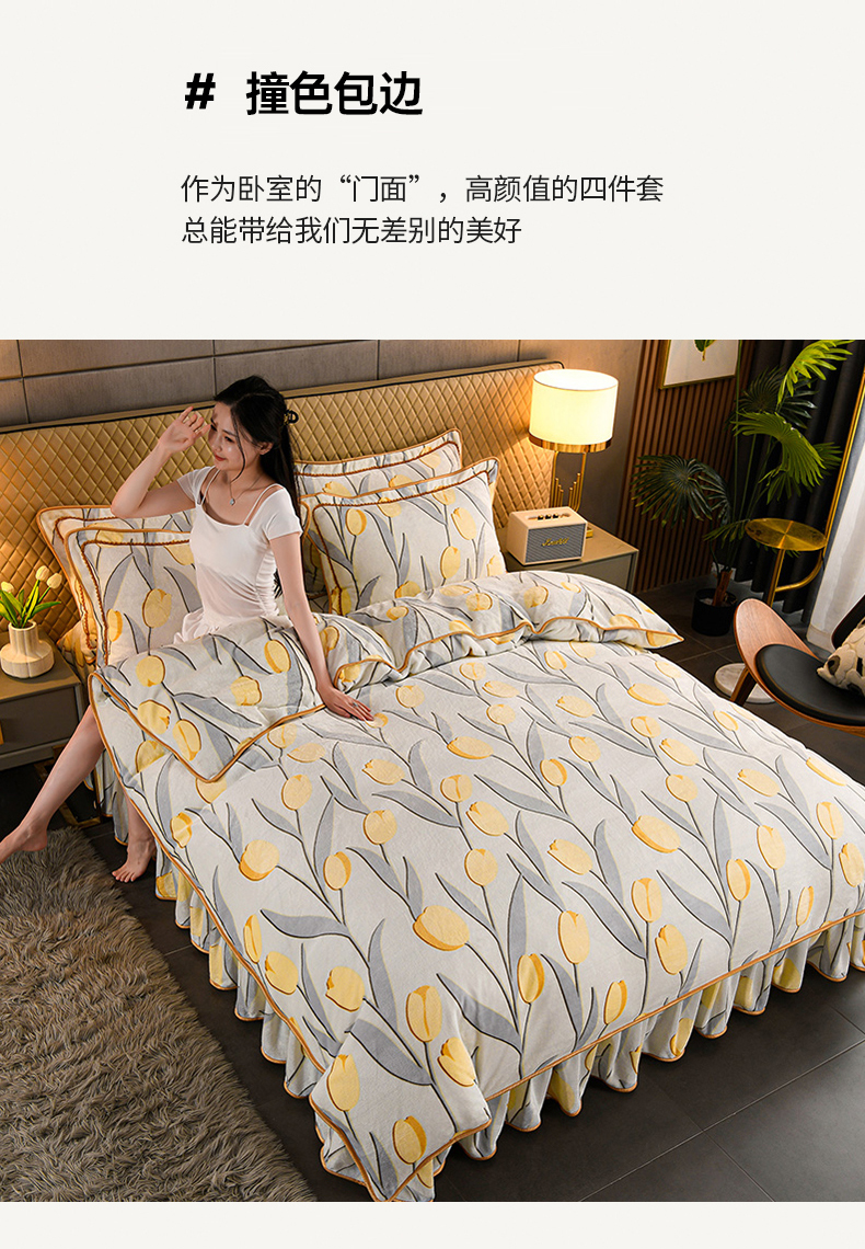 商品名称:牵依 2025新款牛奶绒小包边印花四件套 浪漫郁金香-米黄
