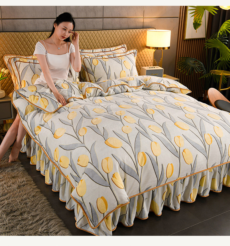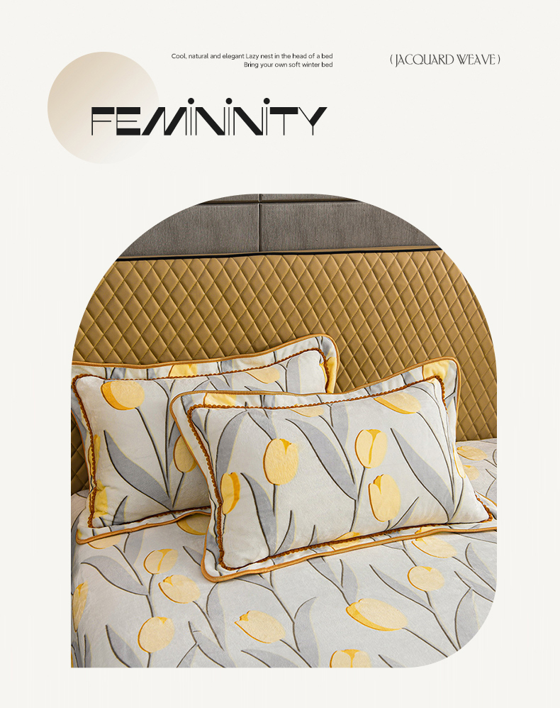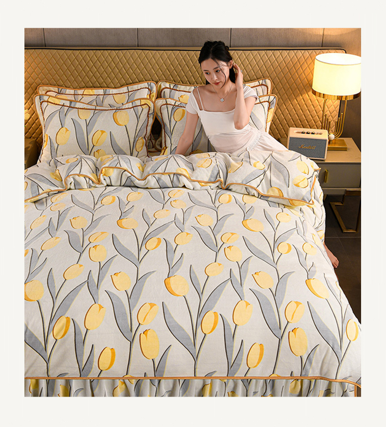 牵依 2025新款牛奶绒小包边印花四件套 浪漫郁金香-米黄