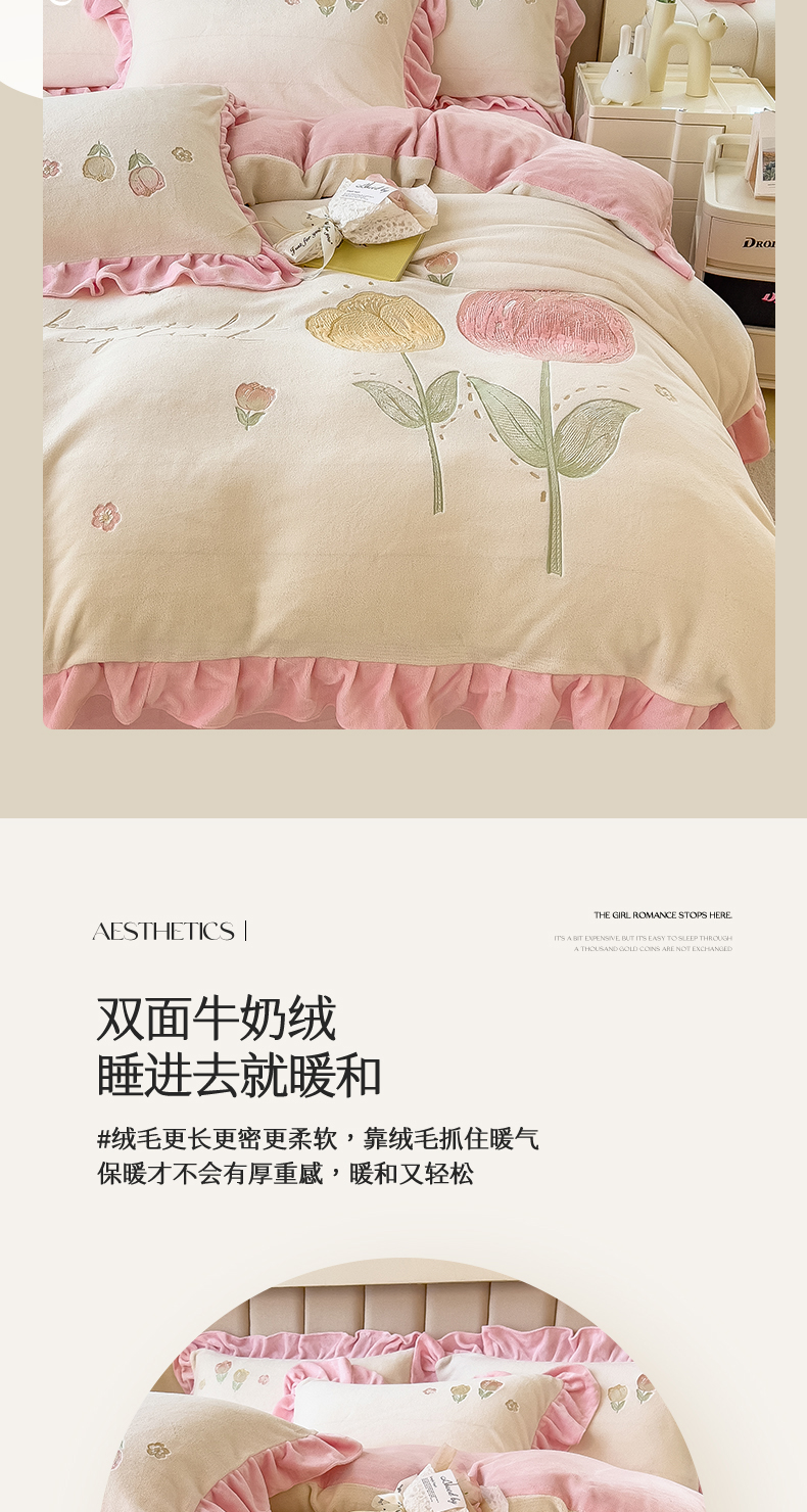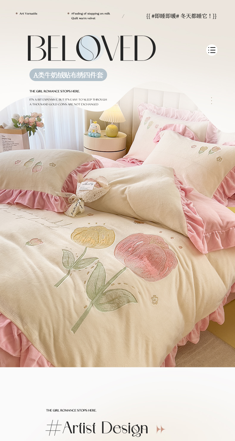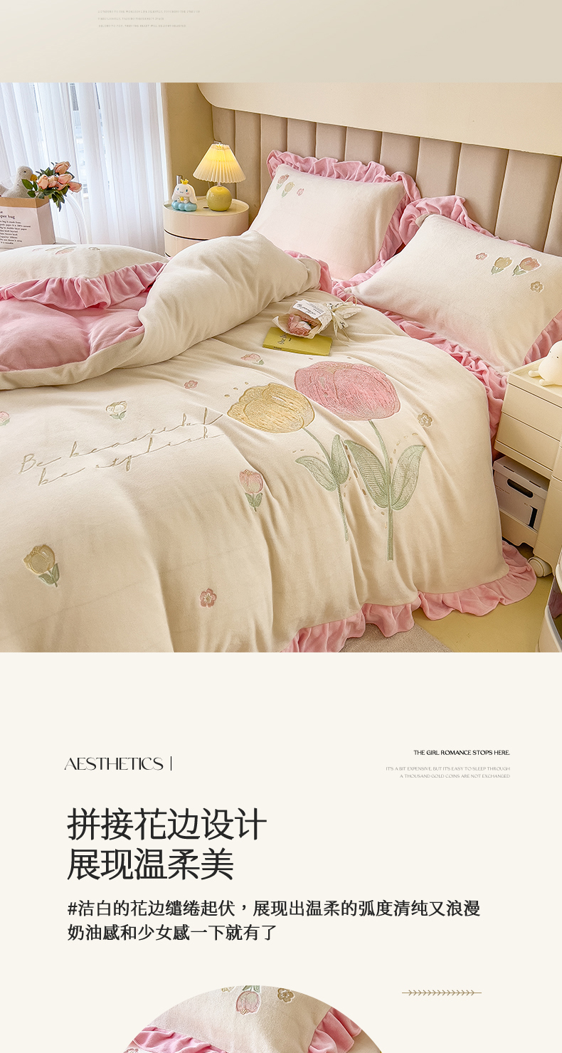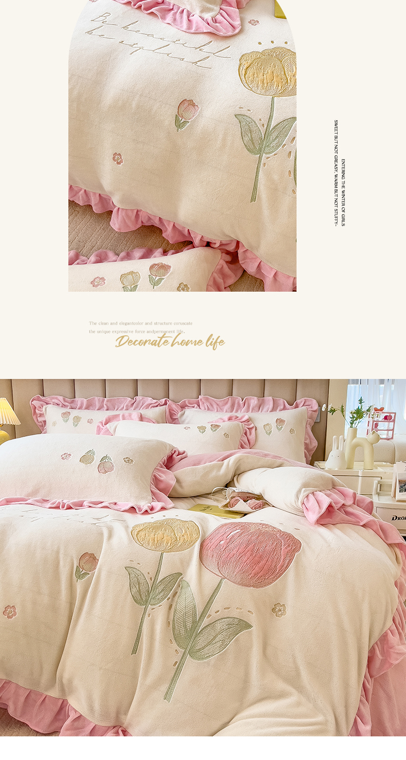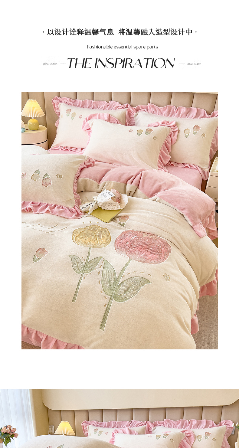 商品名称:曲之慕 2025新款韩版牛奶绒花朵贴布绣四件套 郁金香-奶白粉
