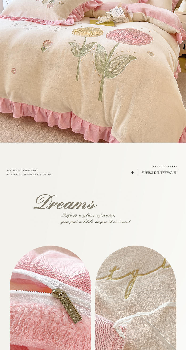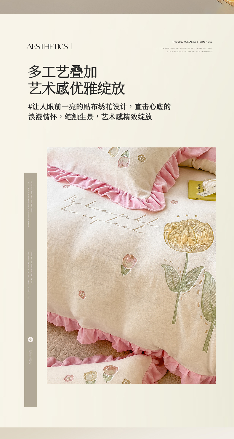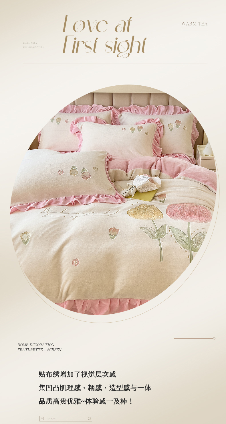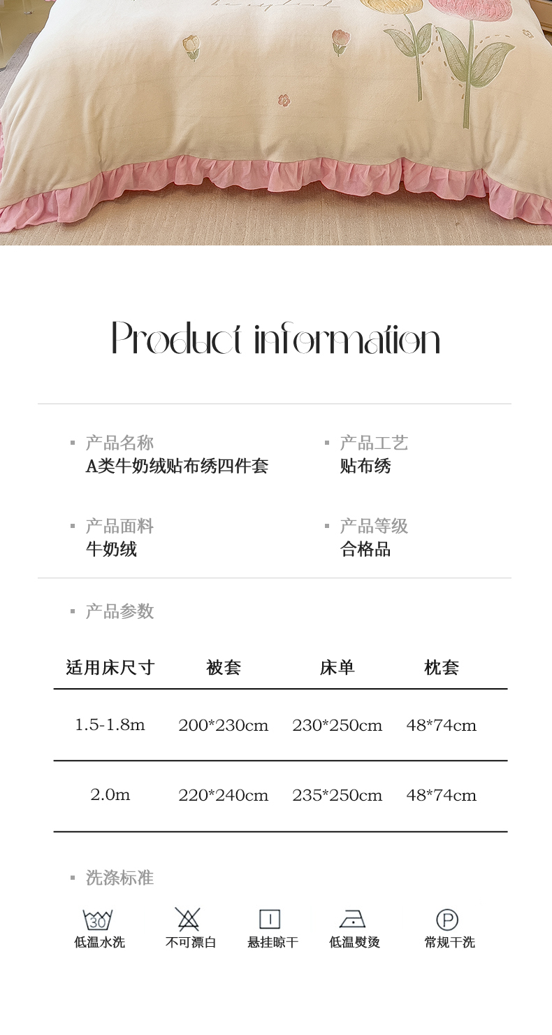 商品名称:曲之慕 2025新款韩版牛奶绒花朵贴布绣四件套 郁金香-奶白粉