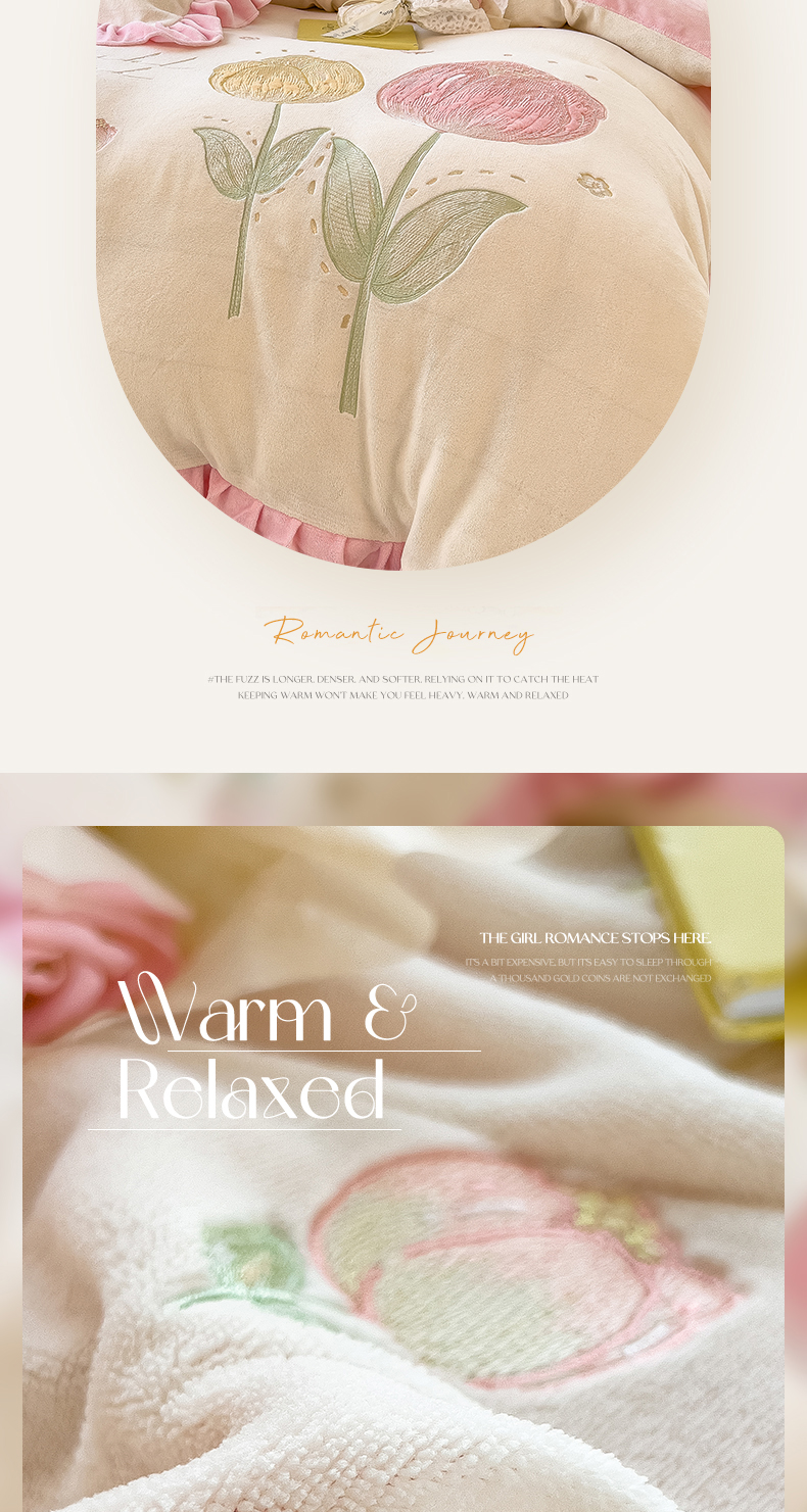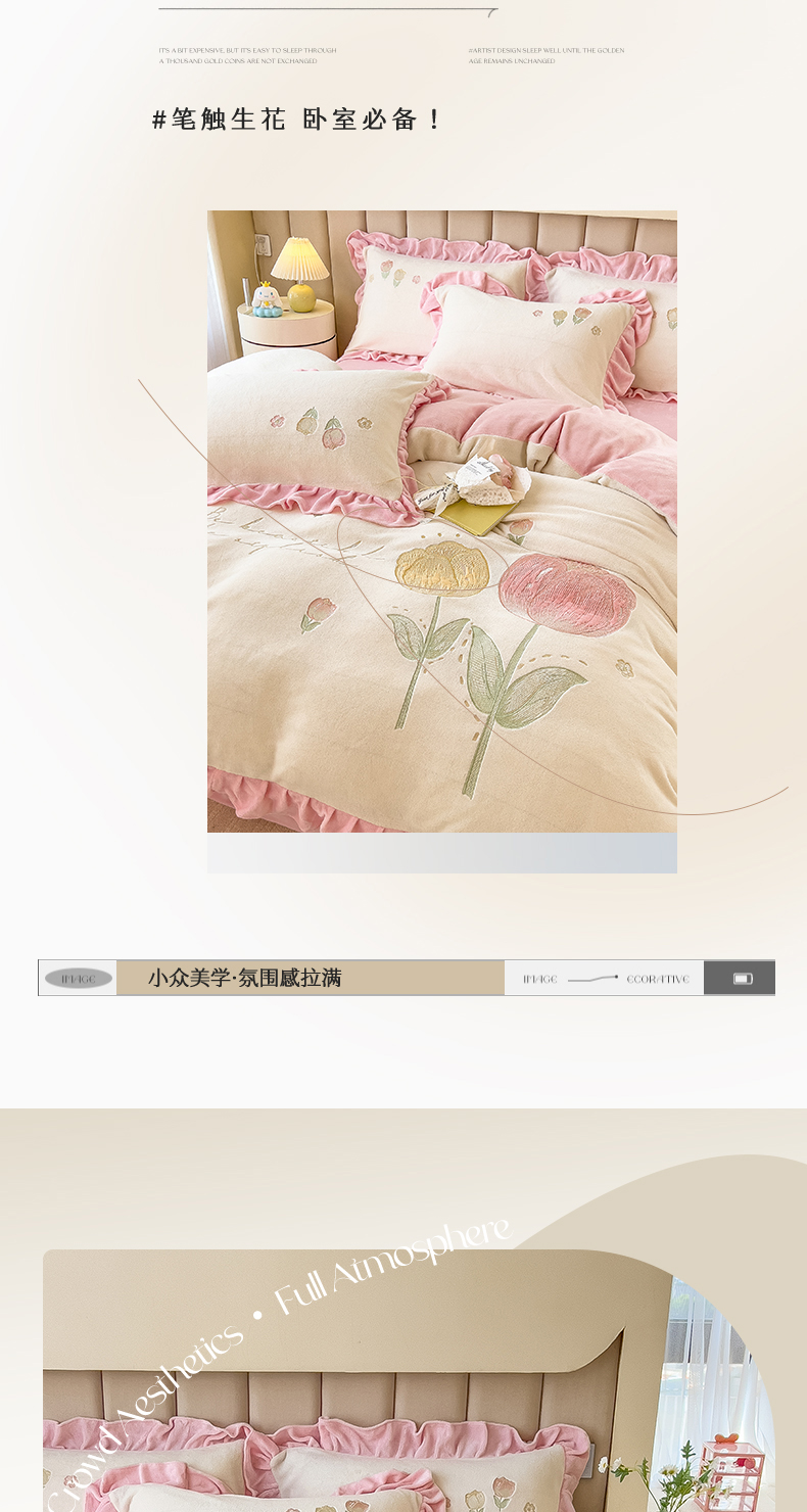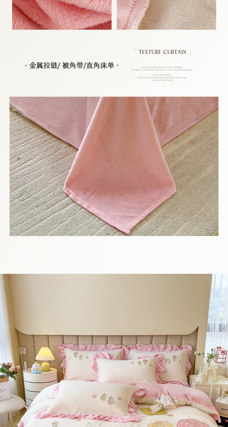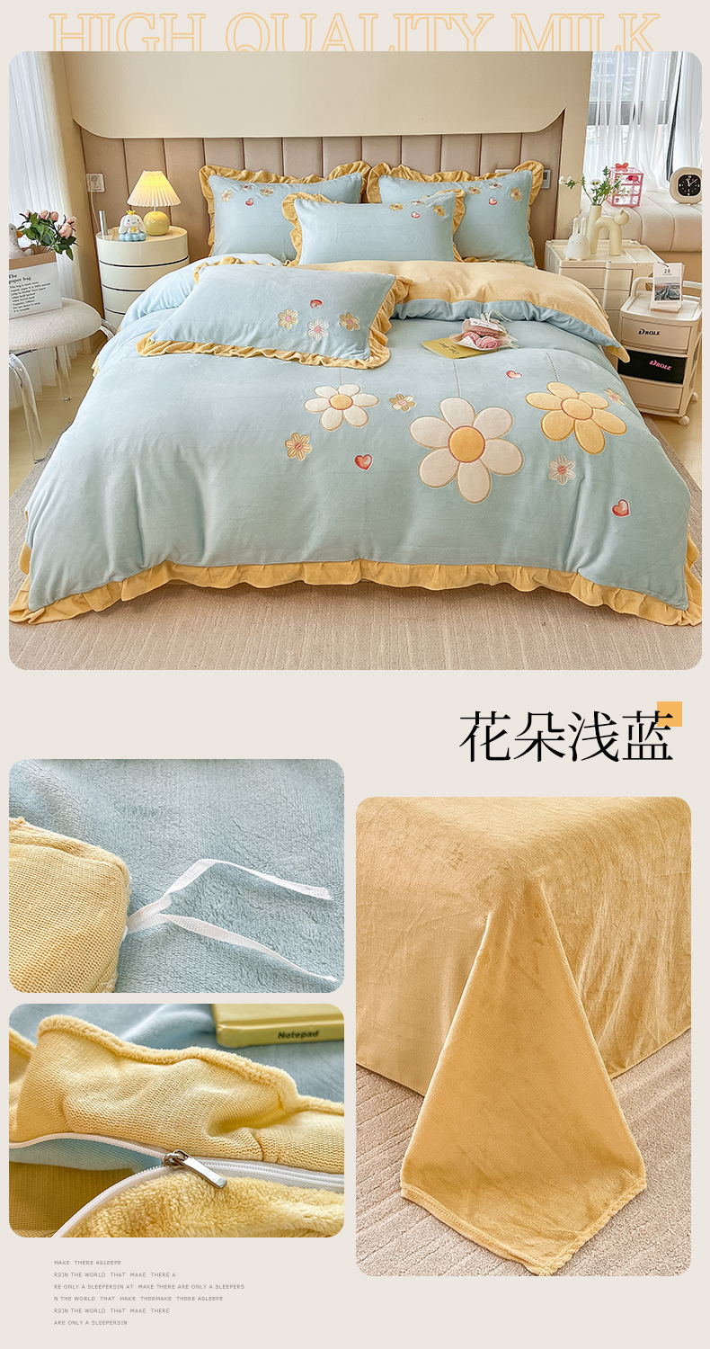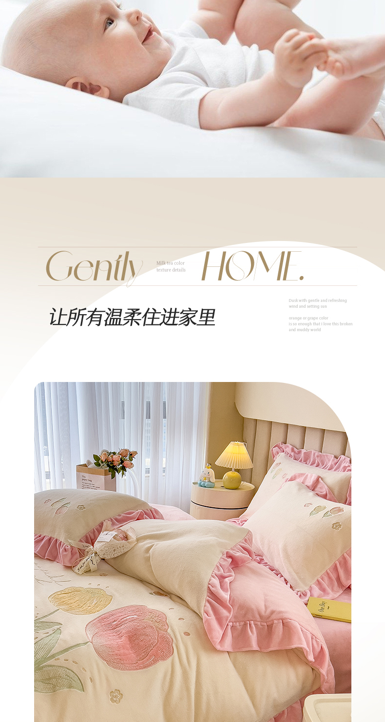 商品名称:曲之慕 2025新款韩版牛奶绒花朵贴布绣四件套 郁金香-奶白粉