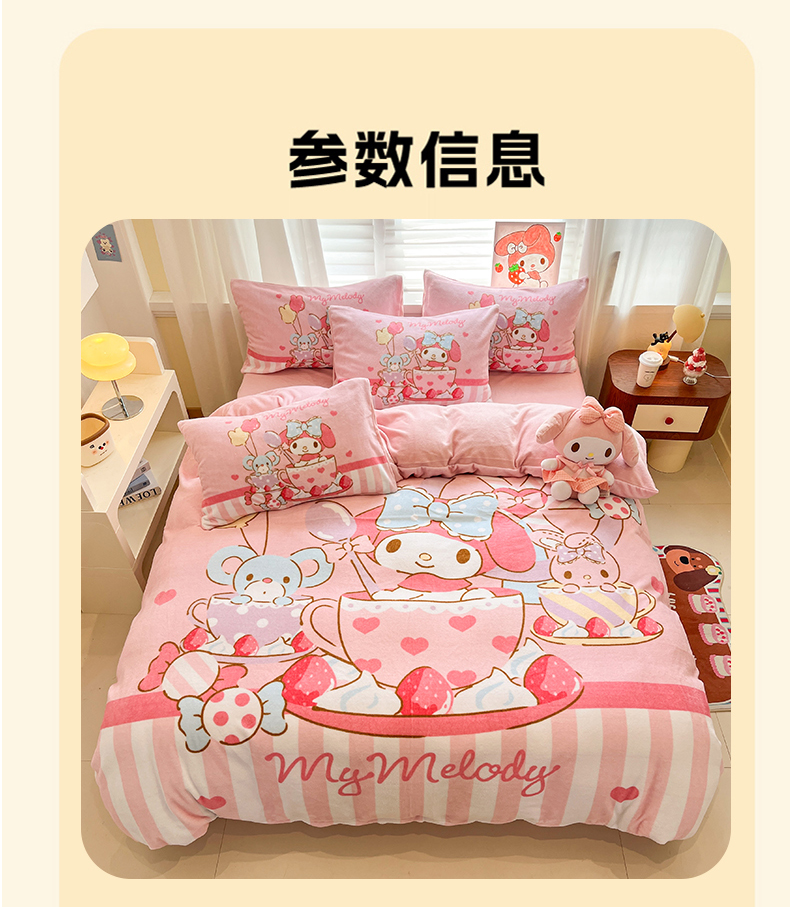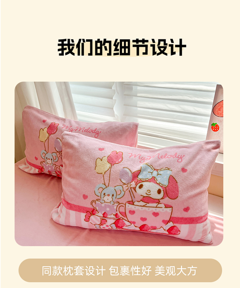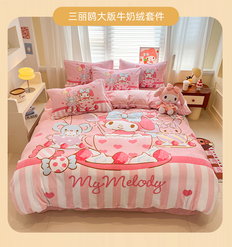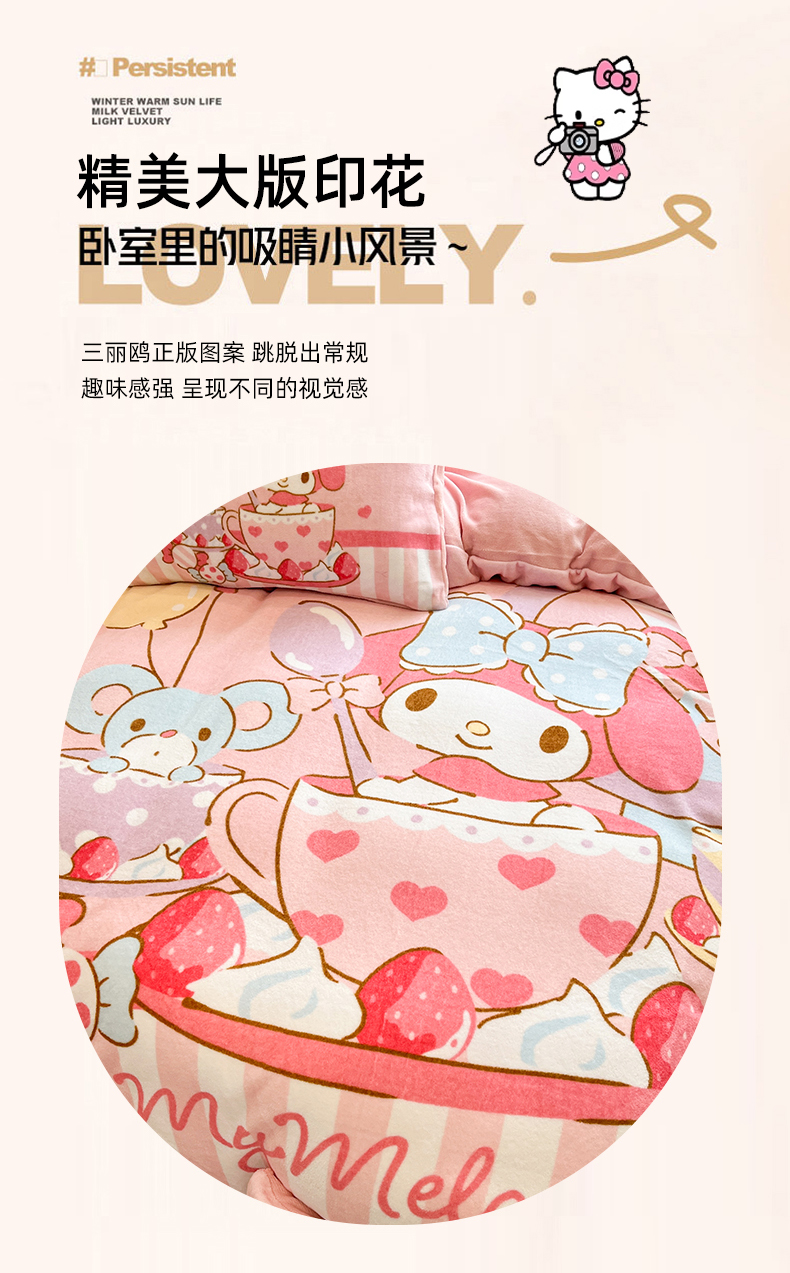 当前位置: 91家纺网 > 商品网购 > 床品套件 > 四件套 > 牛奶绒四件套 > 金爱家 2025新品正版三丽鸥授权大版卡通平网数码印花加厚高克重牛奶绒系列四件套 绒大版-开心美乐蒂