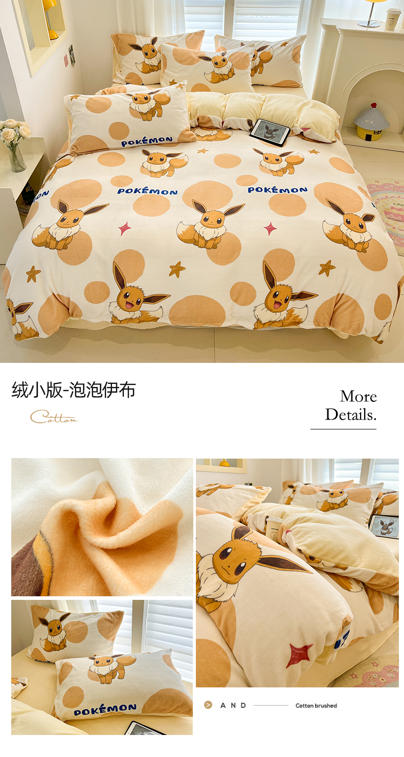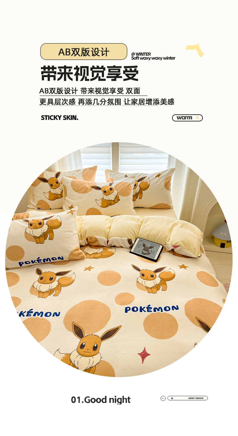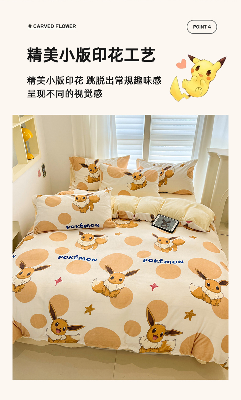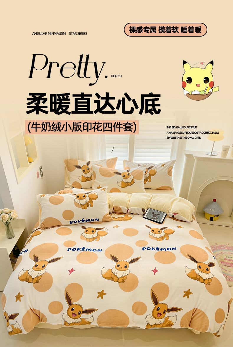 当前位置: 91家纺网 > 商品网购 > 床品套件 > 四件套 > 牛奶绒四件套 > 金爱家 2025新品大版卡通平网数码印花加厚高克重牛奶绒皮卡丘系列四件套 绒小版-泡泡伊布