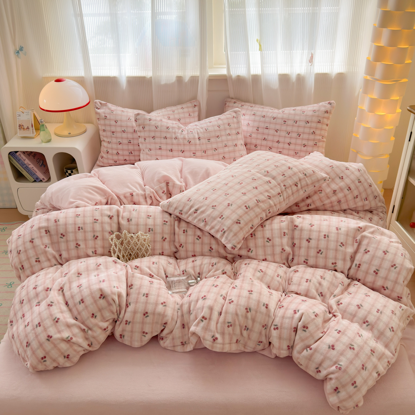 商品名称:德比尔斯 2025新款暗合印花牛奶绒四件套 粉格樱桃
