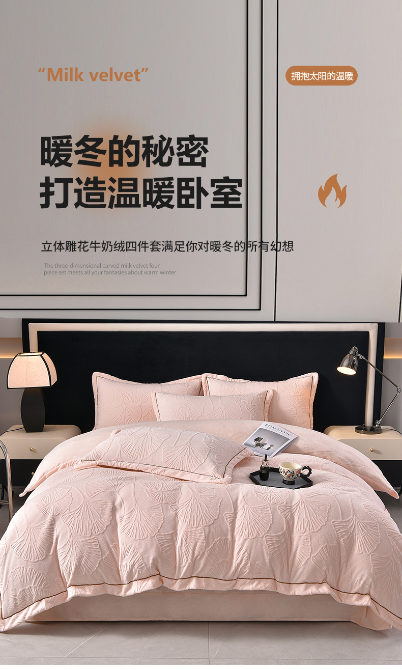 苏迪网销供货 2025新款牛奶绒四件套A类高克重全消光雕花一字绣工艺款 银杏叶-粉玉