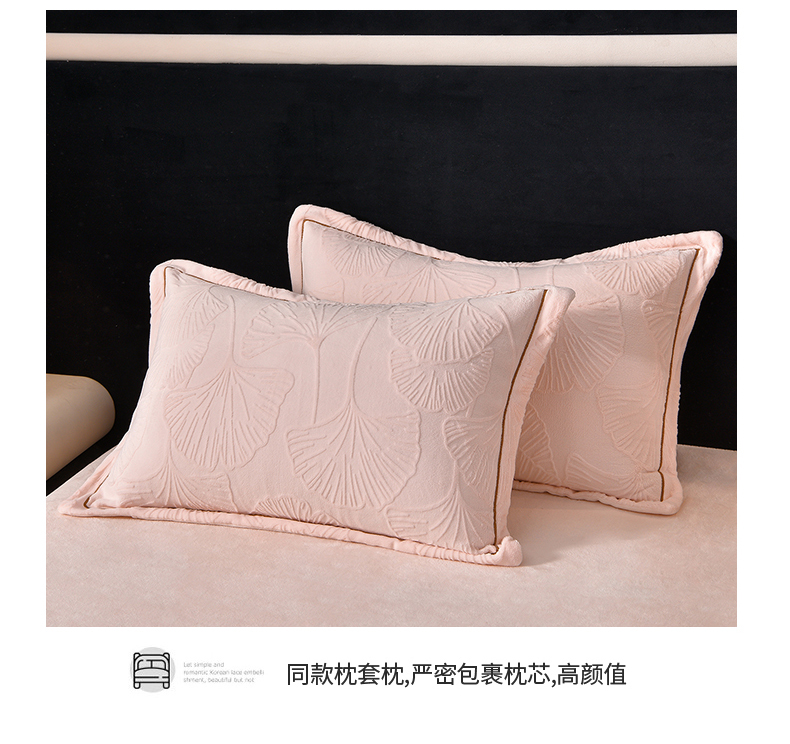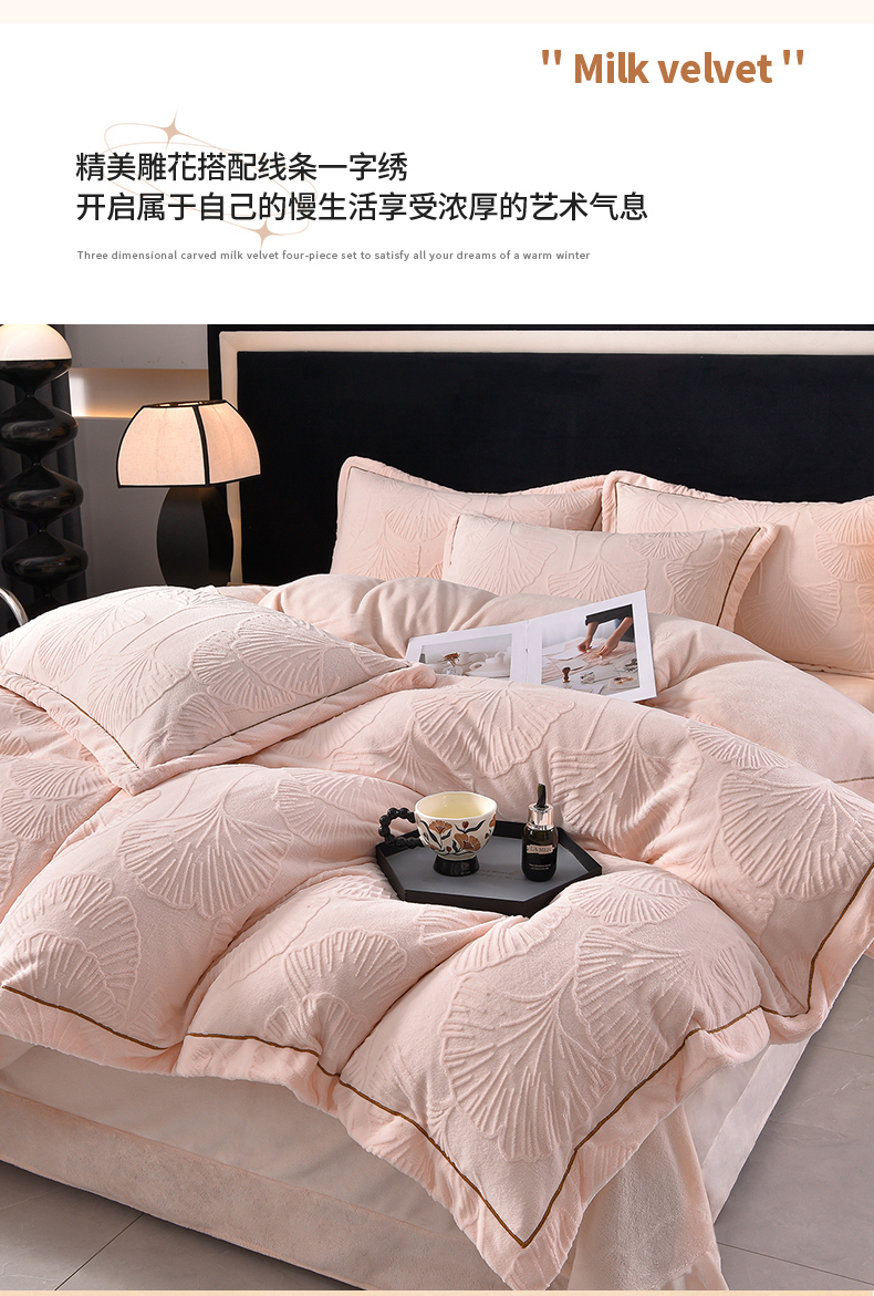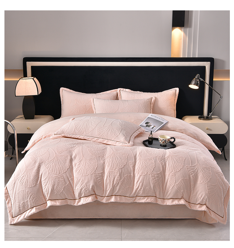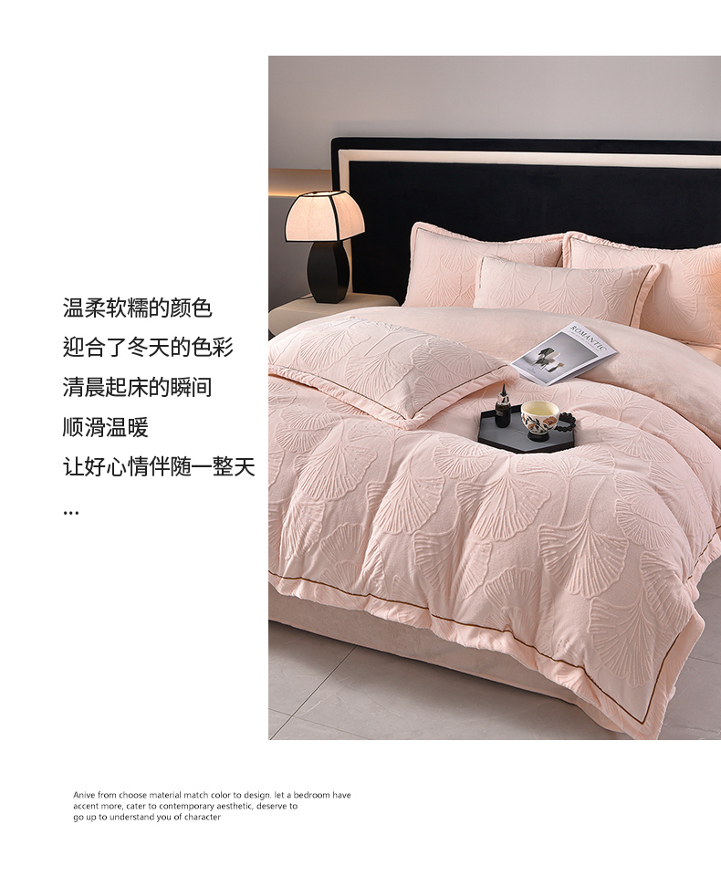 商品名称:苏迪网销供货 2025新款牛奶绒四件套A类高克重全消光雕花一字绣工艺款 银杏叶-粉玉