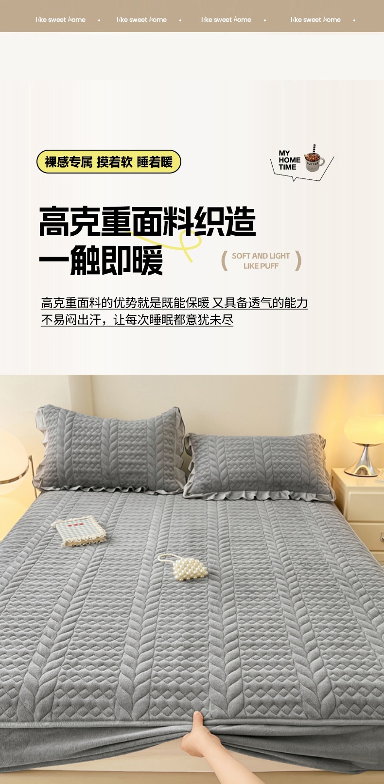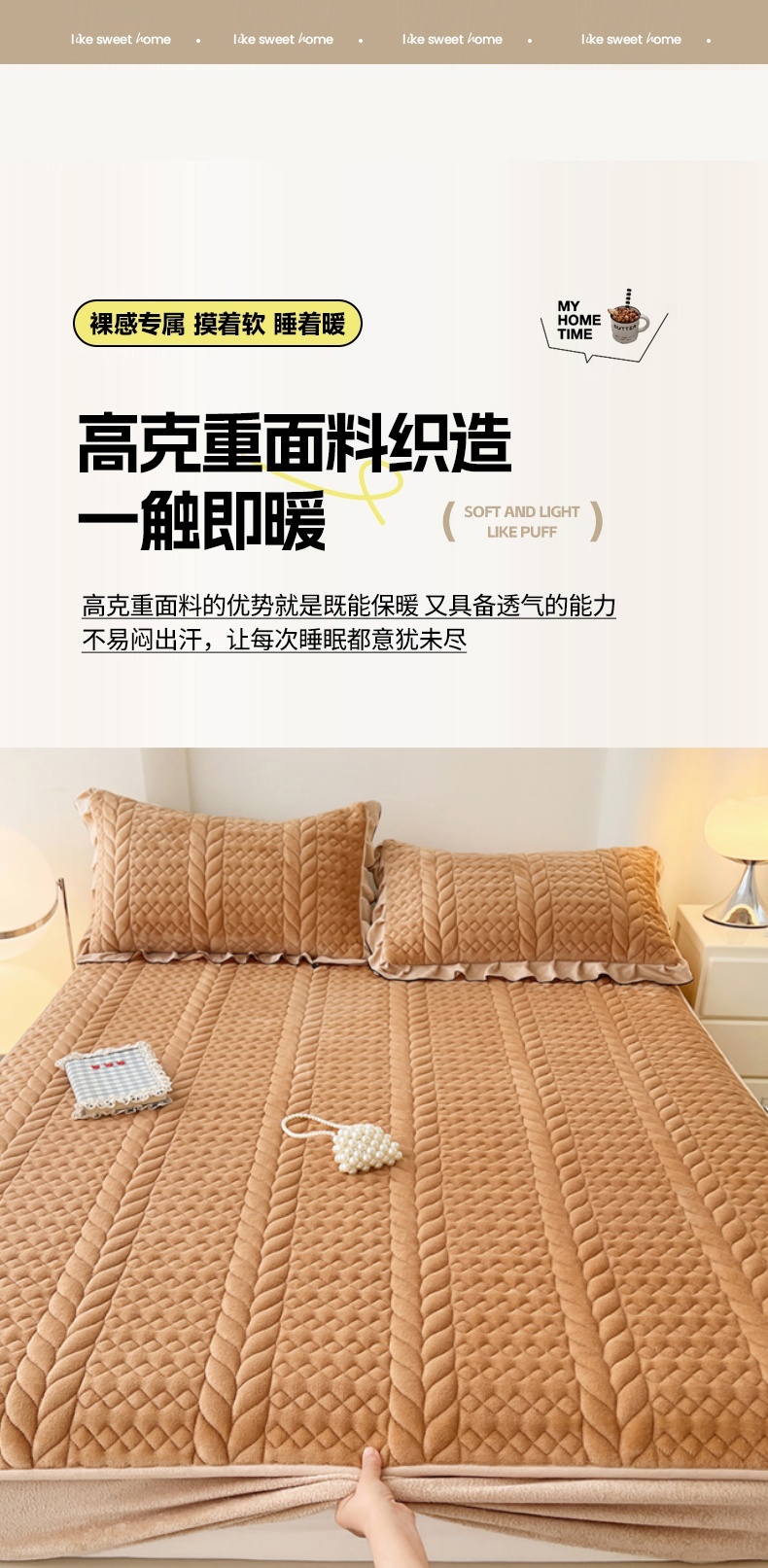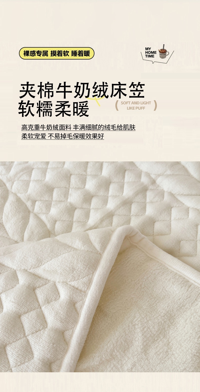商品名称:(总)圣比熊 2025新款牛奶绒夹棉床笠床单床盖床护垫保护罩三件套花边枕套-轻奢
