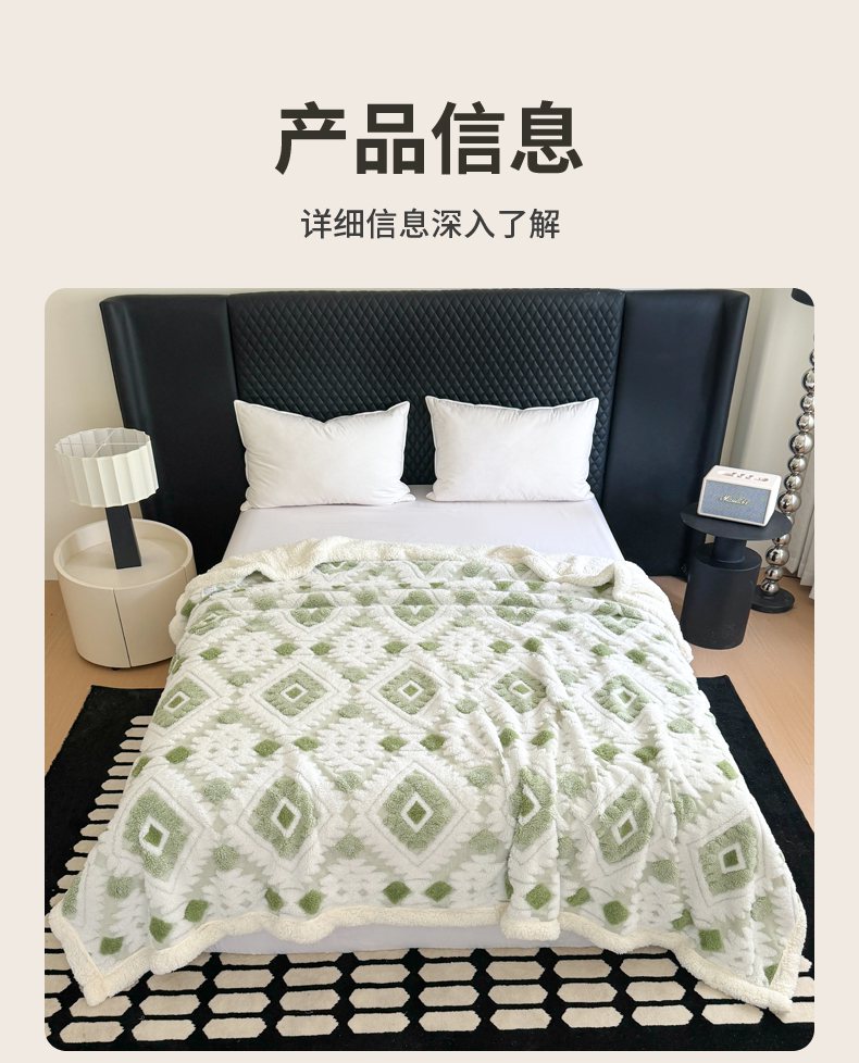 商品名称:梵克保罗 2025新款轻奢阳离子提花镂空塔芙绒羊羔绒保暖午睡双层毛毯办公室盖毯 浅绿