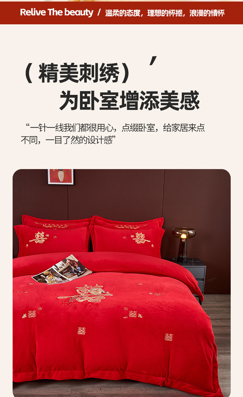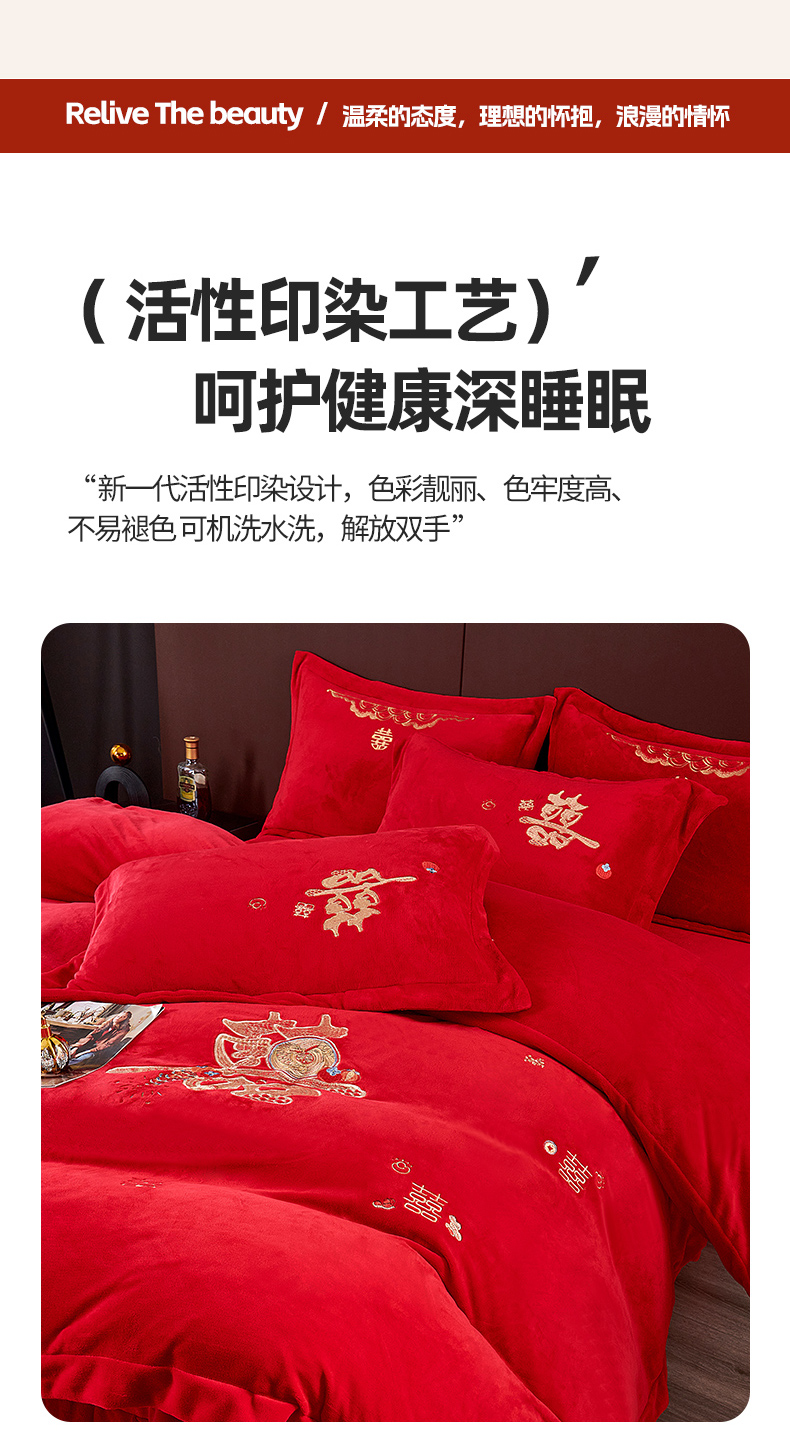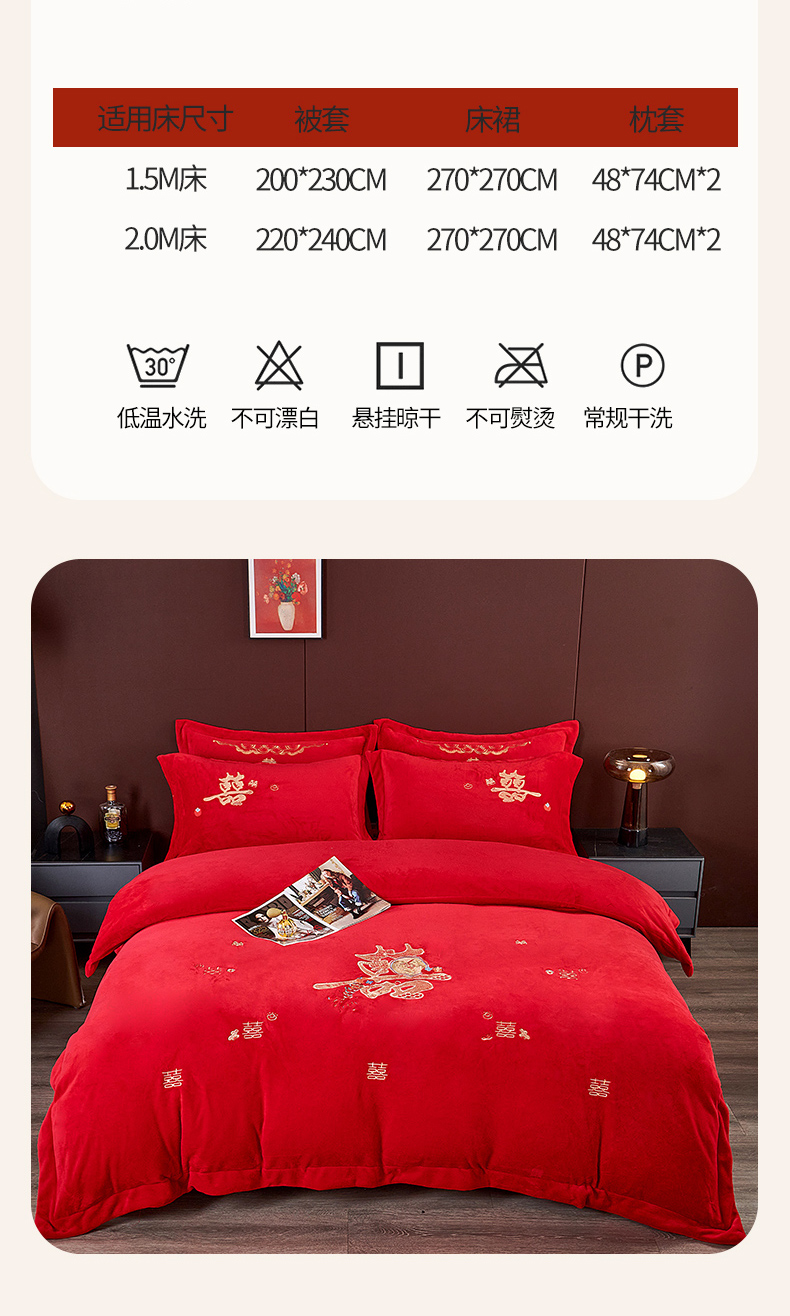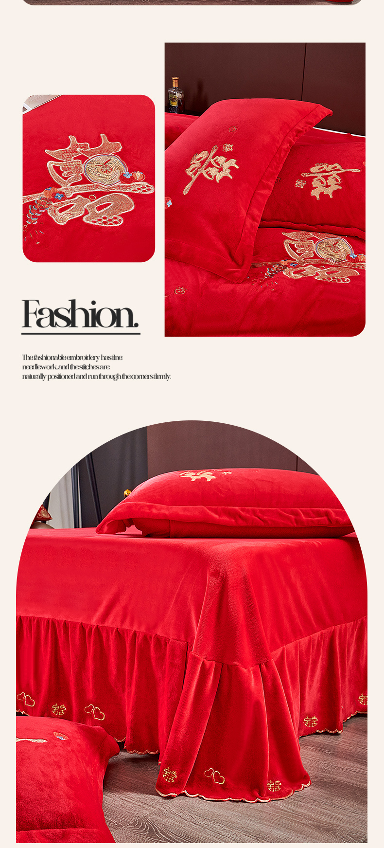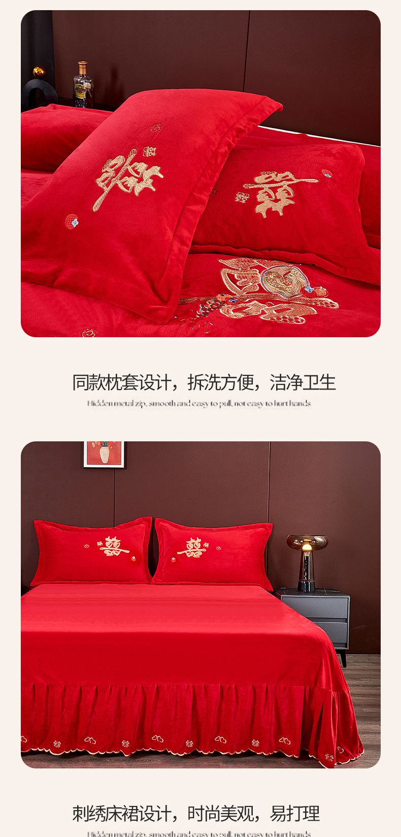 皇潮婚庆馆 2025新款婚庆牛奶绒刺绣床裙四件套系列 喜事连连