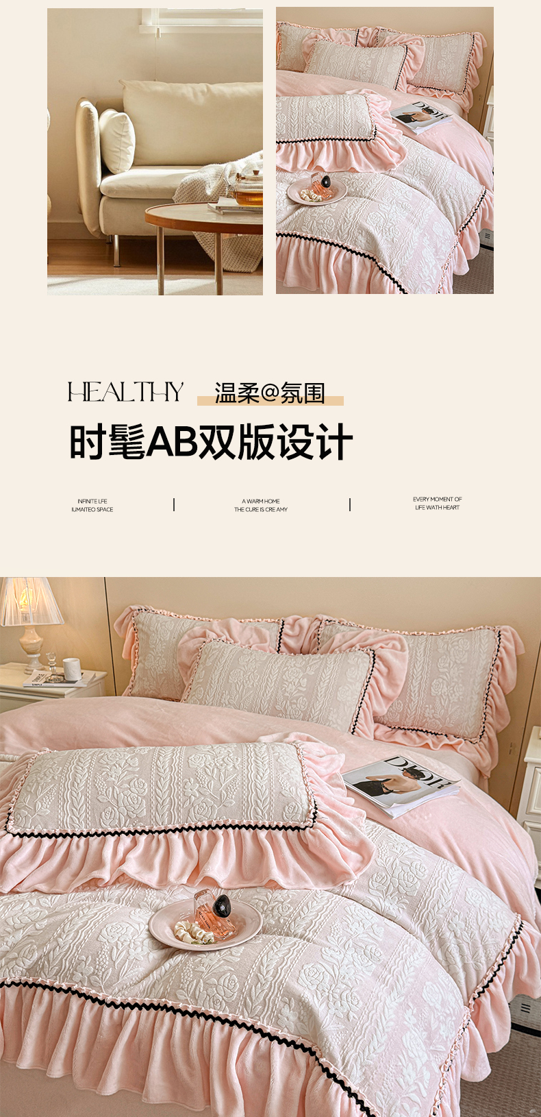 畅畅家纺 2025新款轻奢高档烂花牛奶绒花边款四件套 臻爱花园 -浅粉