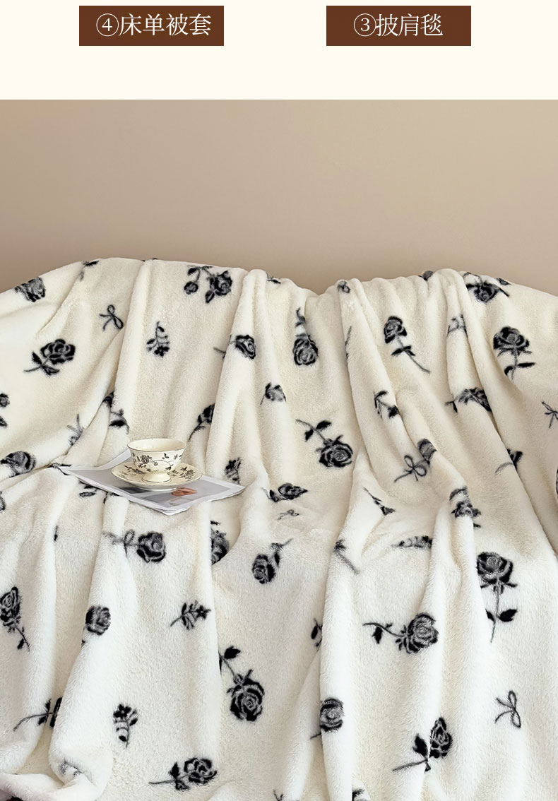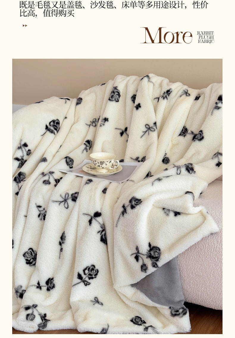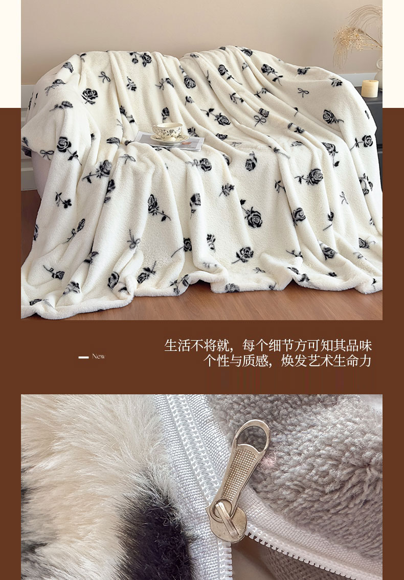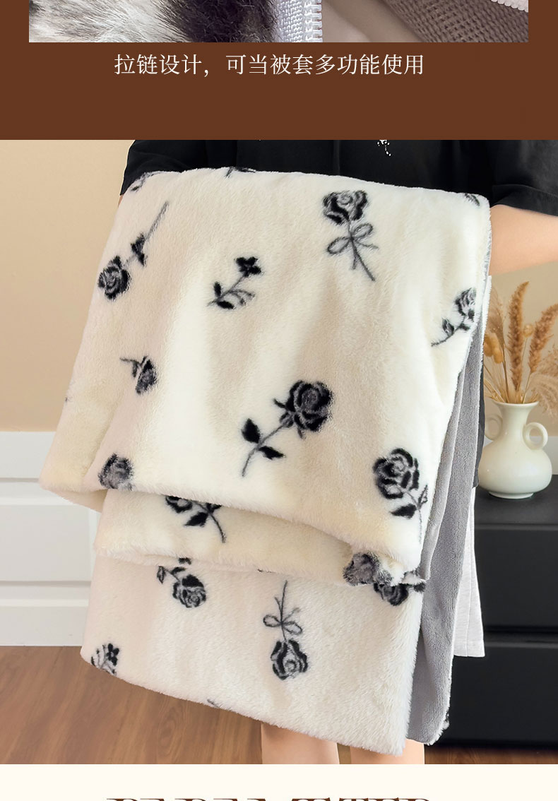 商品名称:璐维斯 2025新款A类兔毛绒双层多功能被套毯带拉链 卡通花卉牛奶绒毛毯秋冬保暖毯子盖毯 玫瑰白