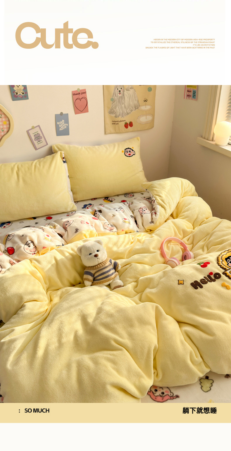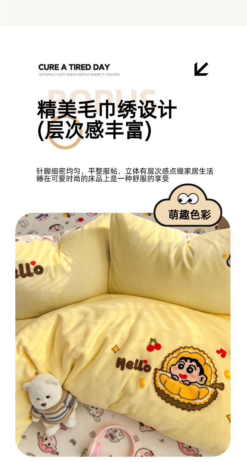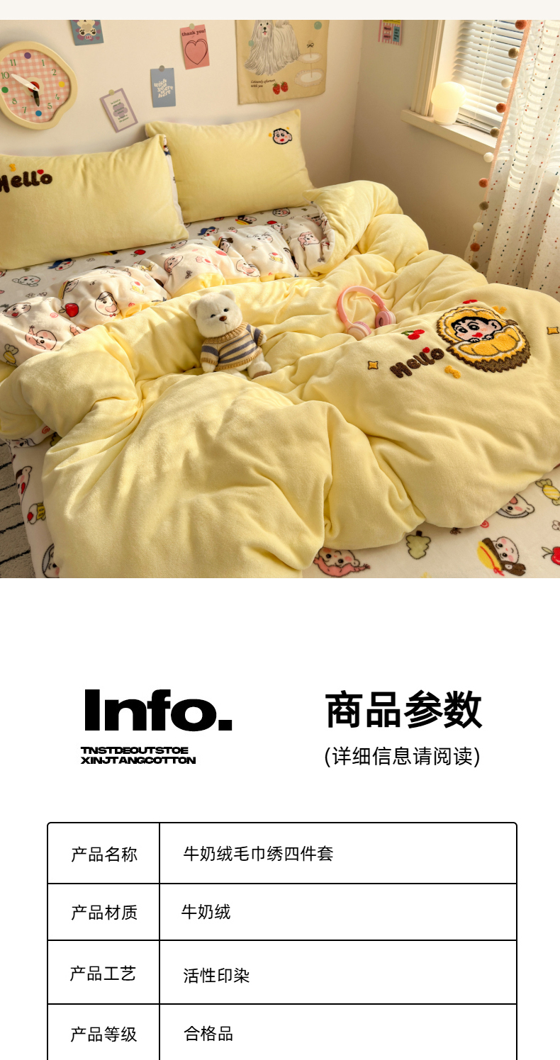 当前位置: 91家纺网 > 商品网购 > 床品套件 > 四件套 > 牛奶绒四件套 > 三元色 2025新款牛奶绒绣花毛巾绣四件套 牛奶绒榴莲小新