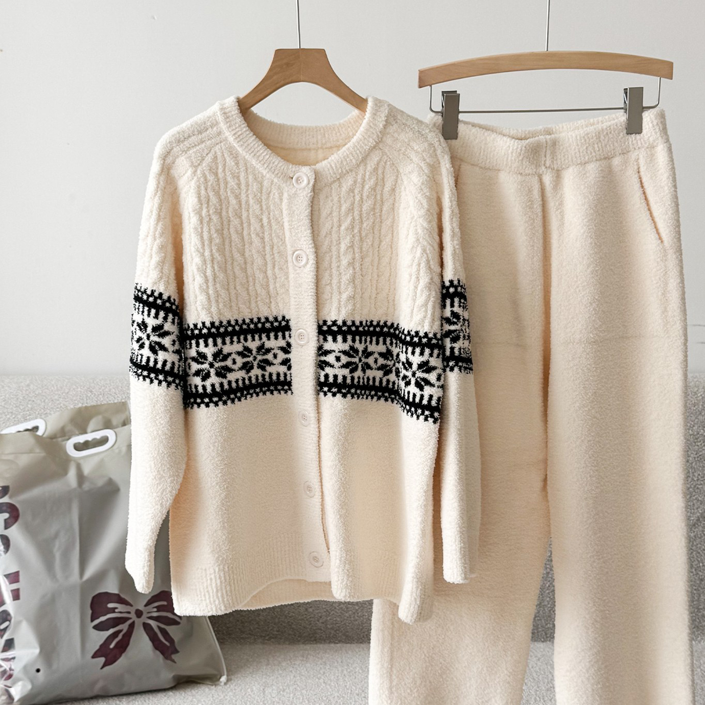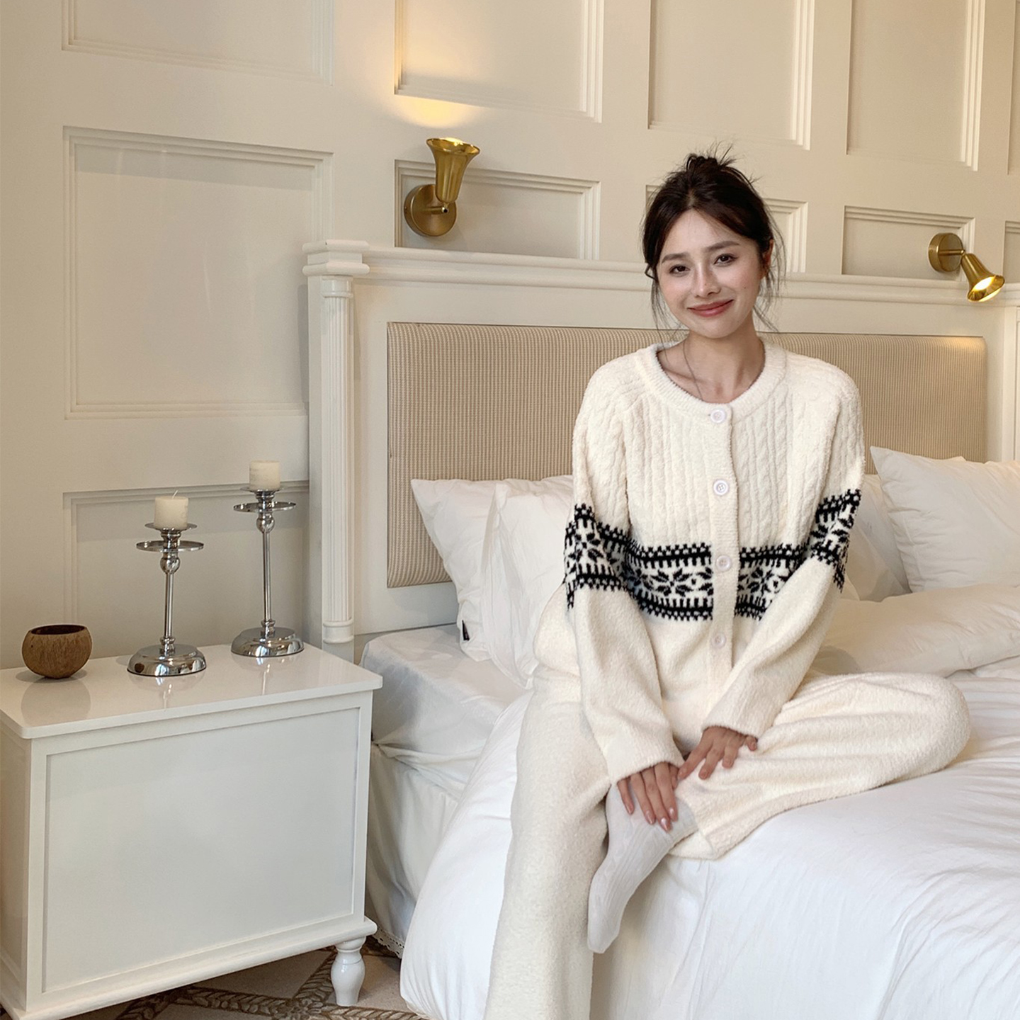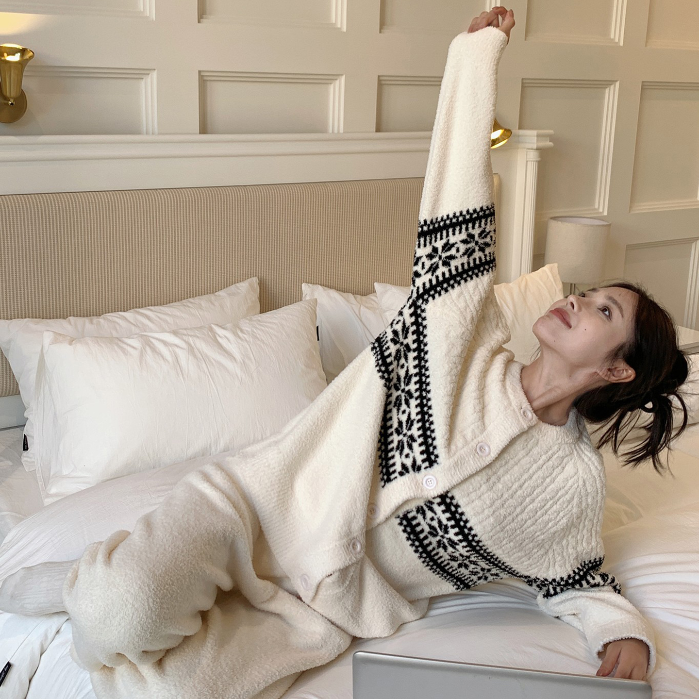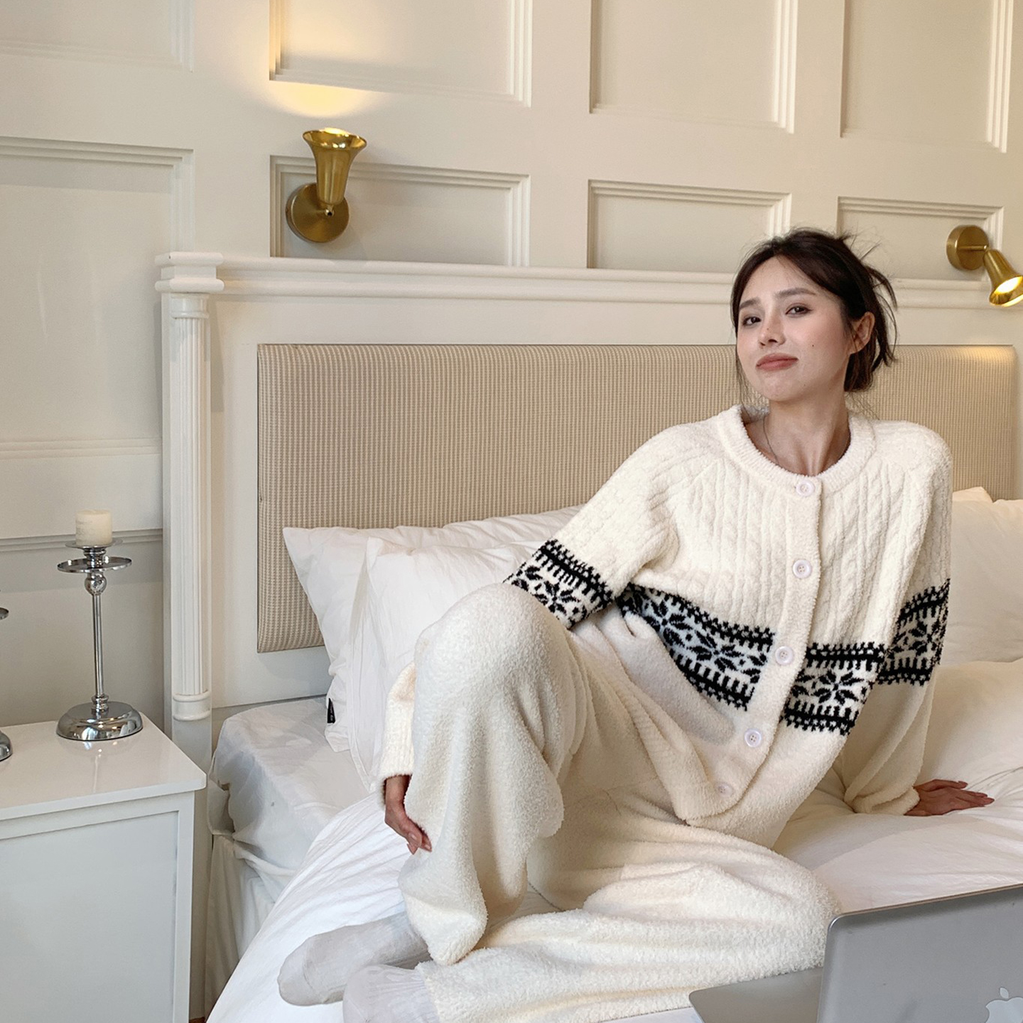 (总)妍景家居生活馆 2025新款韩系双面舒棉绒圆领蝴蝶结套装,白色