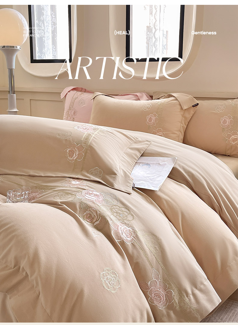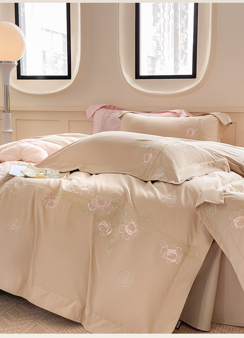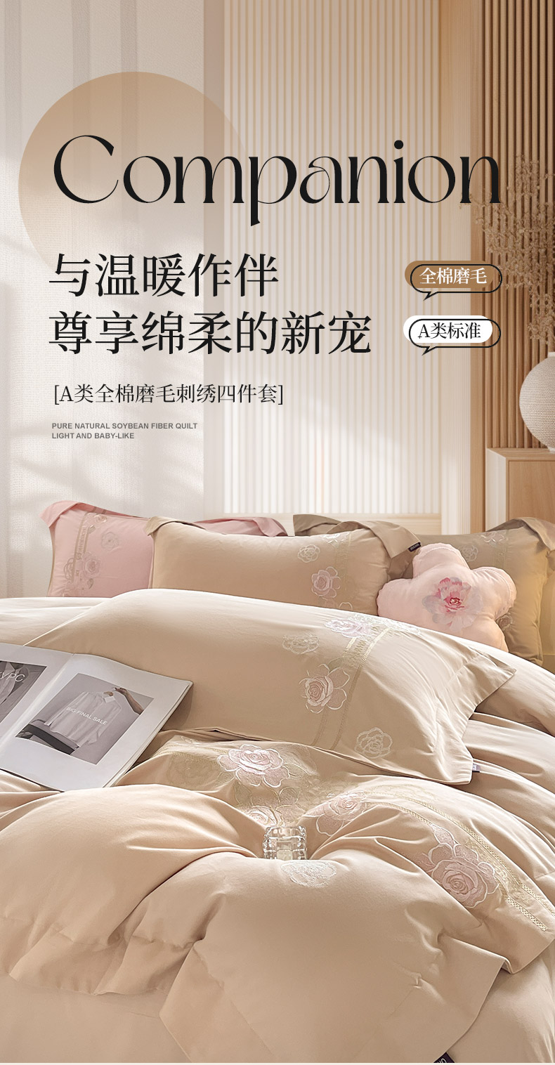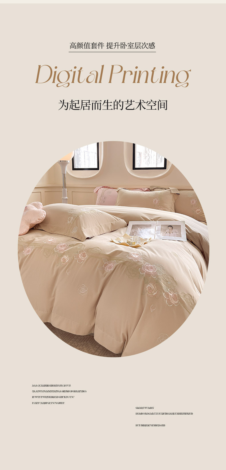 商品名称: 秋冬季爆款A类加厚保暖全棉磨毛四件套纯棉被套重工刺绣床笠款轻奢高端床上用品 温莎-拿铁